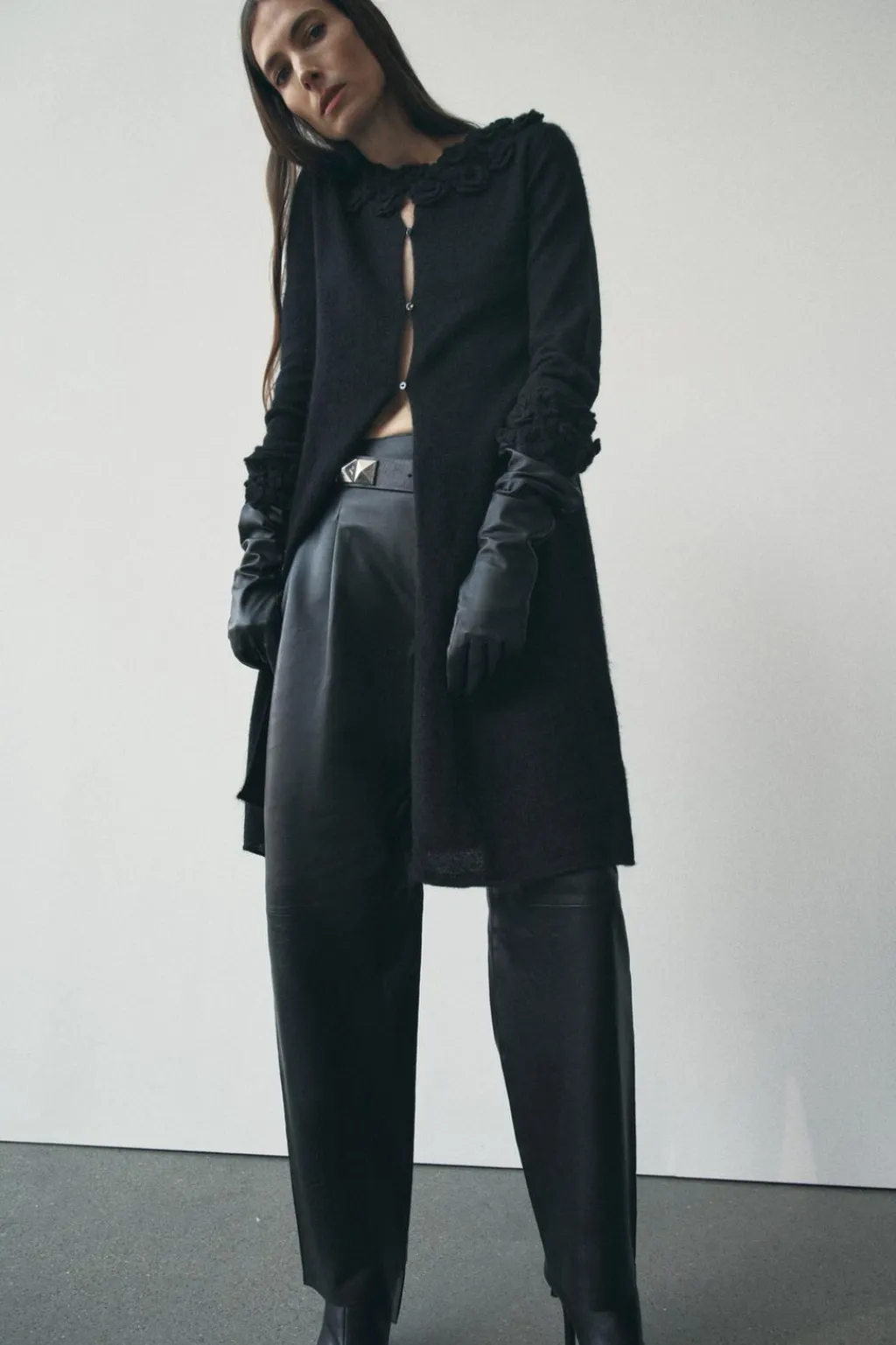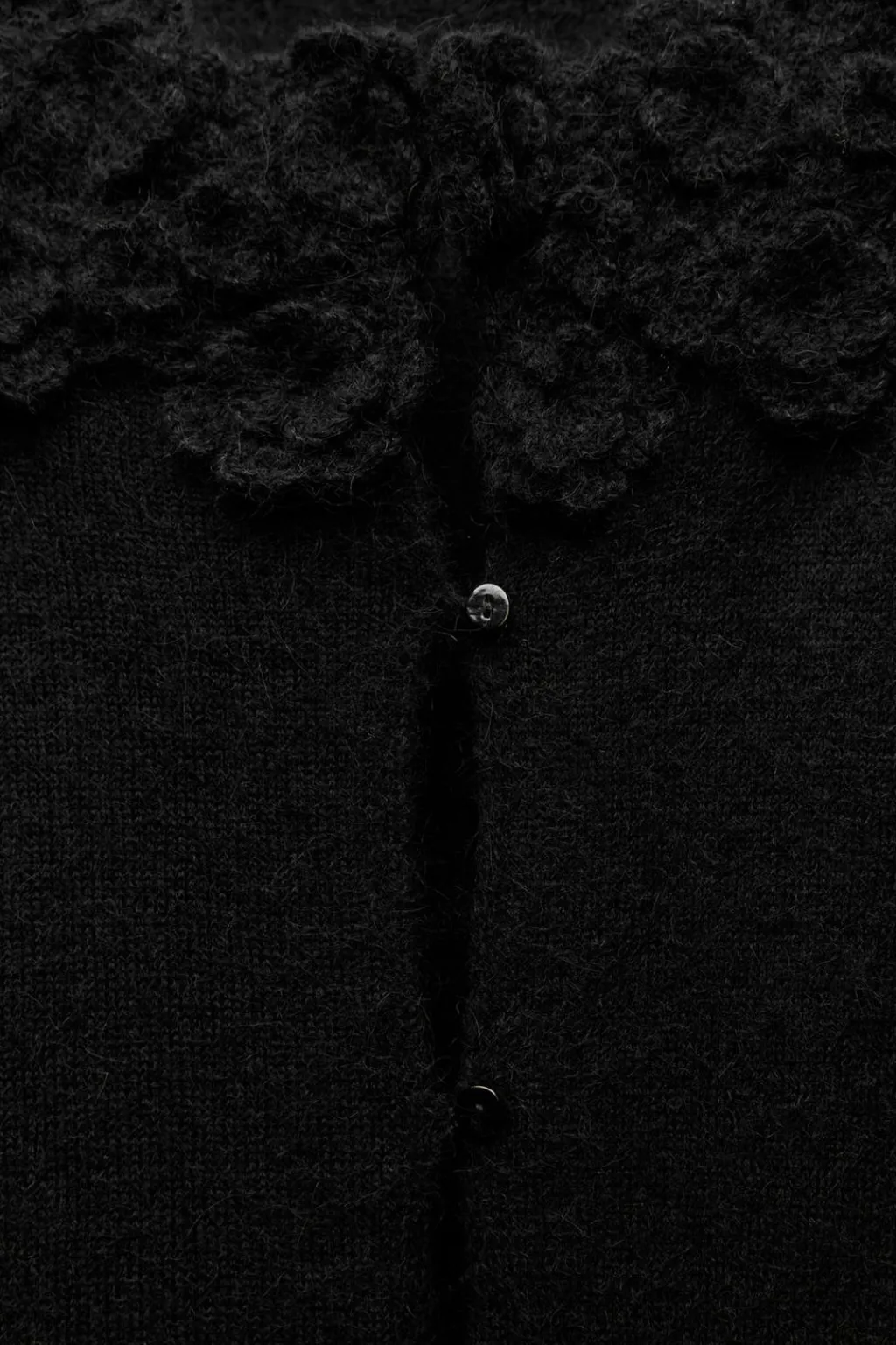 Chaqueta de cuello redondo y manga larga. Detalle de acabados con flores en crochet a tono. Cierre frontal con botones.