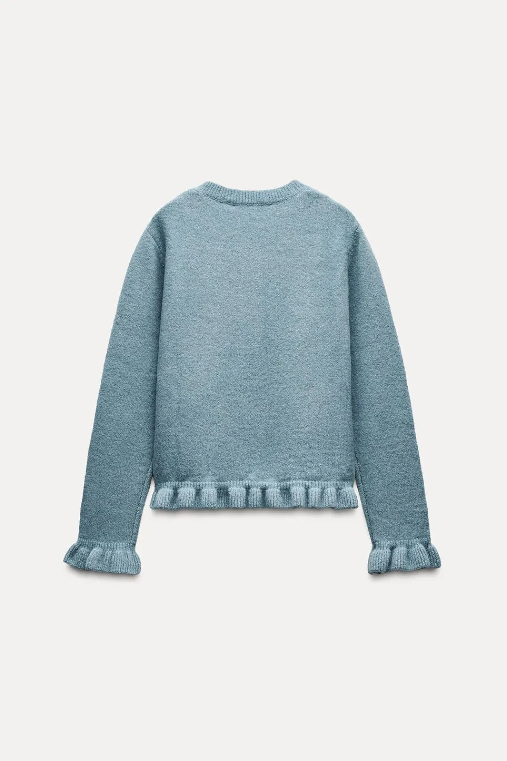 Chaqueta de cuello redondo y manga larga. Detalle de acabados con volantes. Cierre frontal con botones.