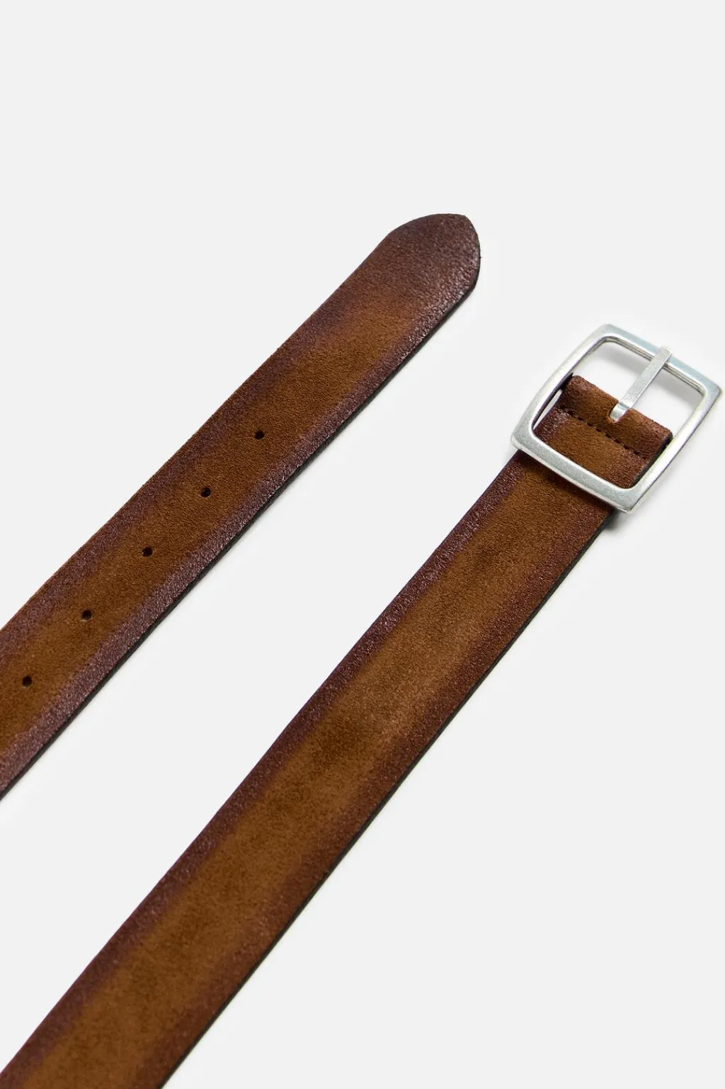 Cinturón confeccionado en piel con acabado serraje. Cierre con hebilla metálica y pasador.