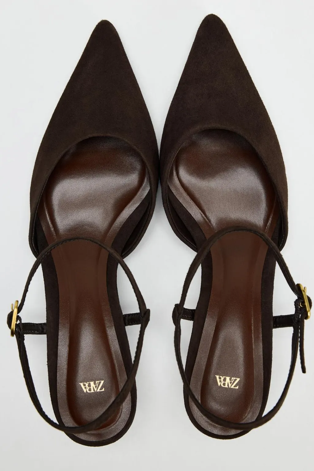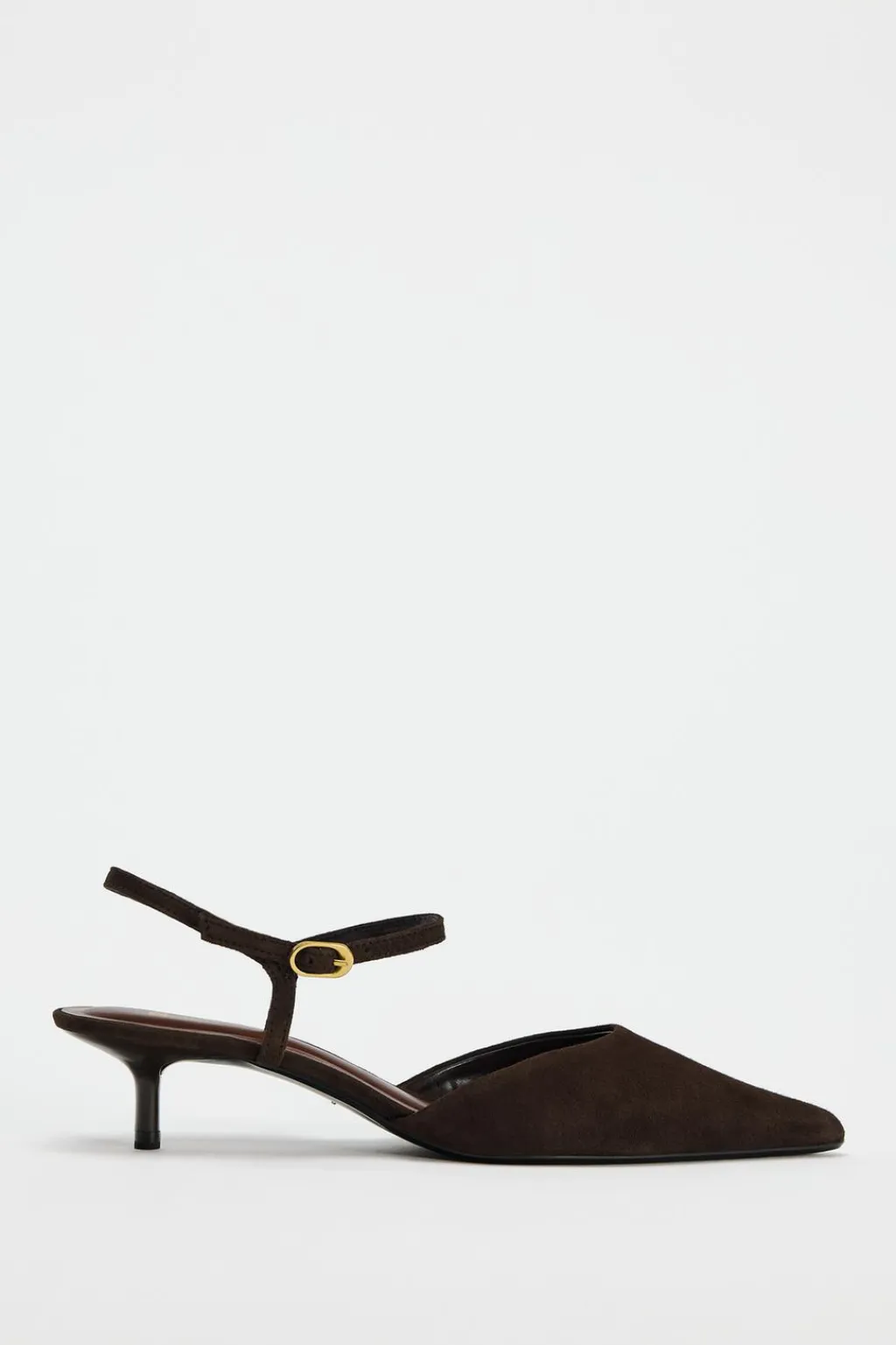Zapato tipo destalonado en ante. Tacón kitten. Cierre mediante hebilla en la pulsera al tobillo. Acabado en punta.