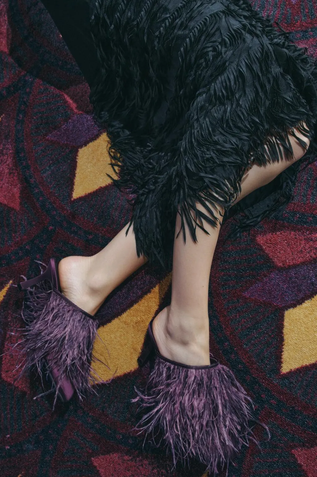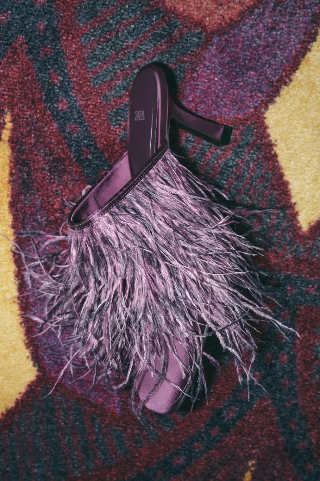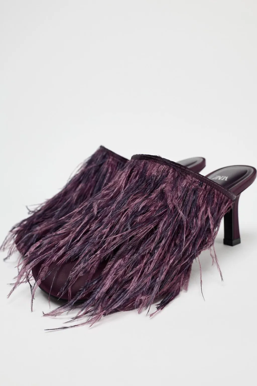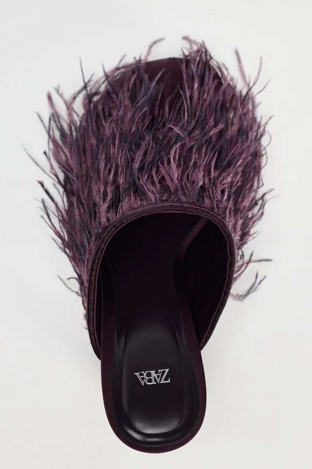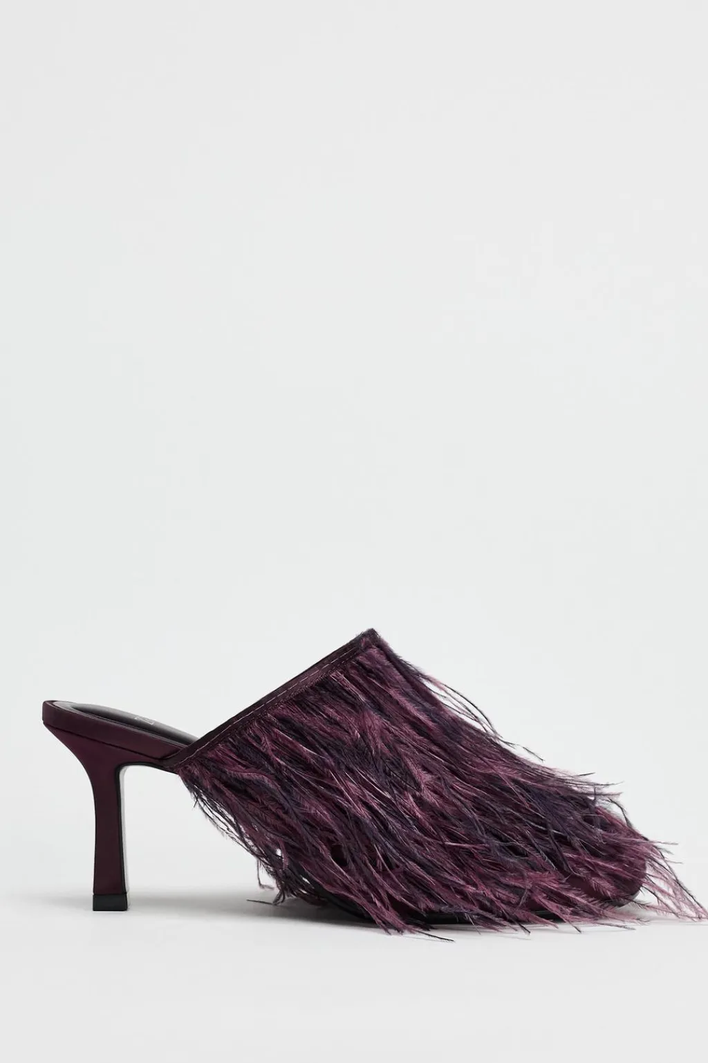 Zapato tipo destalonado con efecto satinado. Tacón fino. Detalle de plumas en la parte delantera. Acabado en punta redonda.