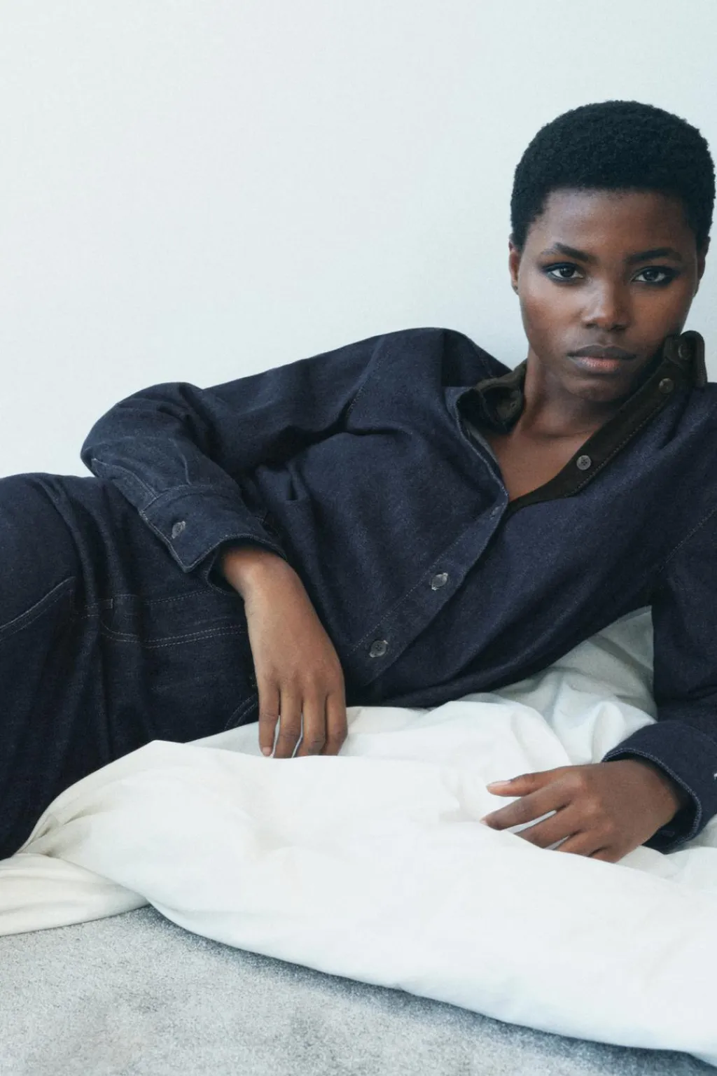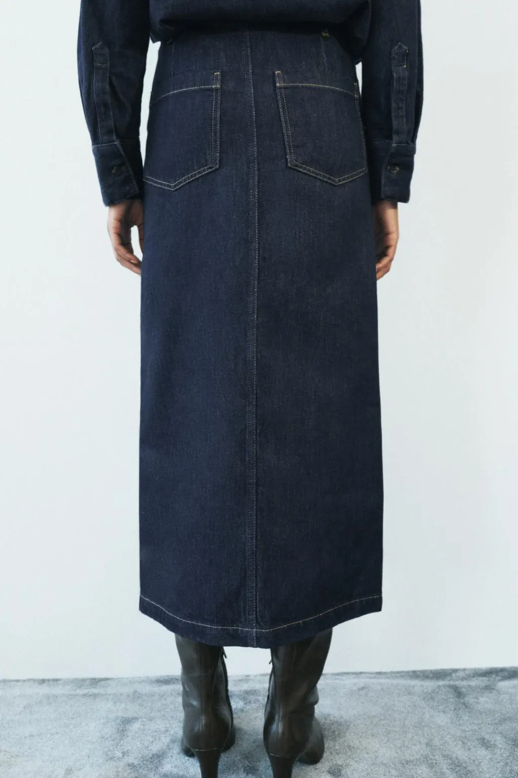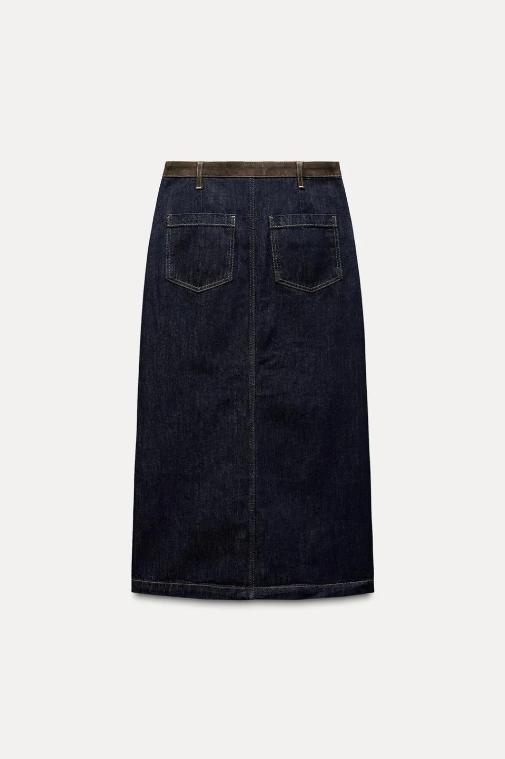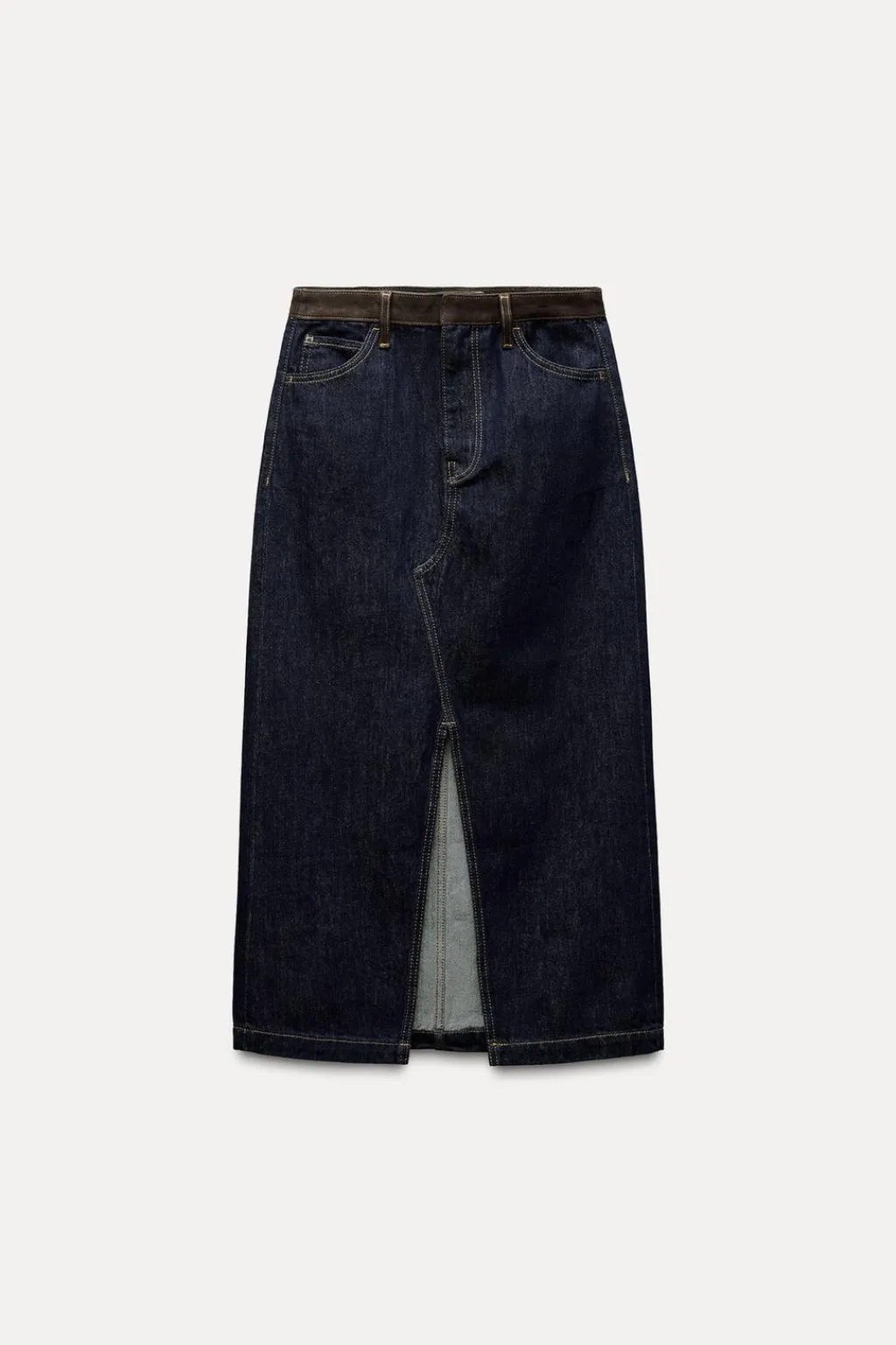 Falda midi de tiro medio y cintura en tejido con piel de ante a contraste. Cinco bolsillos. Detalle de pespuntes marcados. Bajo acabado con abertura. Cierre frontal con cremallera, botón y gancho metálico.