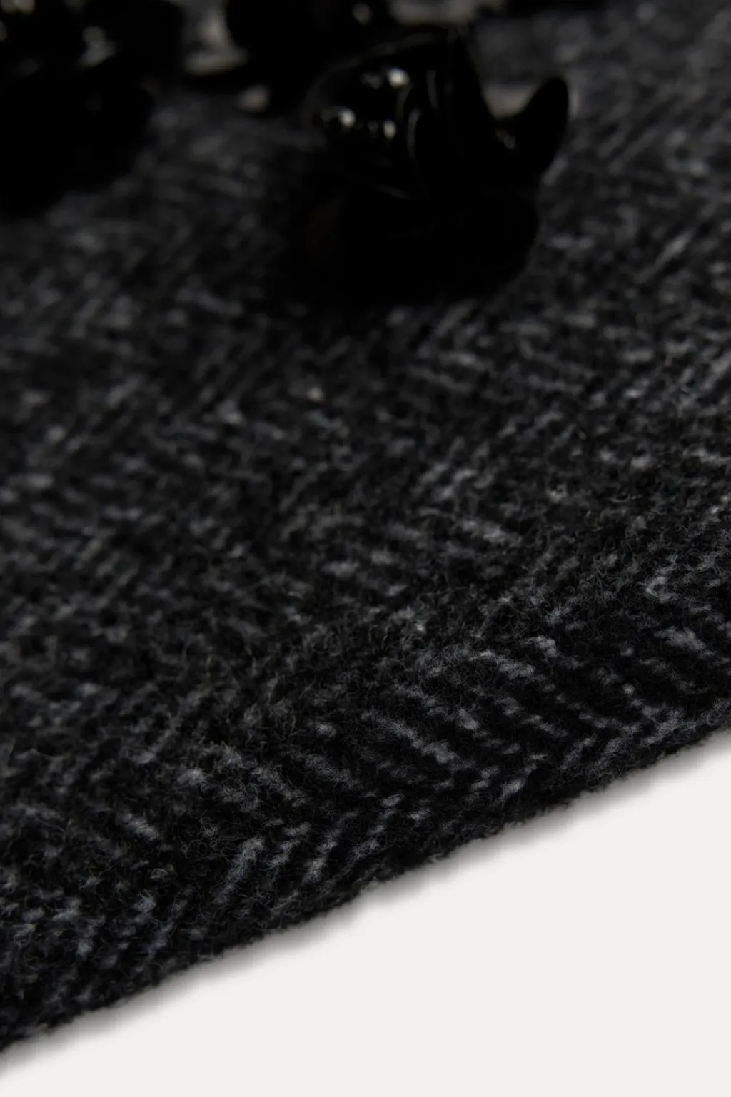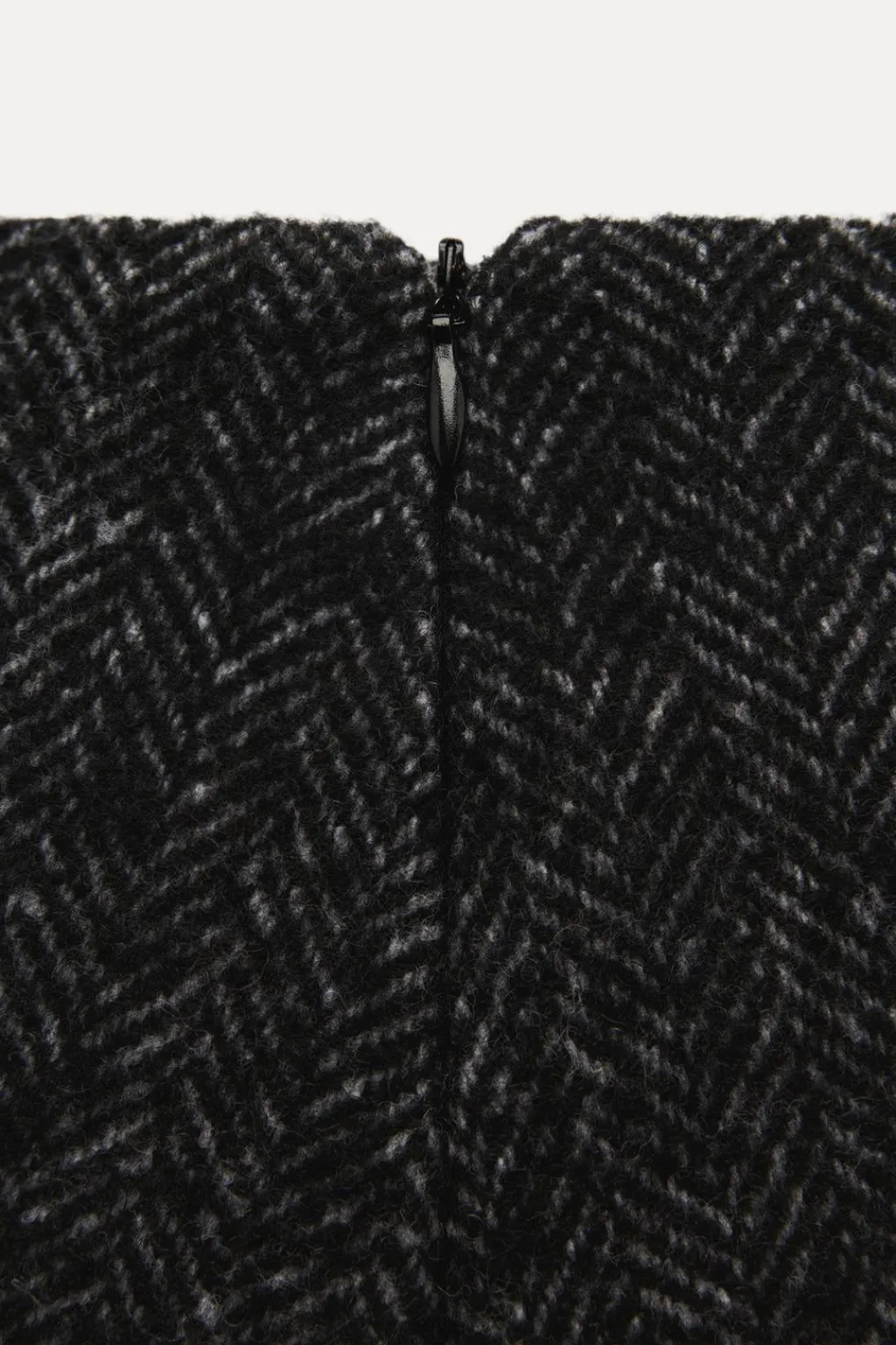 Falda corta de tiro medio confeccionada en hilatura con lana 32%. Detalle de bordados con aplicación de abalorios a tono y tejido en espiga. Cierre lateral con cremallera oculta en costura.