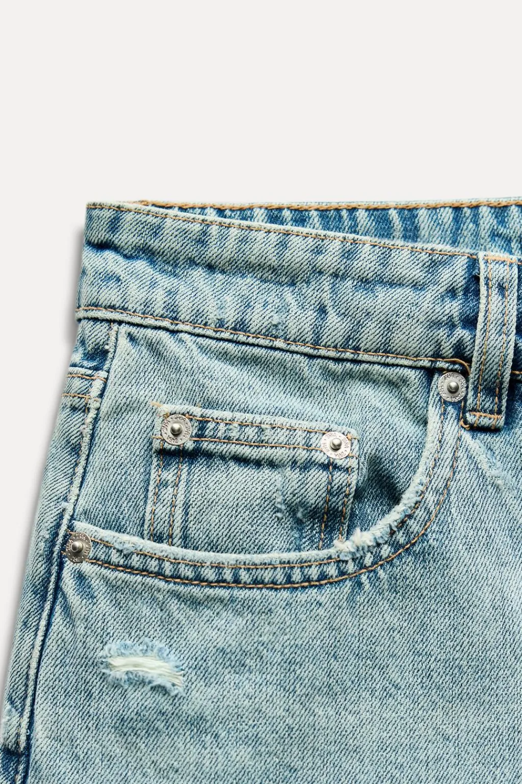 Falda mini de tiro medio con trabillas y cinco bolsillos. Detalle de rotos. Cierre frontal con botones metálicos.