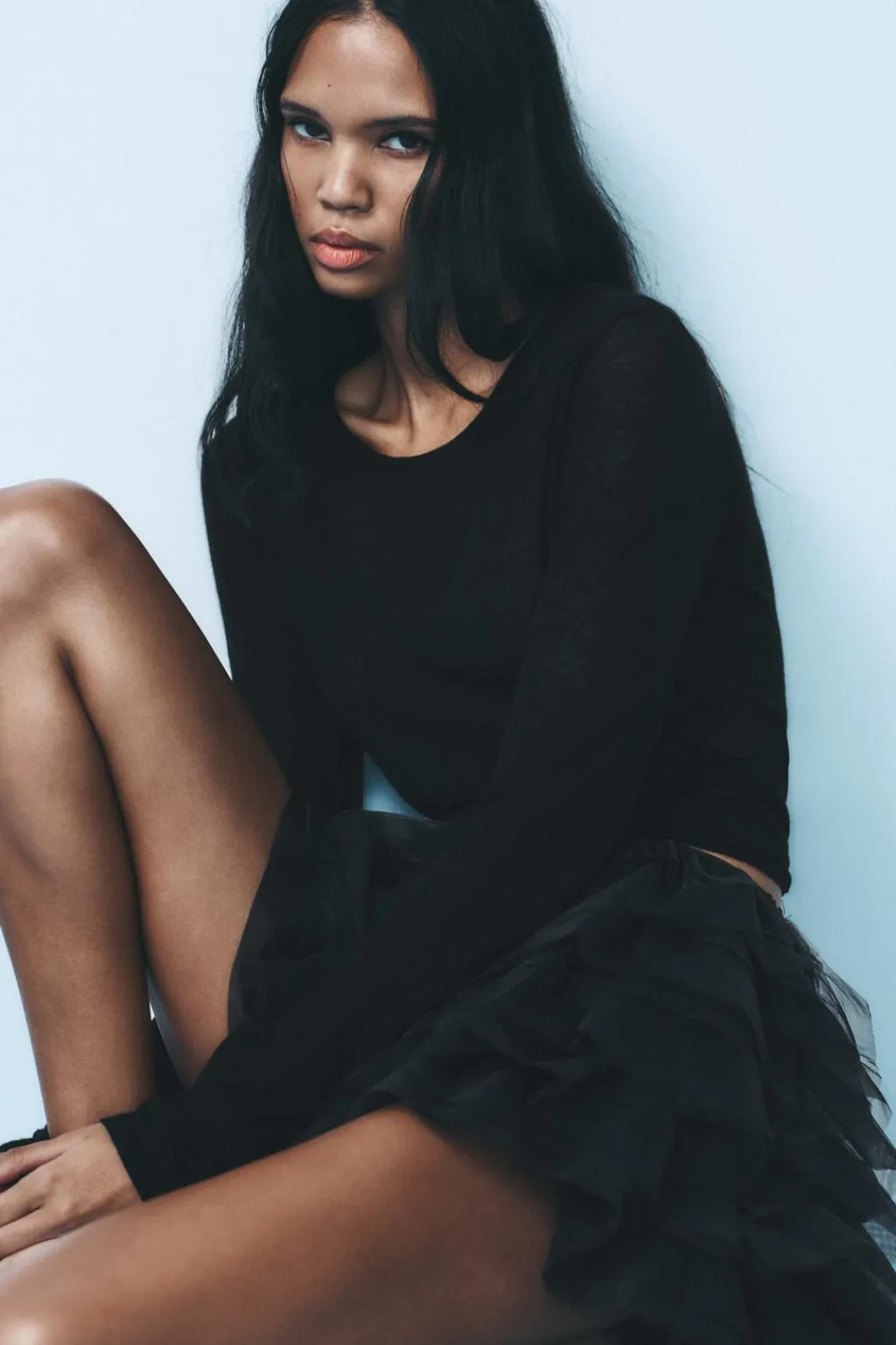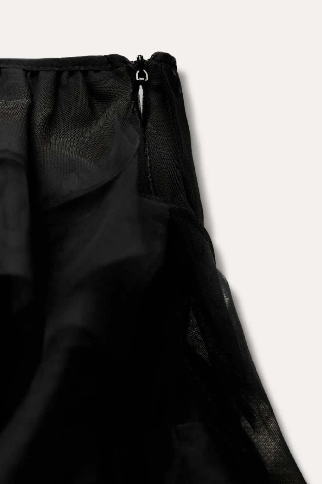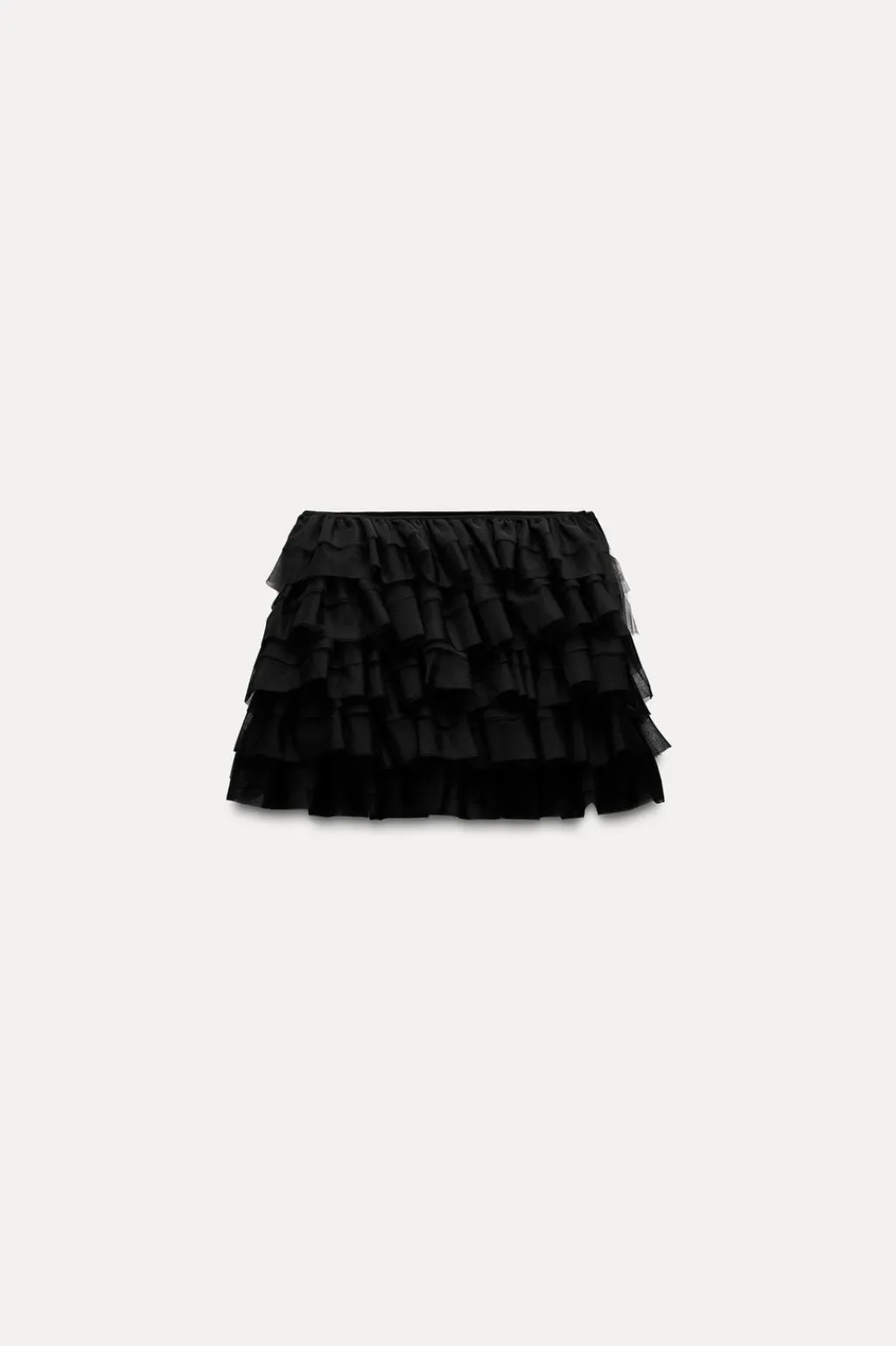 Falda mini de tiro medio con cintura elástica. Volantes combinados en tul. Forro interior tipo shorts.