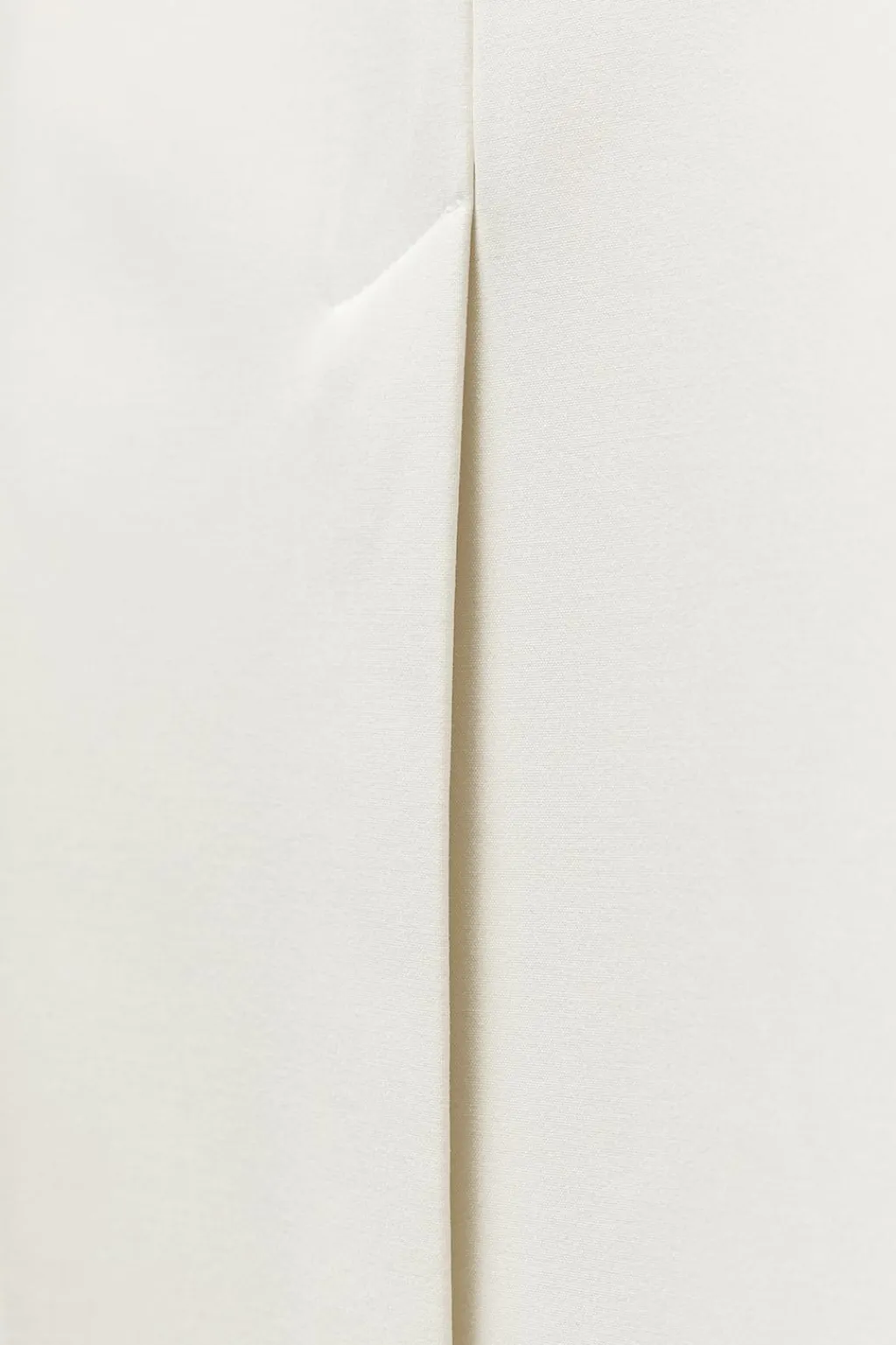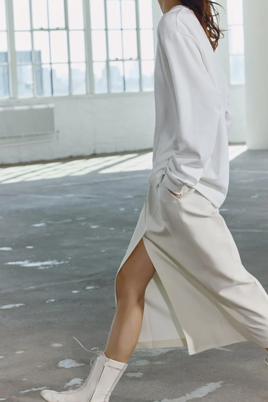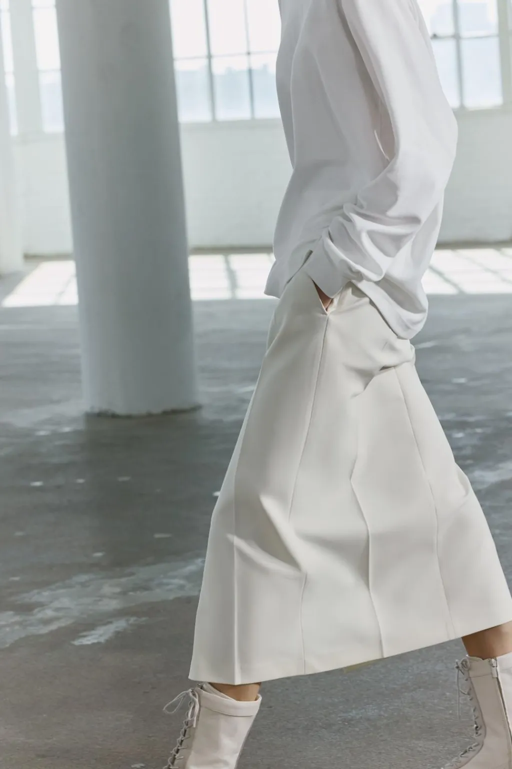 Falda recta de tiro medio y cintura con trabillas. Bolsillos delanteros. Bajo acabado en abertura. Cierre lateral con cremallera oculta en costura.