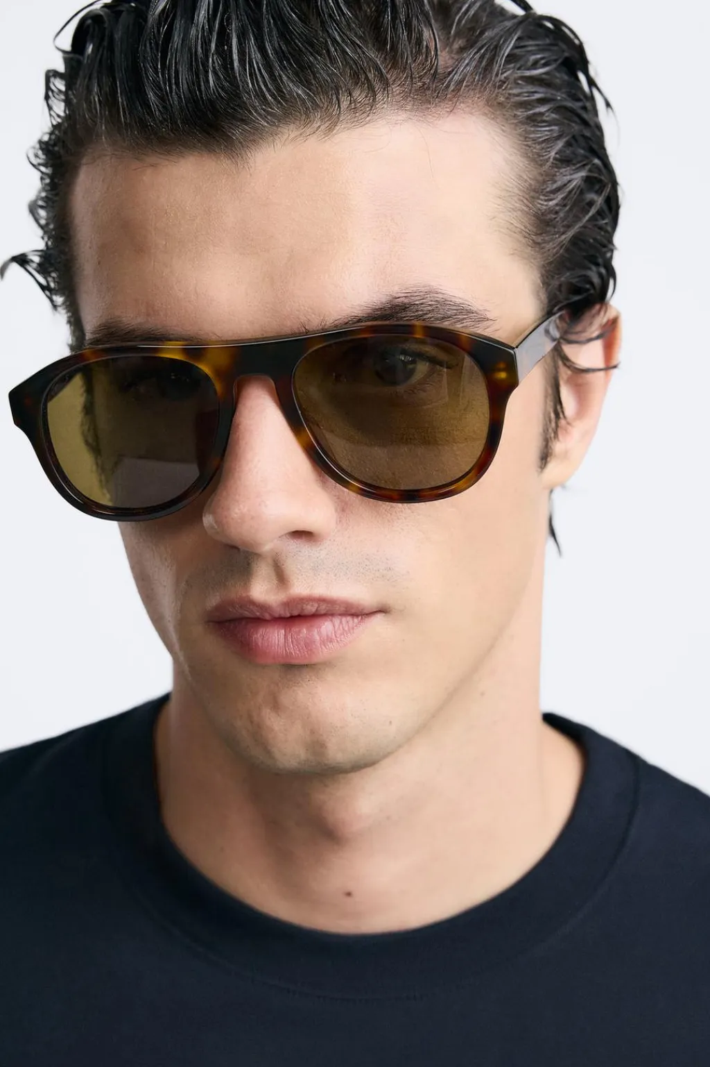 Gafas de sol con montura ovalada en acetato efecto carey. Lentes polarizadas. Incluye funda.