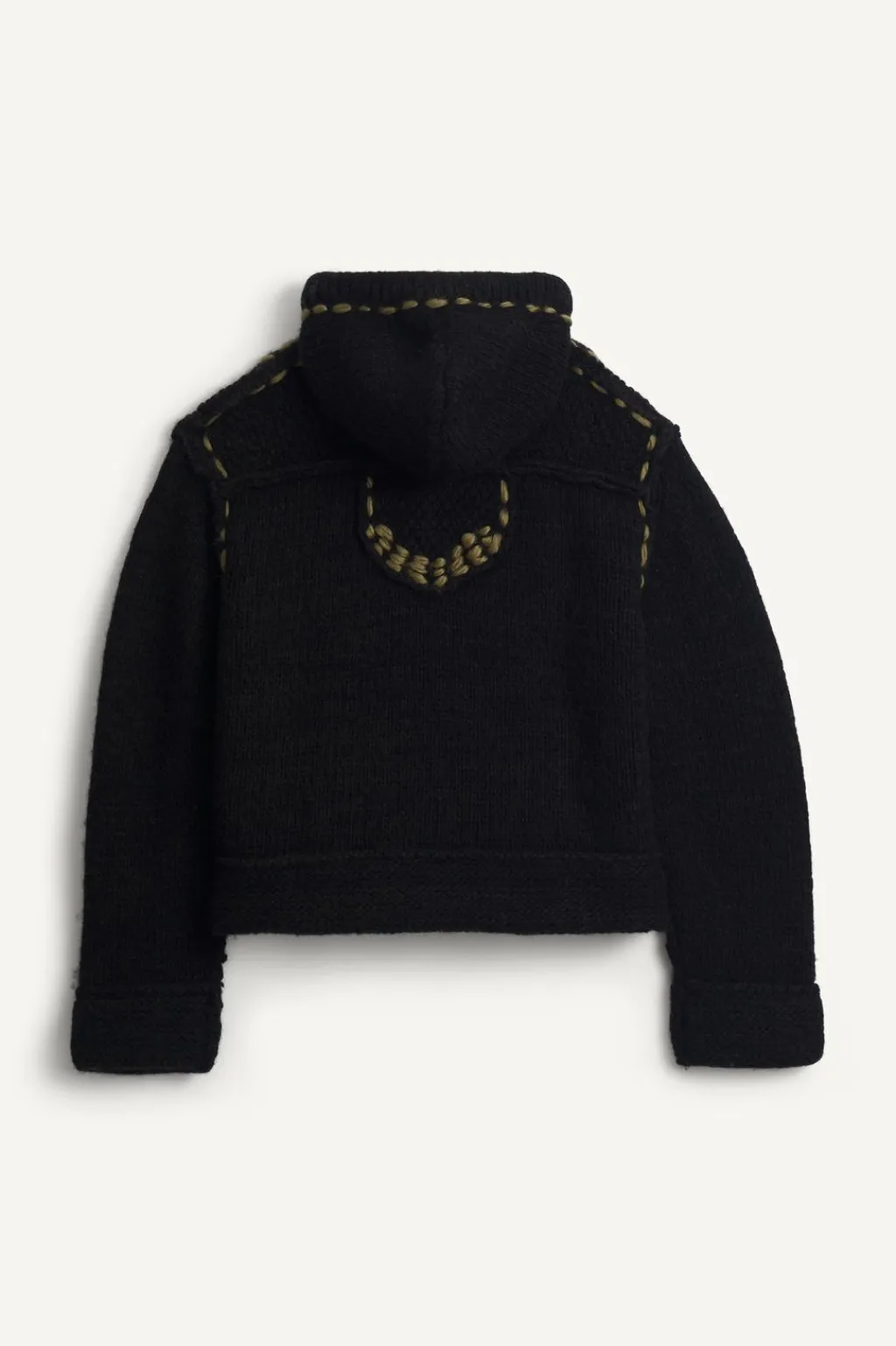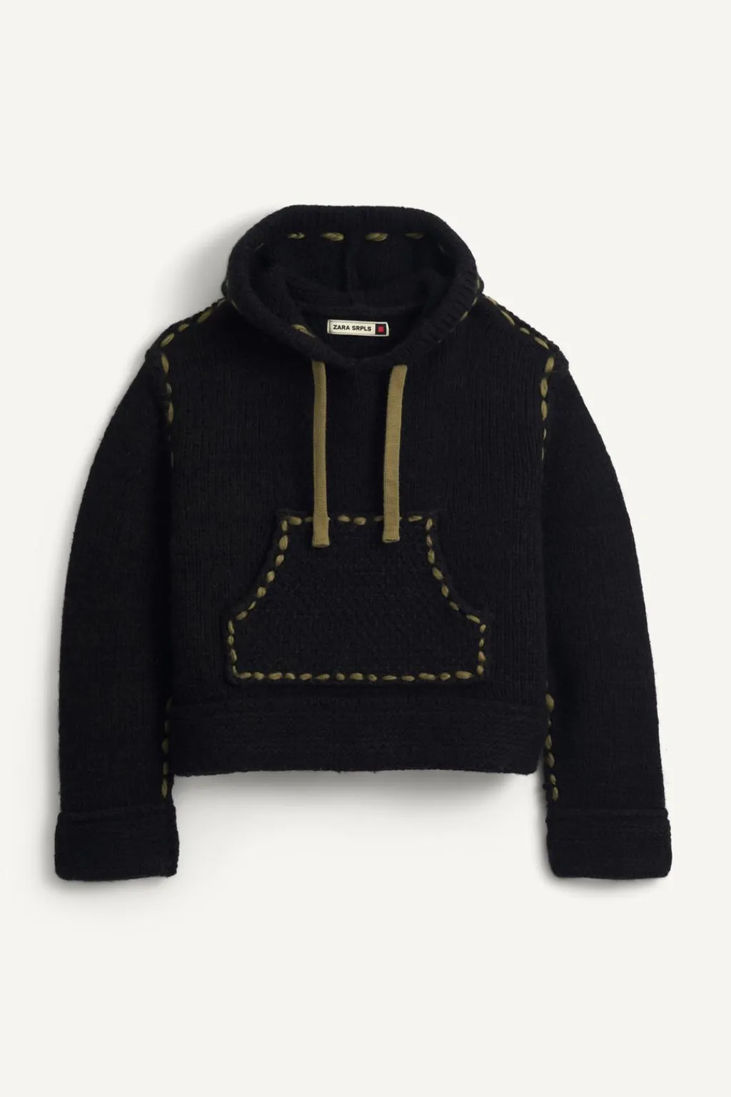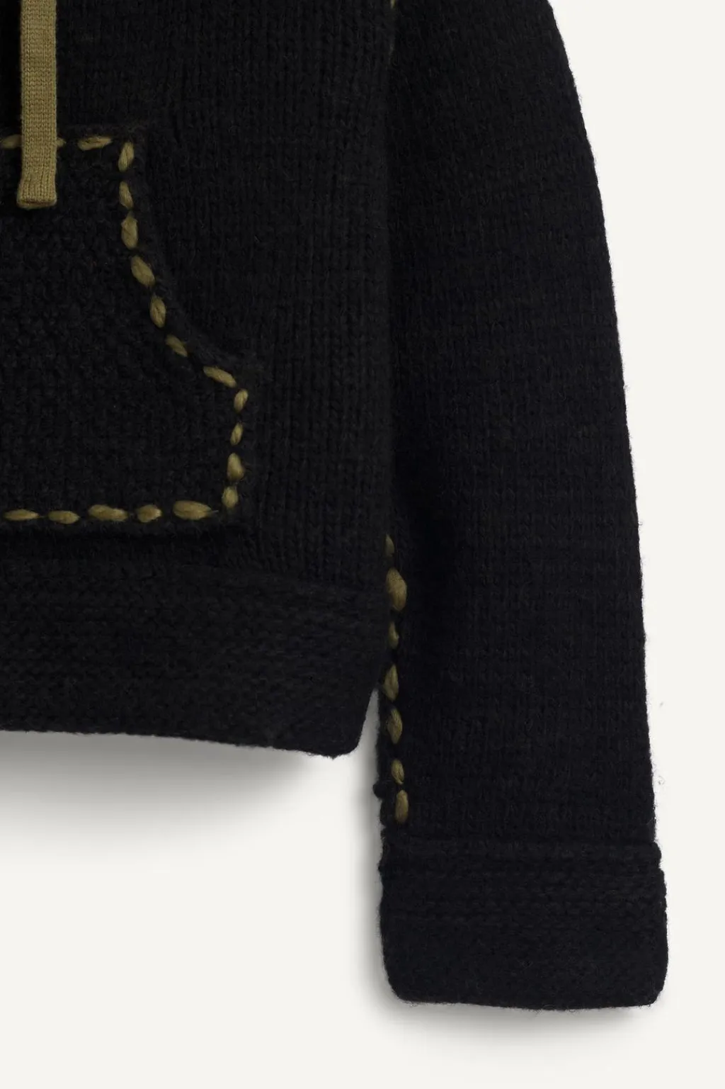 Sudadera cropped fit de punto tejido en hilatura de lana. Cuello con capucha ajustable y manga larga. Bolsillo frontal tipo canguro. Detalle de pespuntes combinados a contraste en toda la prenda.