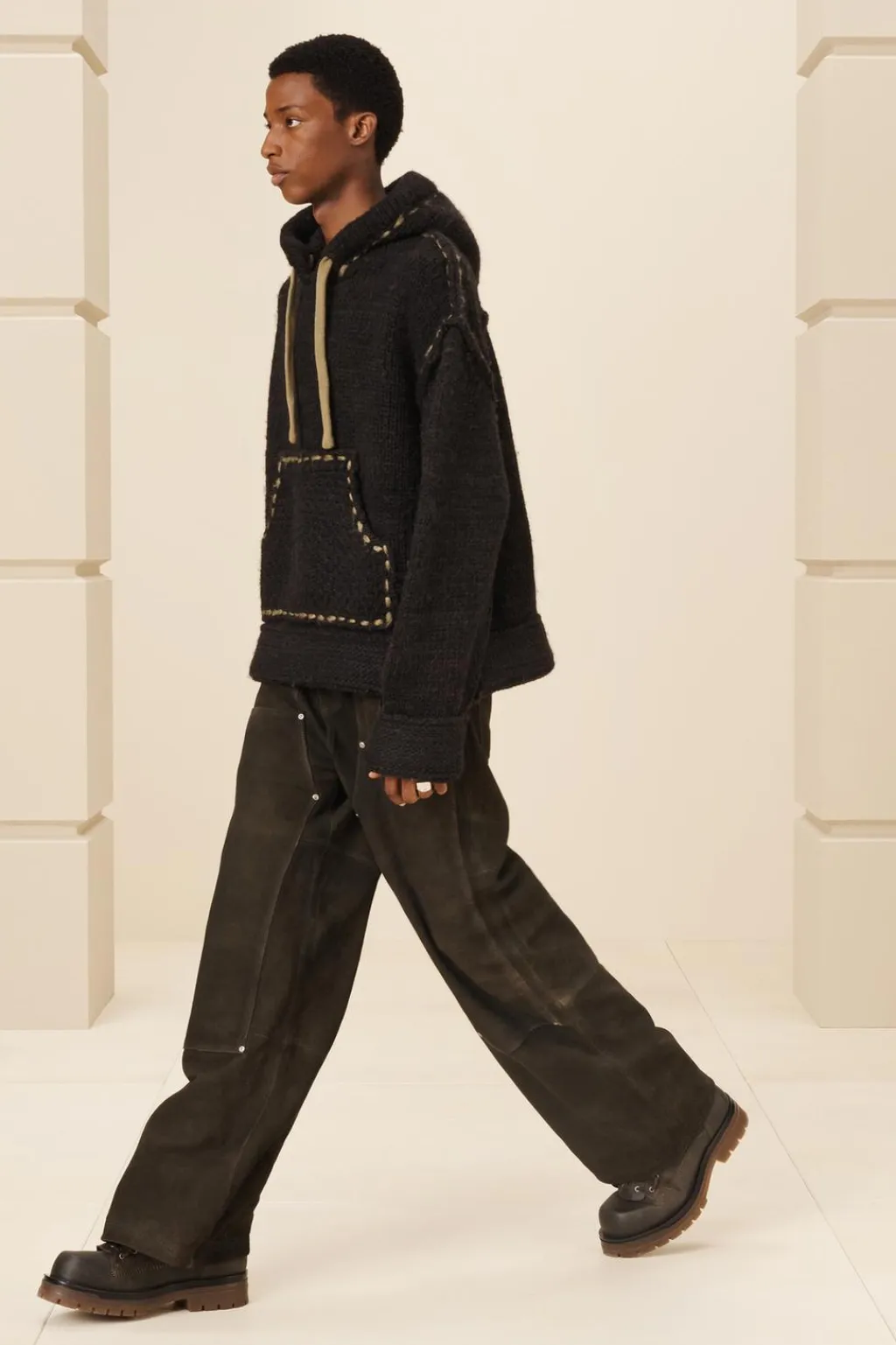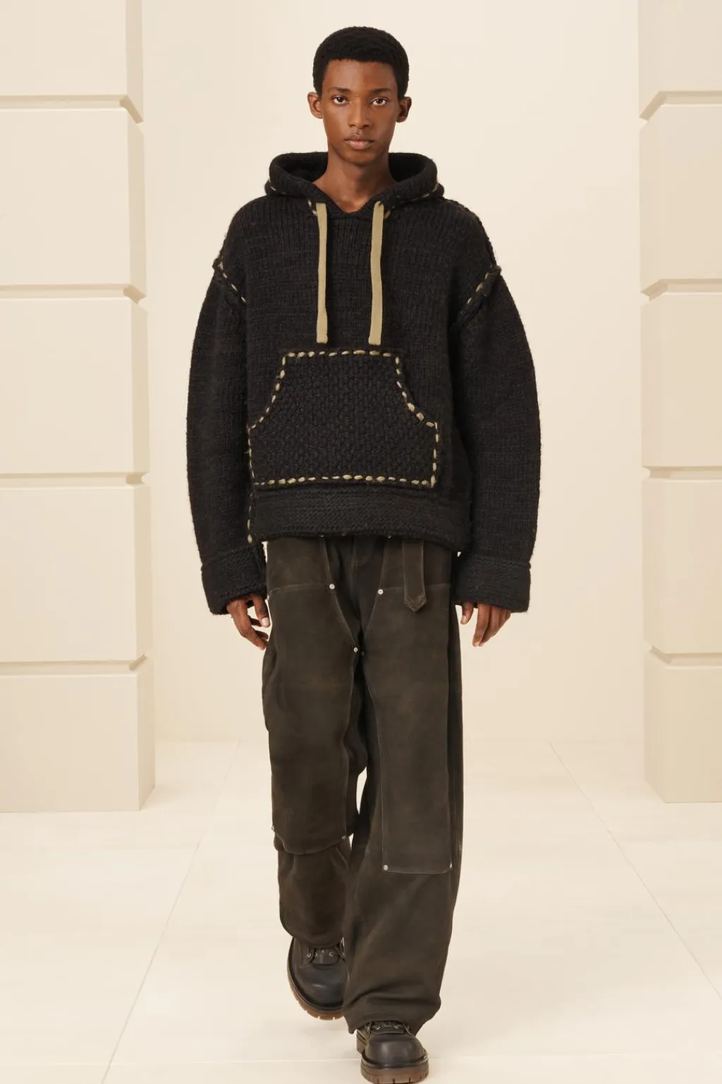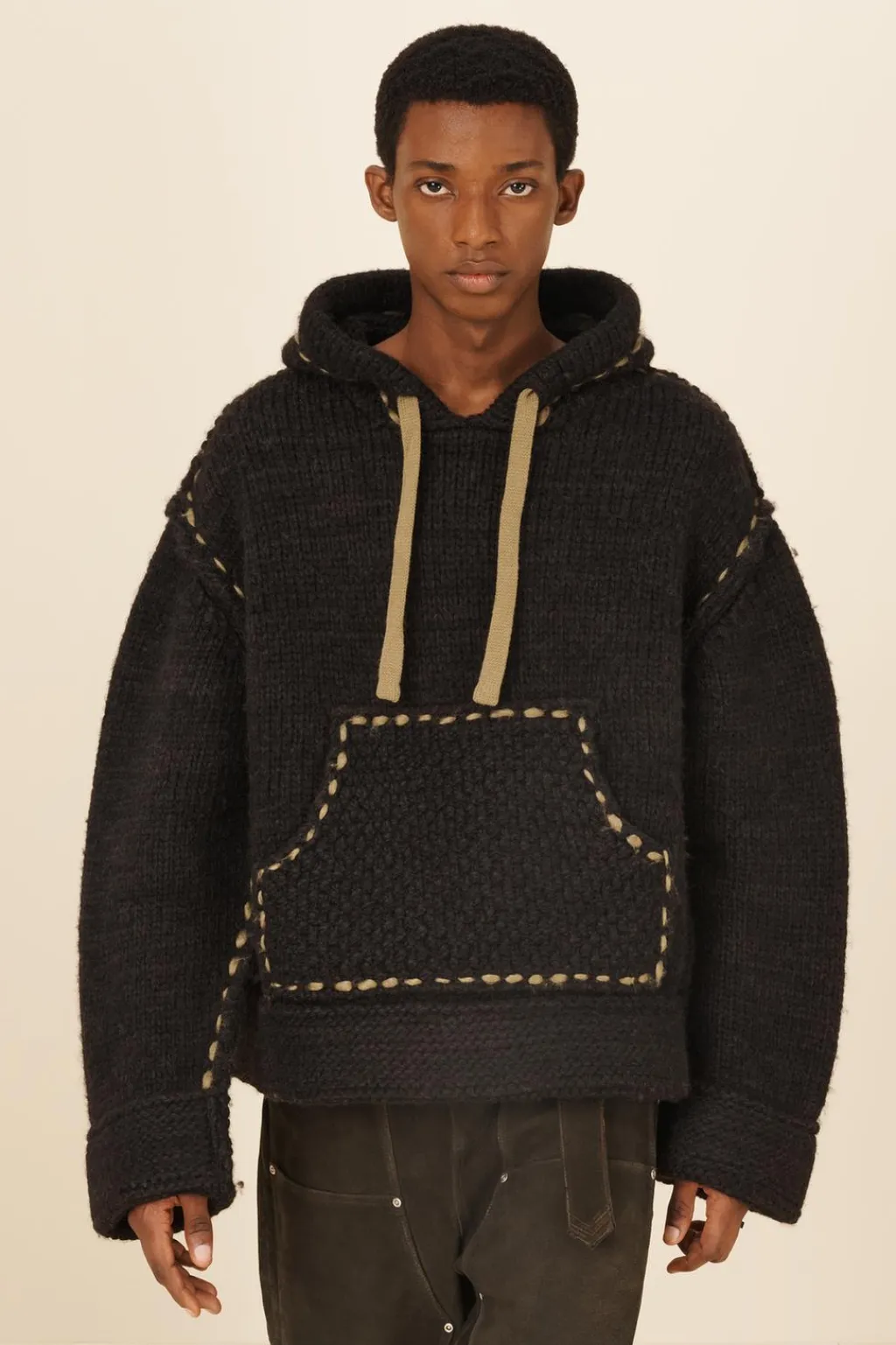 Sudadera cropped fit de punto tejido en hilatura de lana. Cuello con capucha ajustable y manga larga. Bolsillo frontal tipo canguro. Detalle de pespuntes combinados a contraste en toda la prenda.