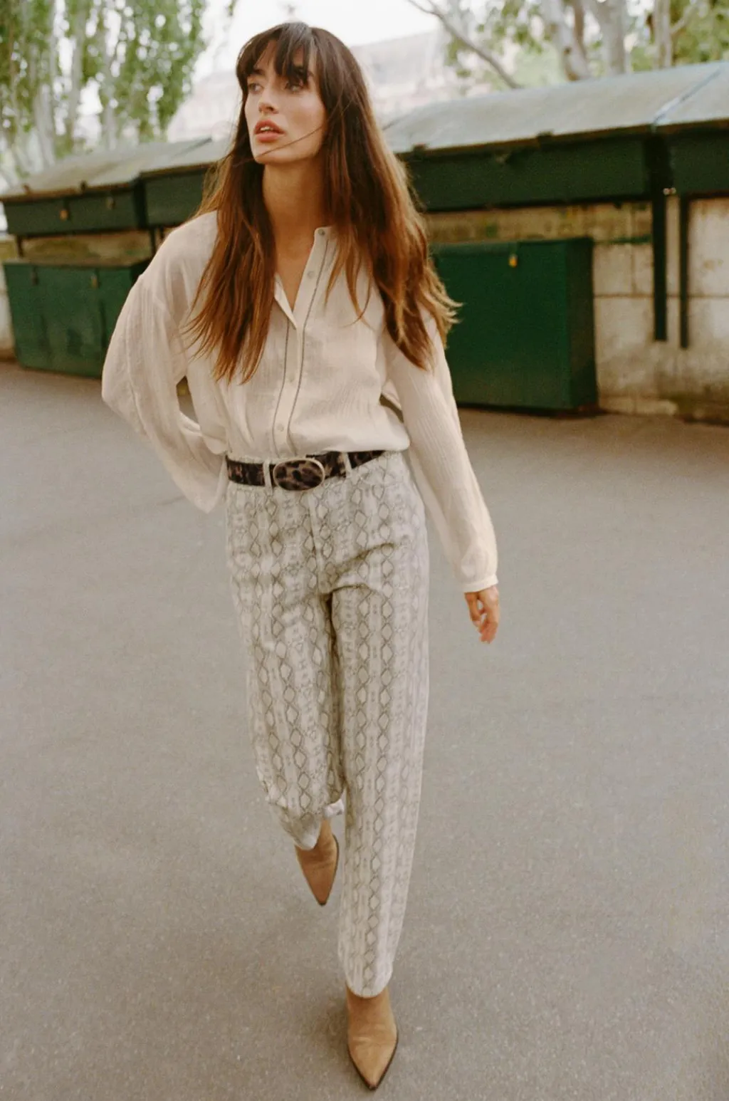 Jeans confeccionado en tejido rígido con trabillas y cinco bolsillos. Cierre frontal con cremallera y botón metálico.