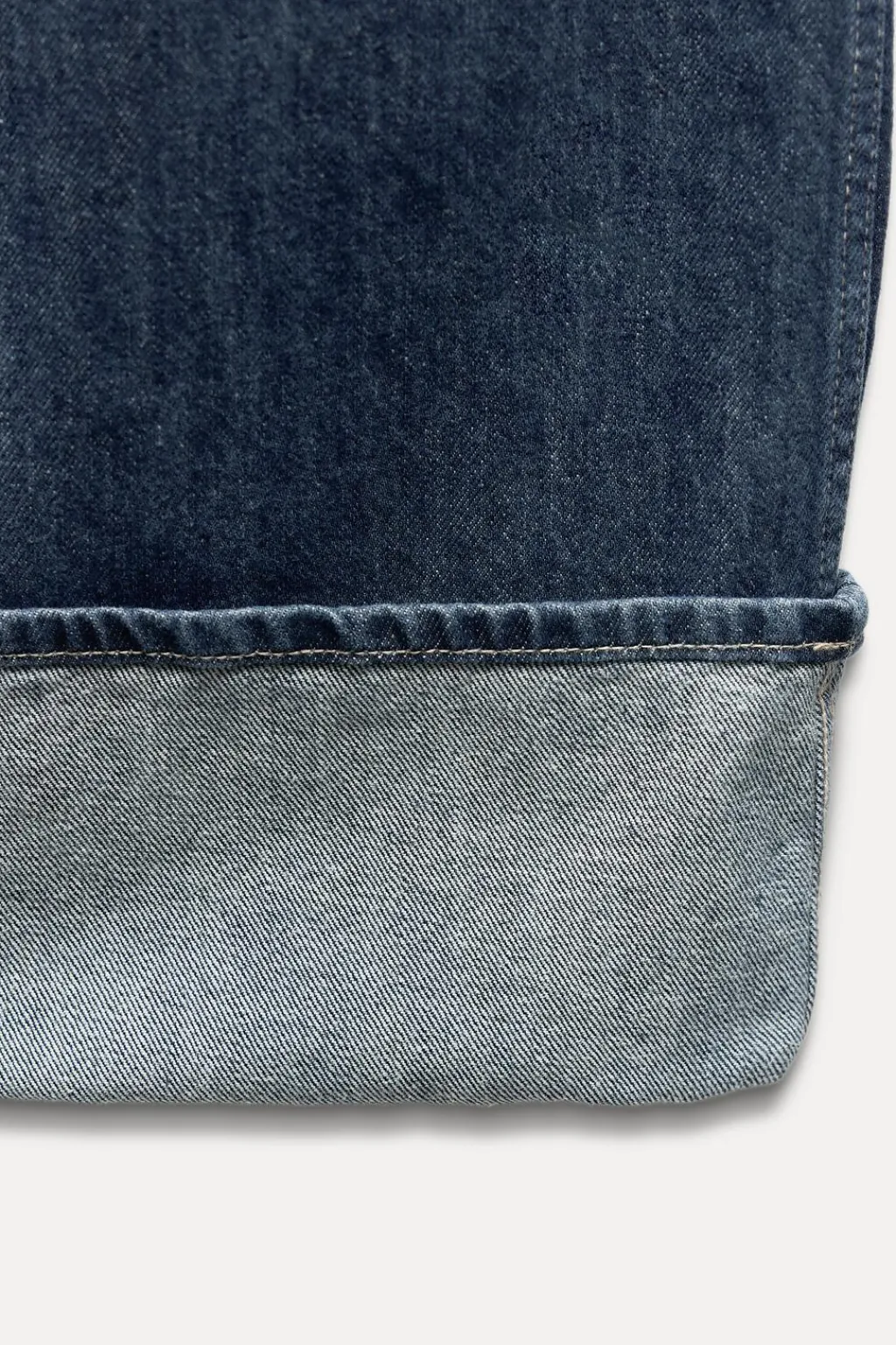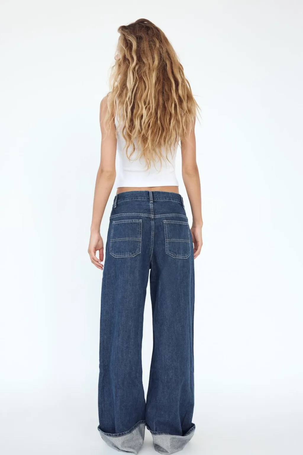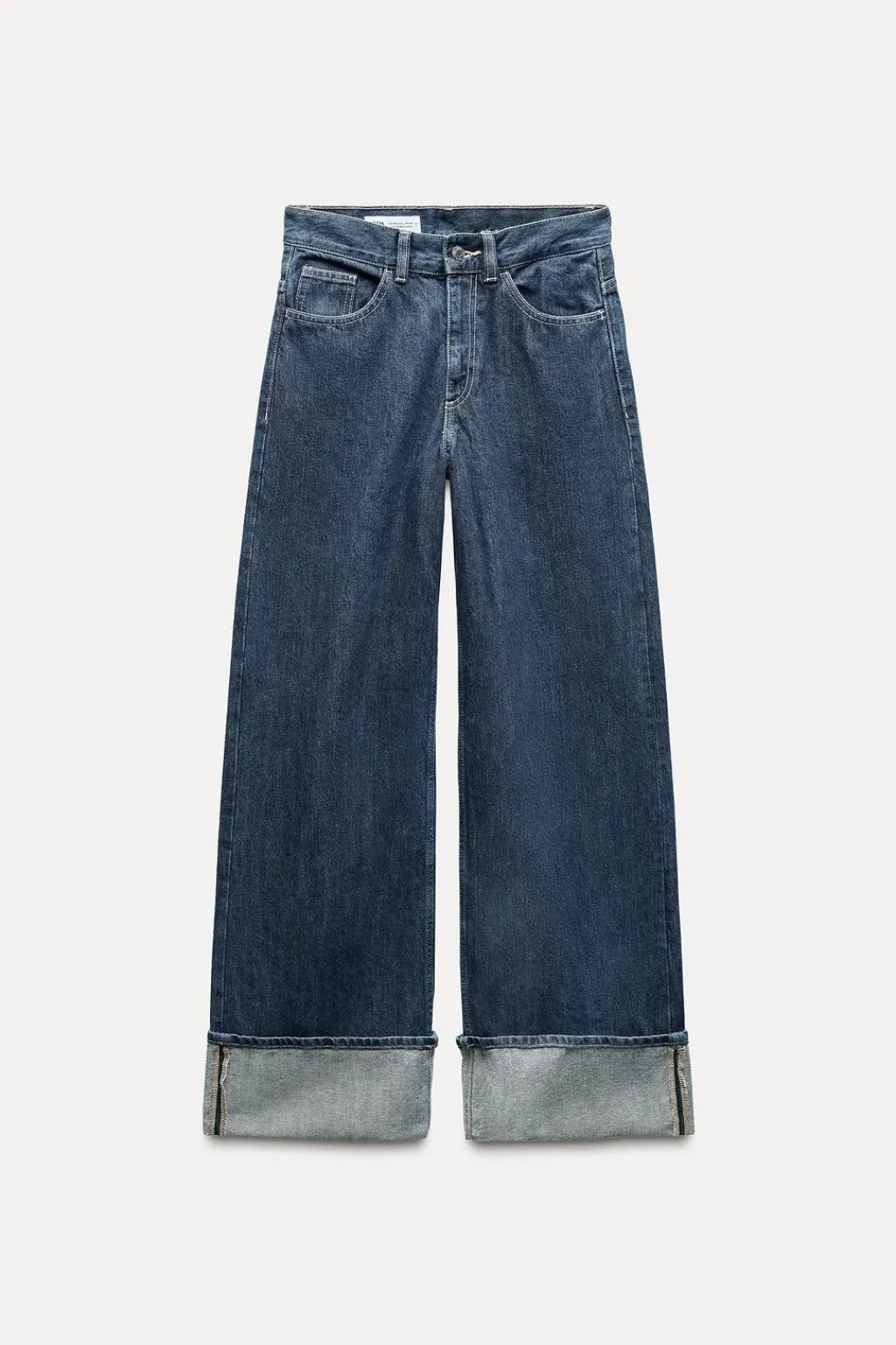 Jeans de tiro alto y cinco bolsillos. Pierna ancha extra larga. Cierre con cremallera y botón metálico.