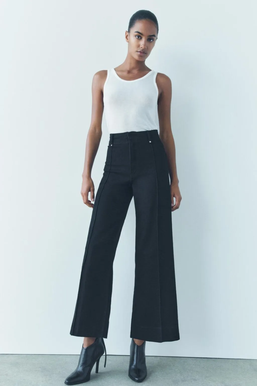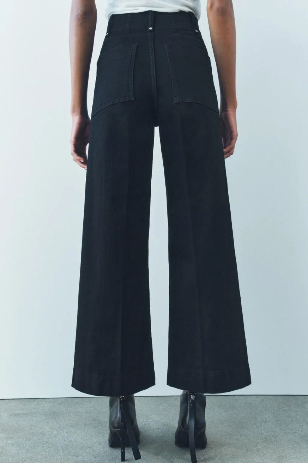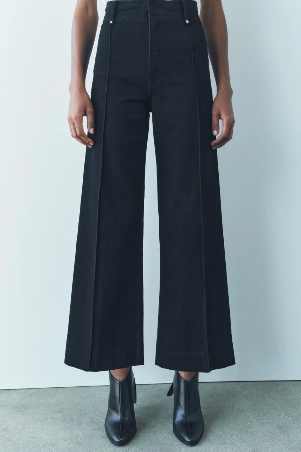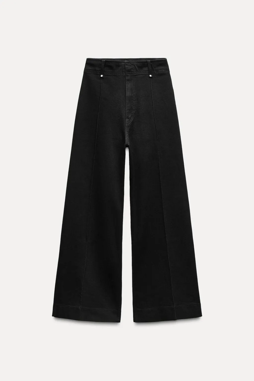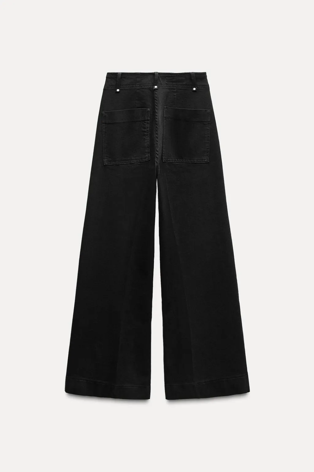 Jeans de tiro alto confeccionados en hilatura con mezcla de algodón. Cintura con trabillas. Bolsillos de plastrón en espalda. Detalle de costura marcada en delantero. Pierna ancha. Cierre frontal con cremallera, botón y gancho metálico.