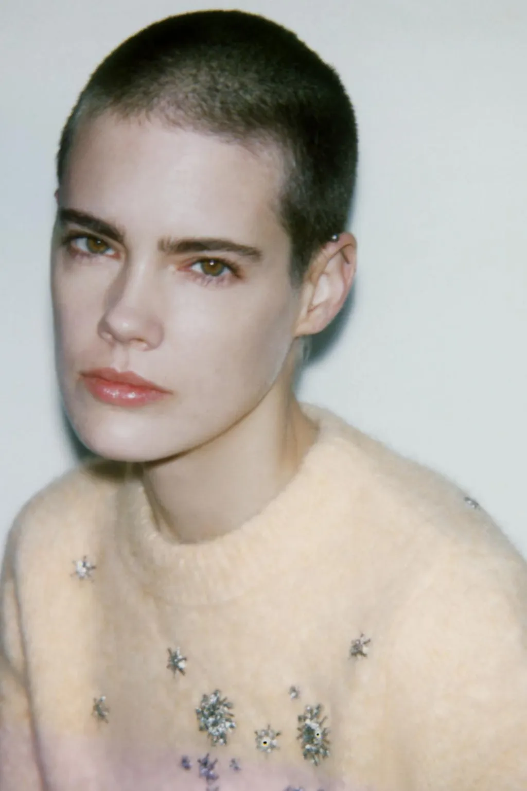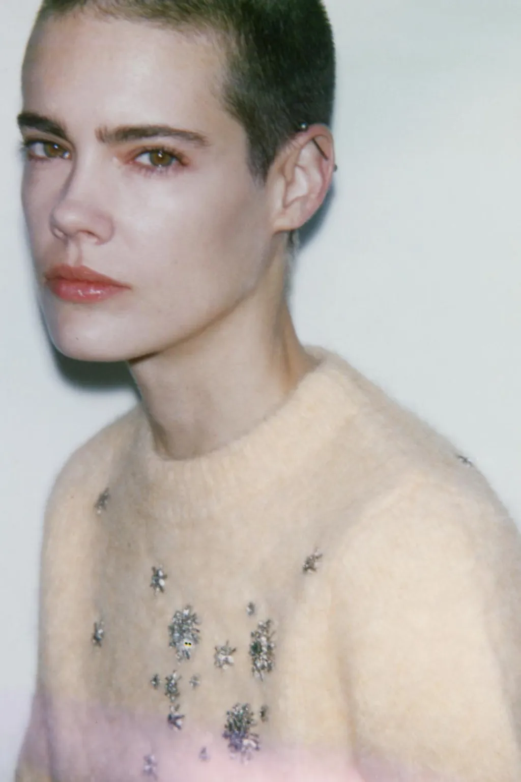 Jersey confeccionado con alpaca y lana. Cuello redondo y manga por debajo del codo. Detalle aplicación de abalorios joya. Acabados en rib.