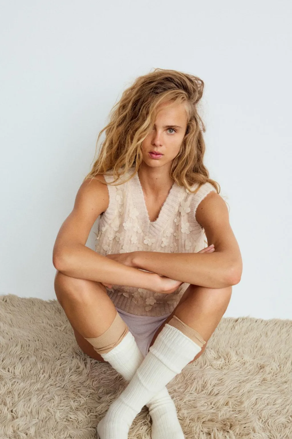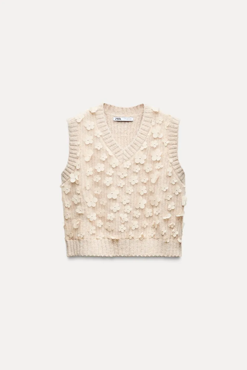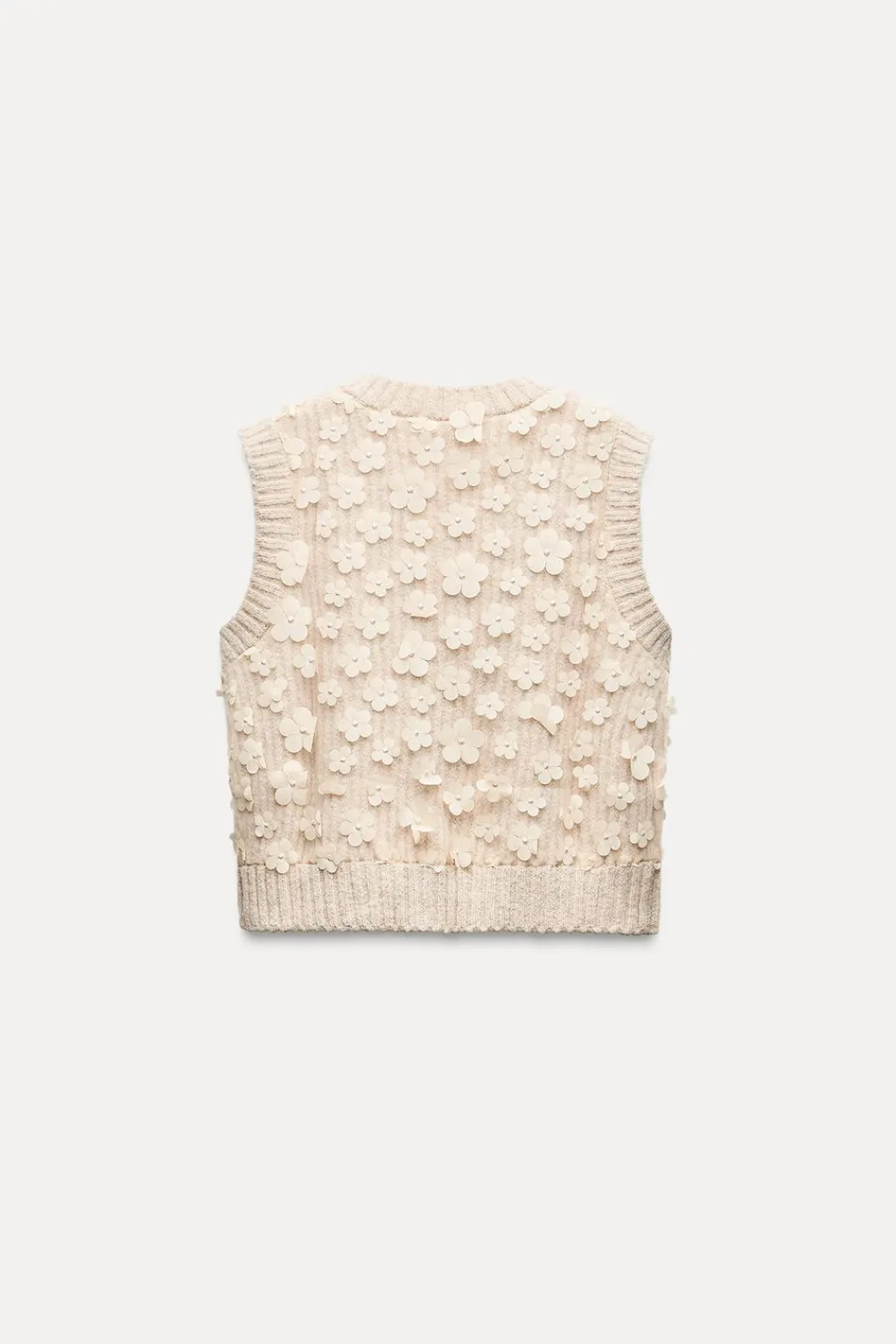 Jersey chaleco de cuello pico y manga sisa. Detalle de tejido combinado semitransparente con aplicación de flores.