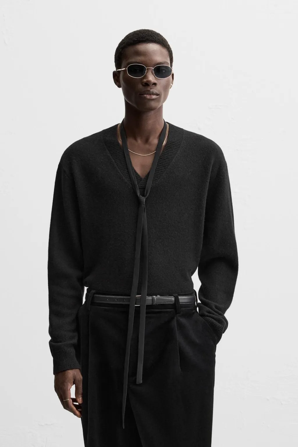 Jersey regular fit tejido en hilatura de lana. Cuello pico y manga larga. Acabados en rib.
