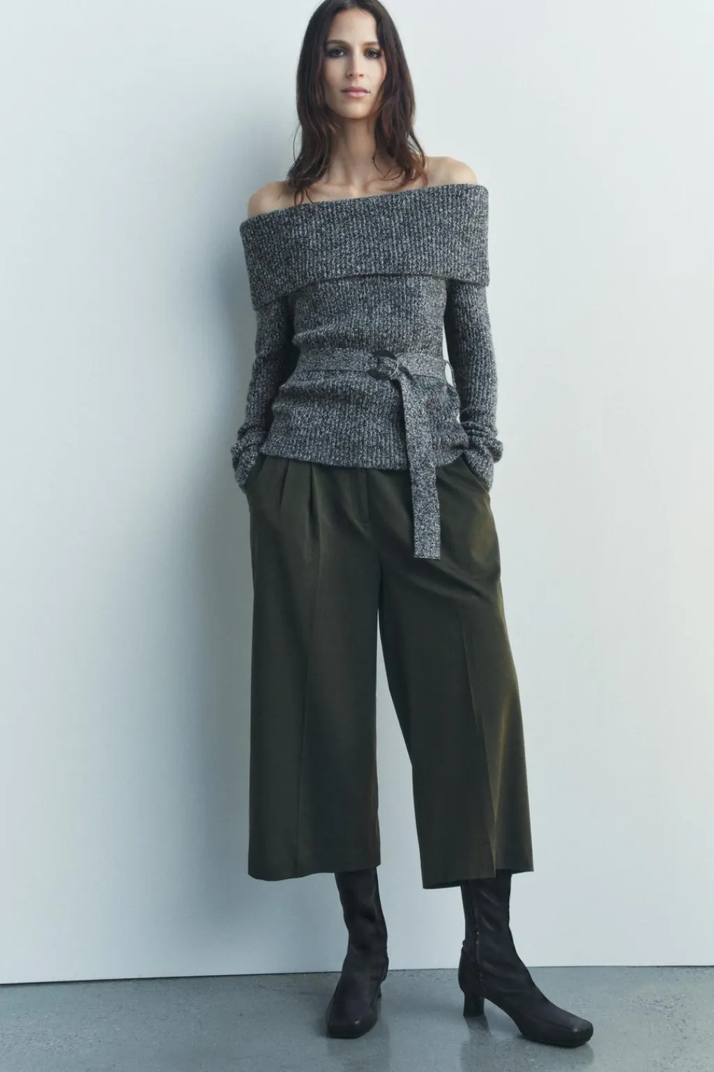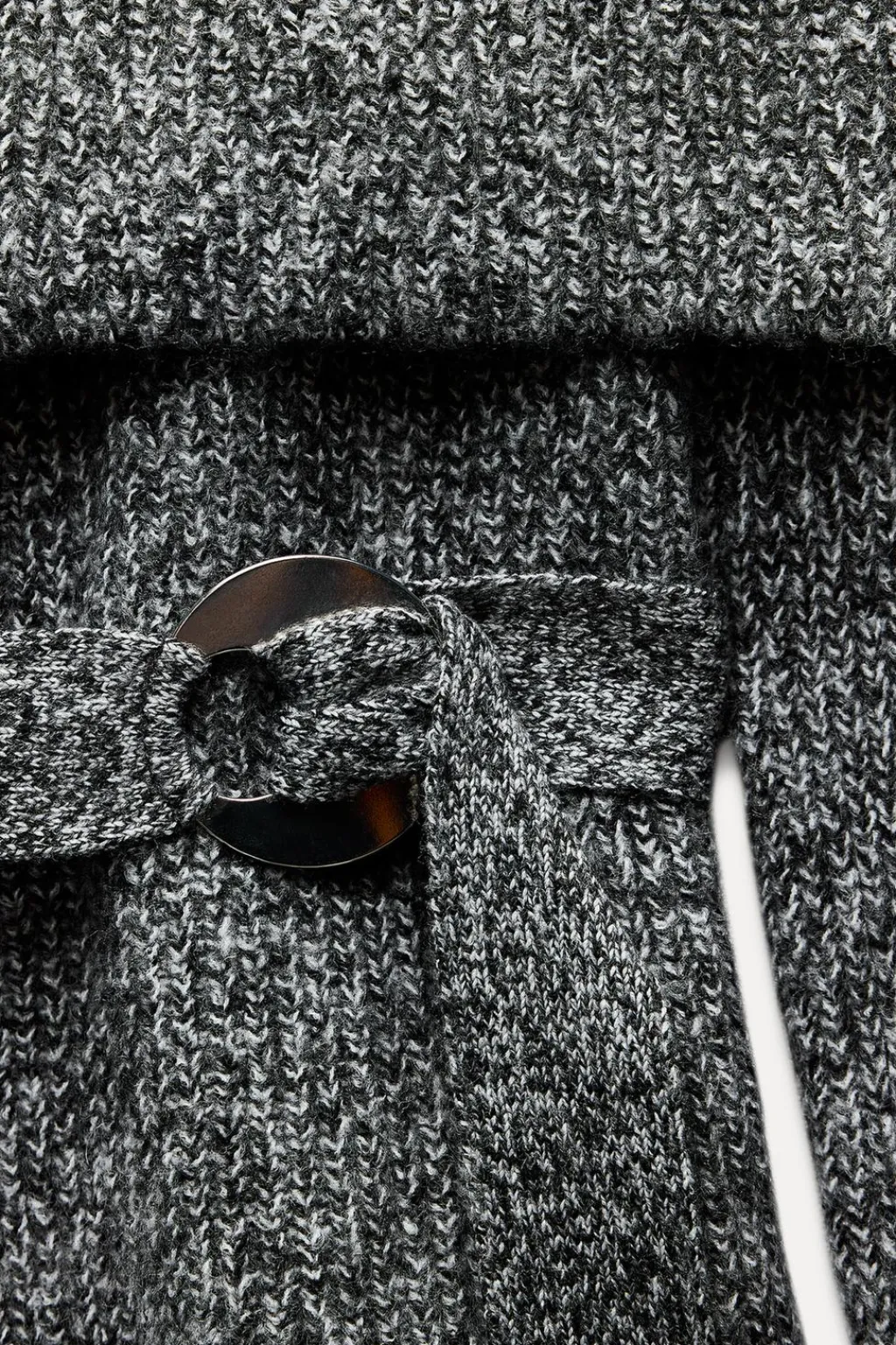 Jersey de escote recto acabado en vuelta con hombros descubiertos y manga larga. Detalle de cinturón con hebilla del mismo tejido.