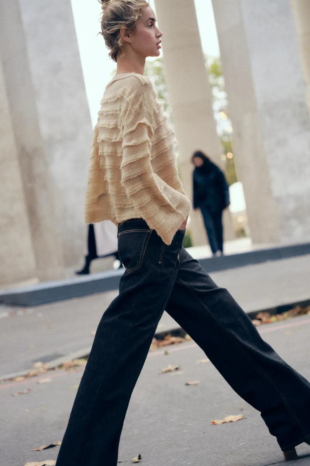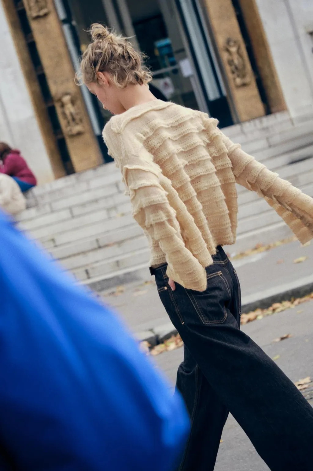 Jersey con cuello redondo amplio y manga larga. Detalle de volantes en punto.