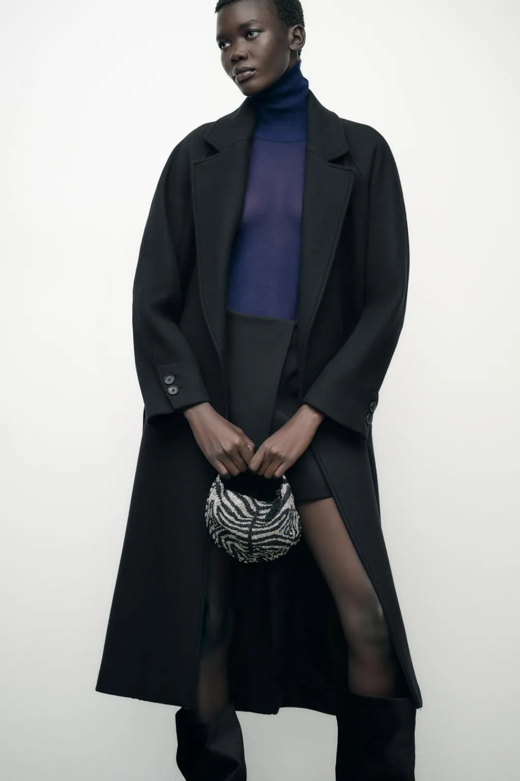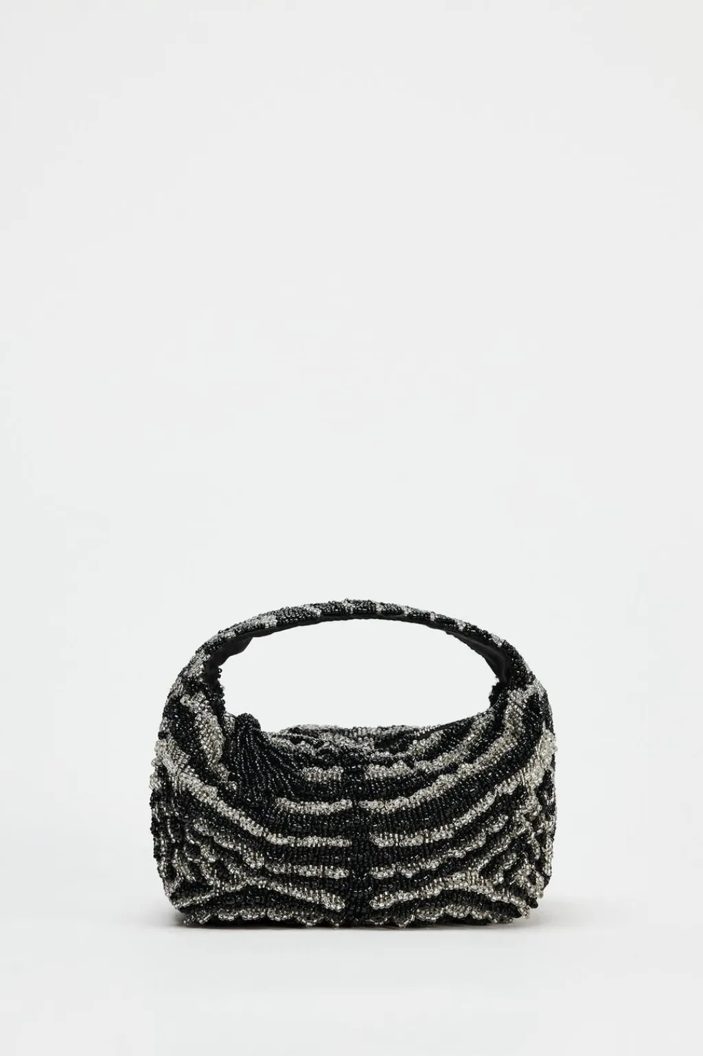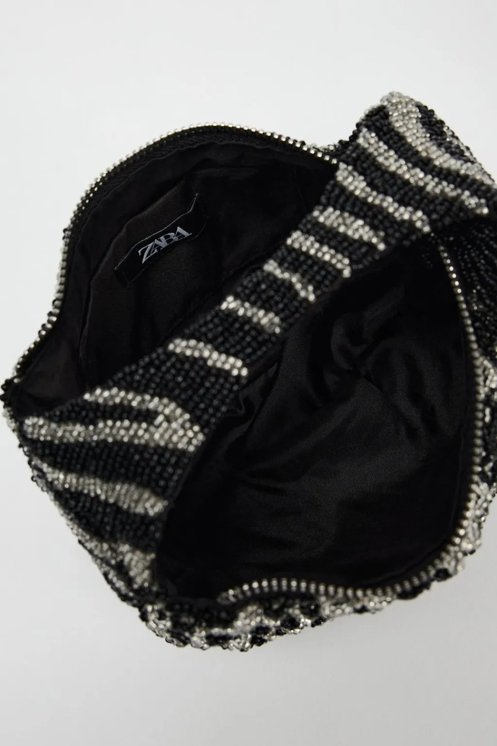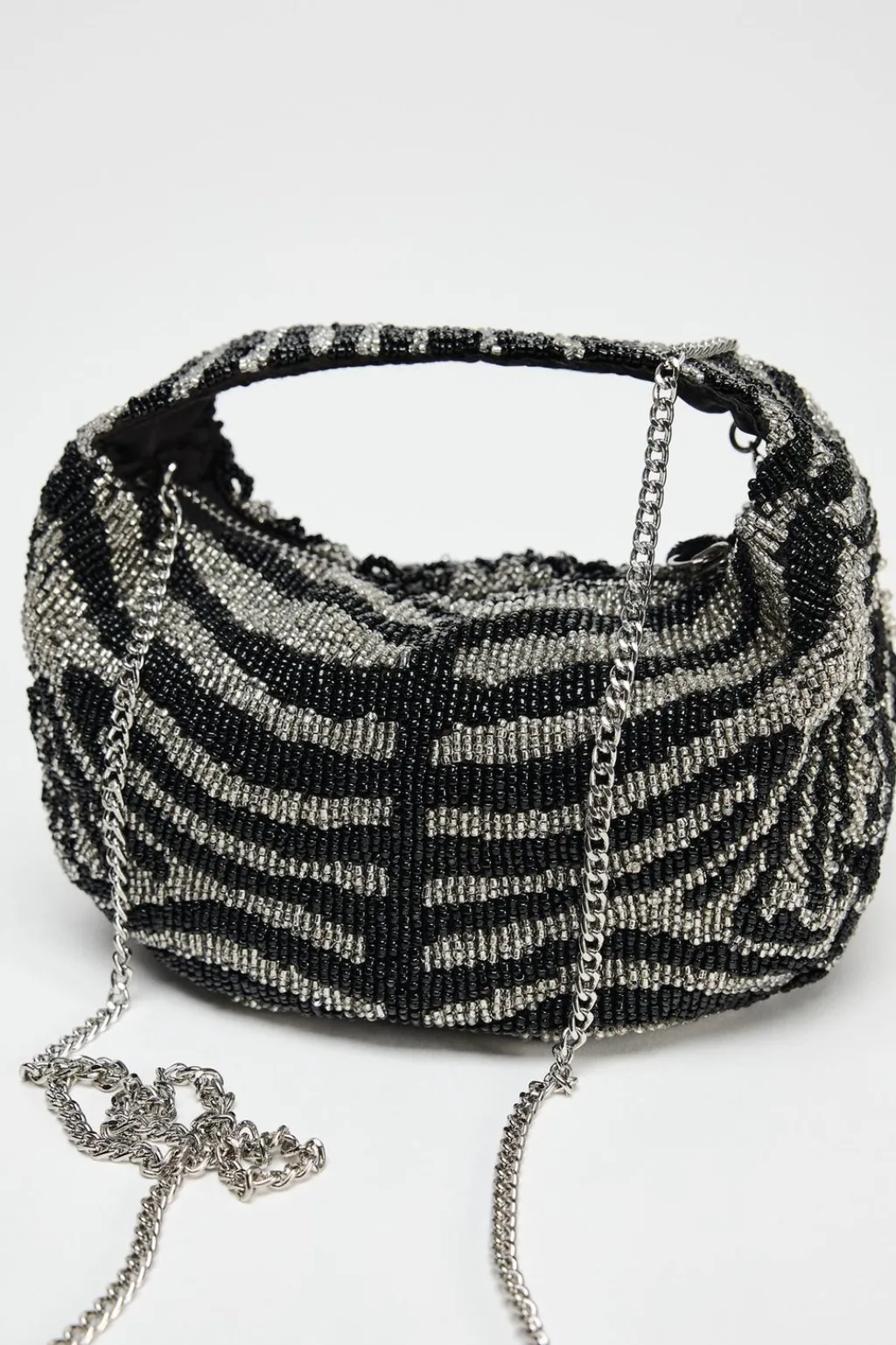 Bolso formato mini con detalle de lentejuelas en el cuerpo. Asa de mano y asa bandolera en cadena. Forro interior con bolsillo y cierre mediante cremallera con tirador.