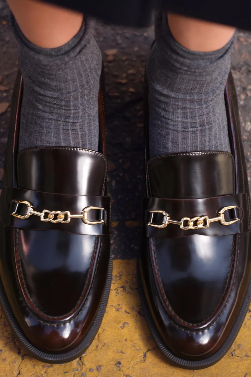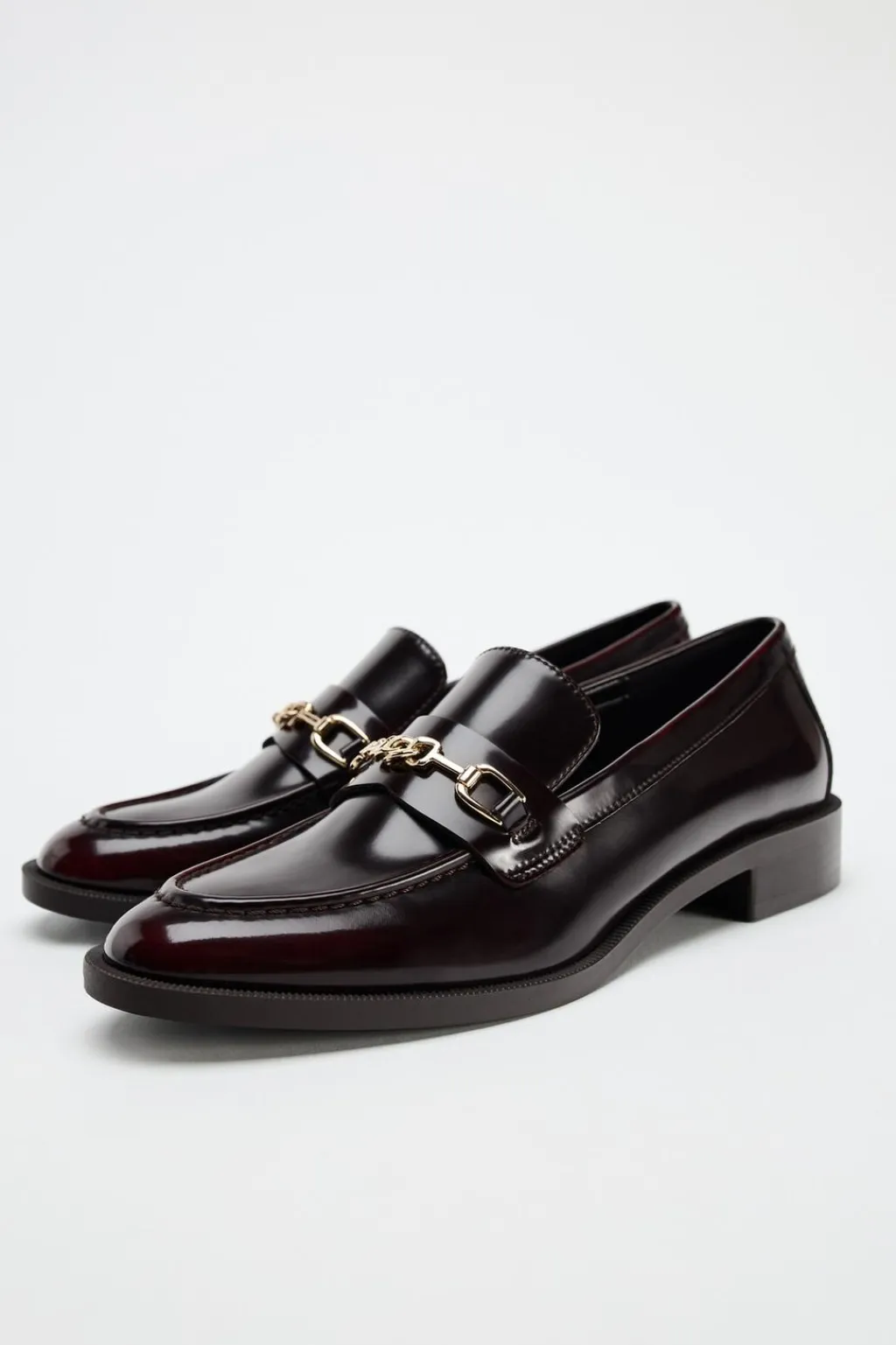 Zapato plano tipo mocasín en efecto acharolado. Detalle de hebilla metálica en la parte delantera. Acabado en punta redonda.