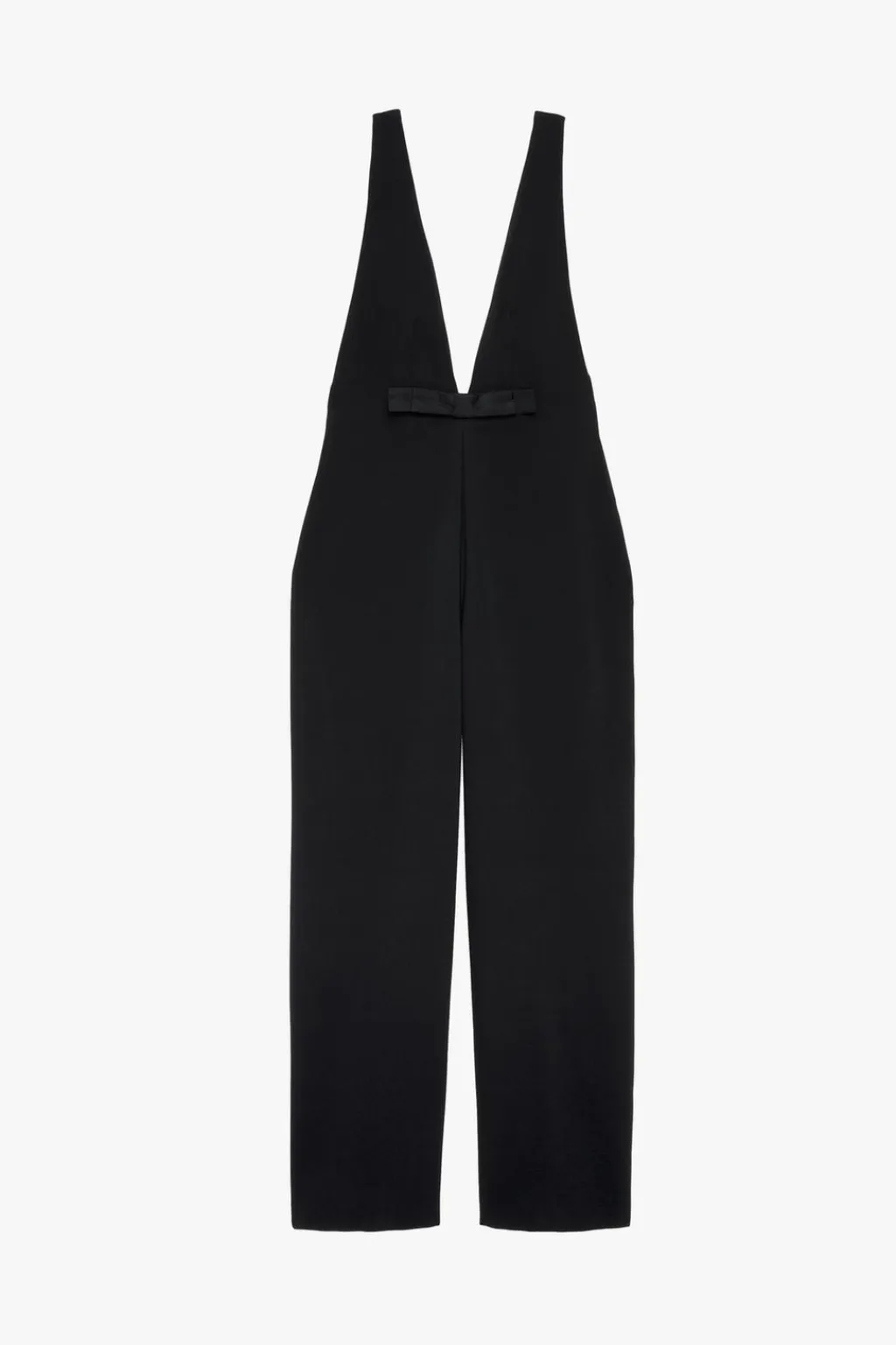 Mono largo confeccionado en hilatura con viscosa. Escote pico y manga sisa. Bolsillos laterales ocultos costura. Detalle de lazo en delantero combinado a tono. Pierna ancha. Cierre en espalda con cremallera oculta en costura.