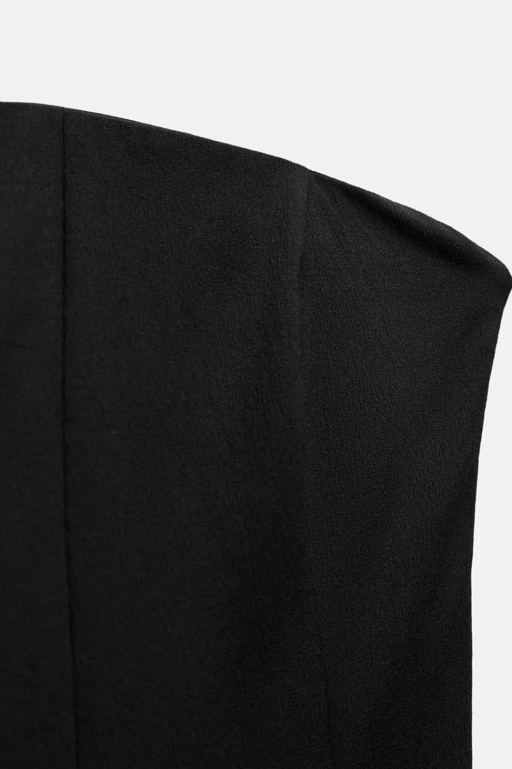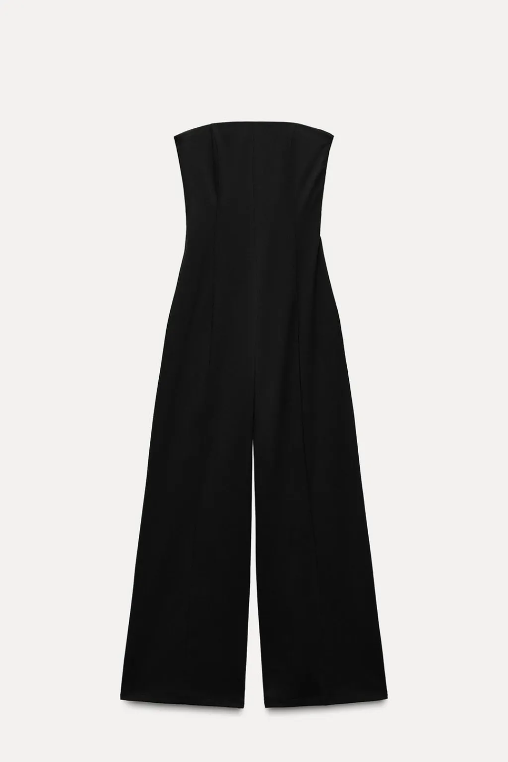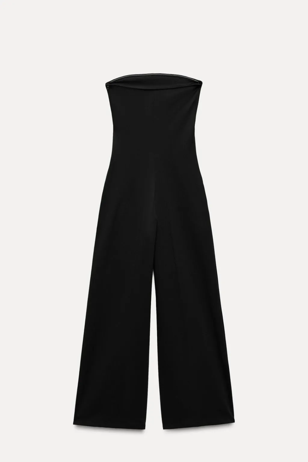 Mono largo confeccionado en tejido elástico. Escote recto y hombros descubiertos. Cierre lateral con cremallera oculta en costura.