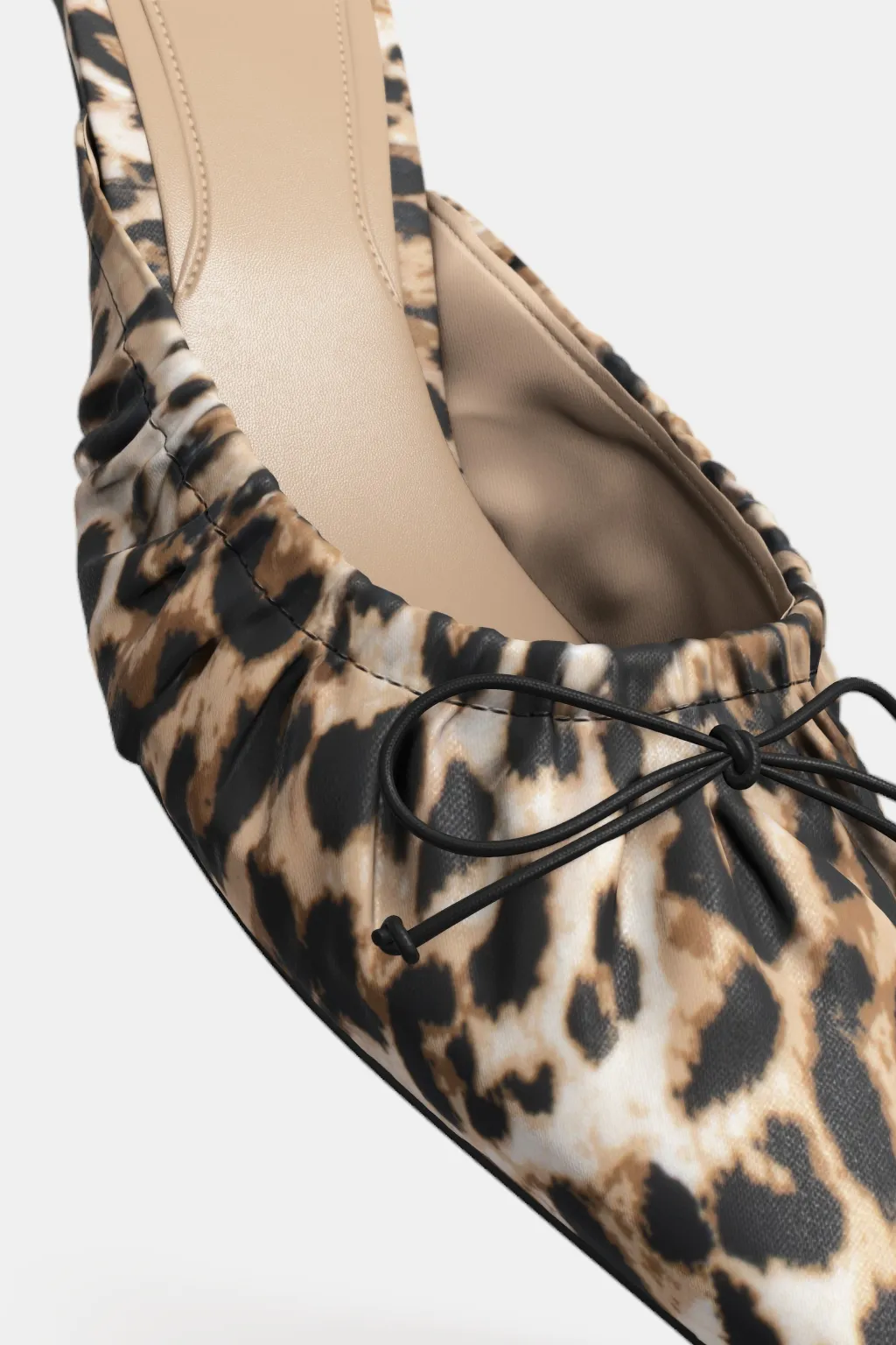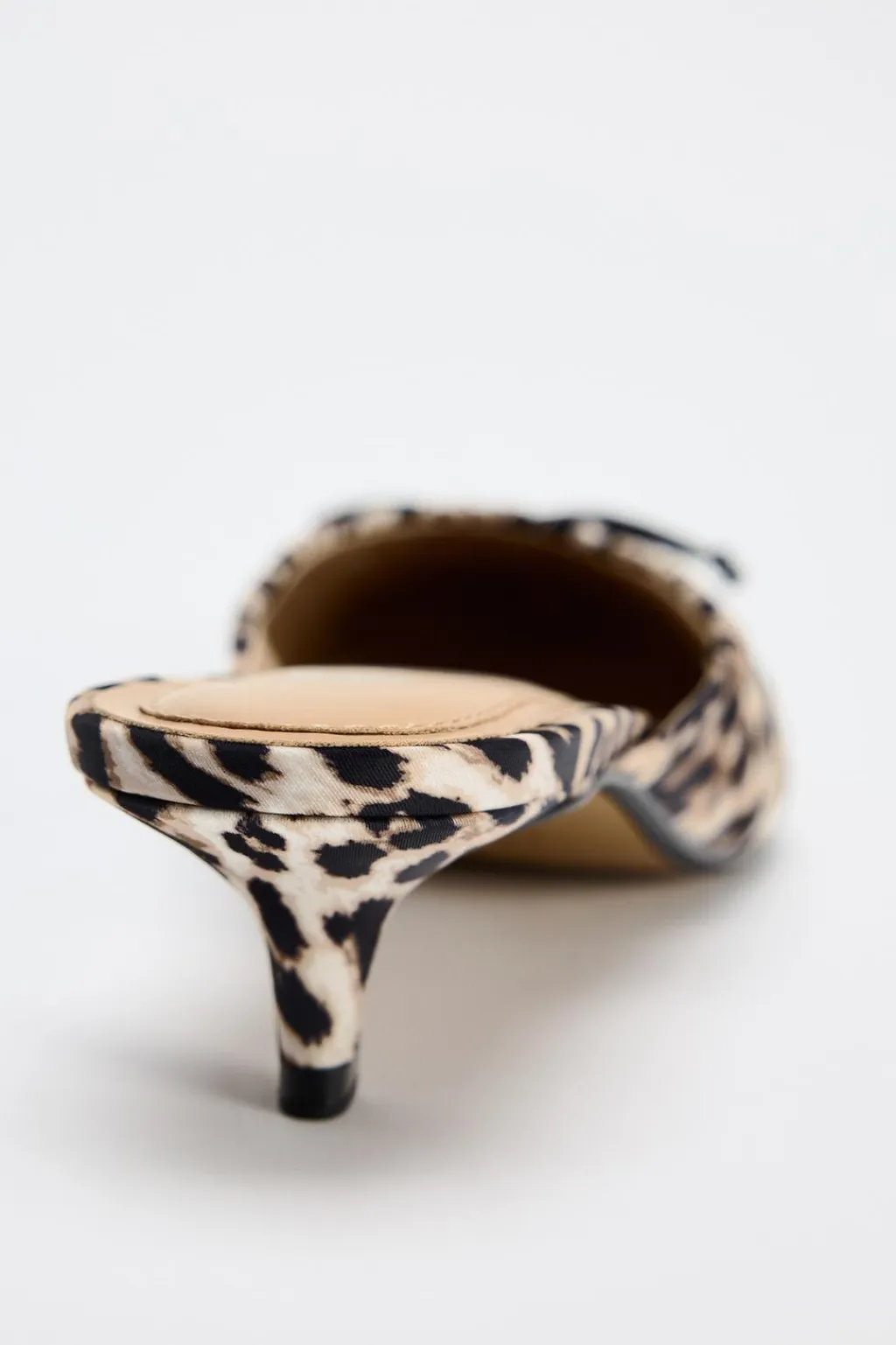 Zapato destalonado de tacón en tejido estampado animal. Detalle de lazo en la parte delantera. Acabado en punta.