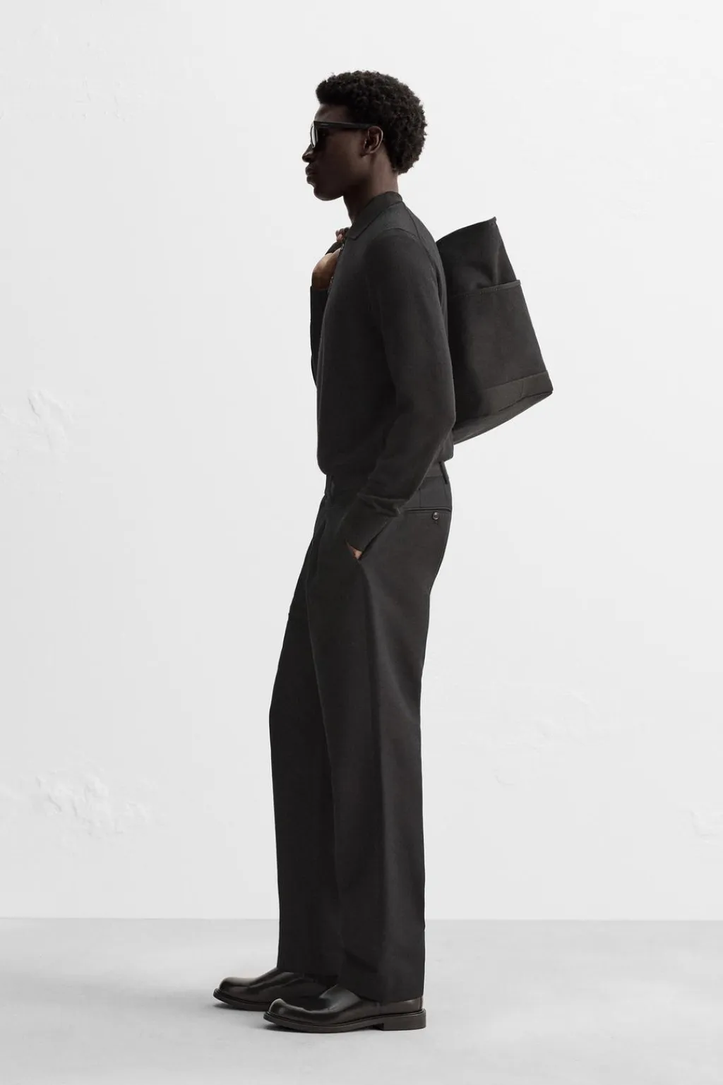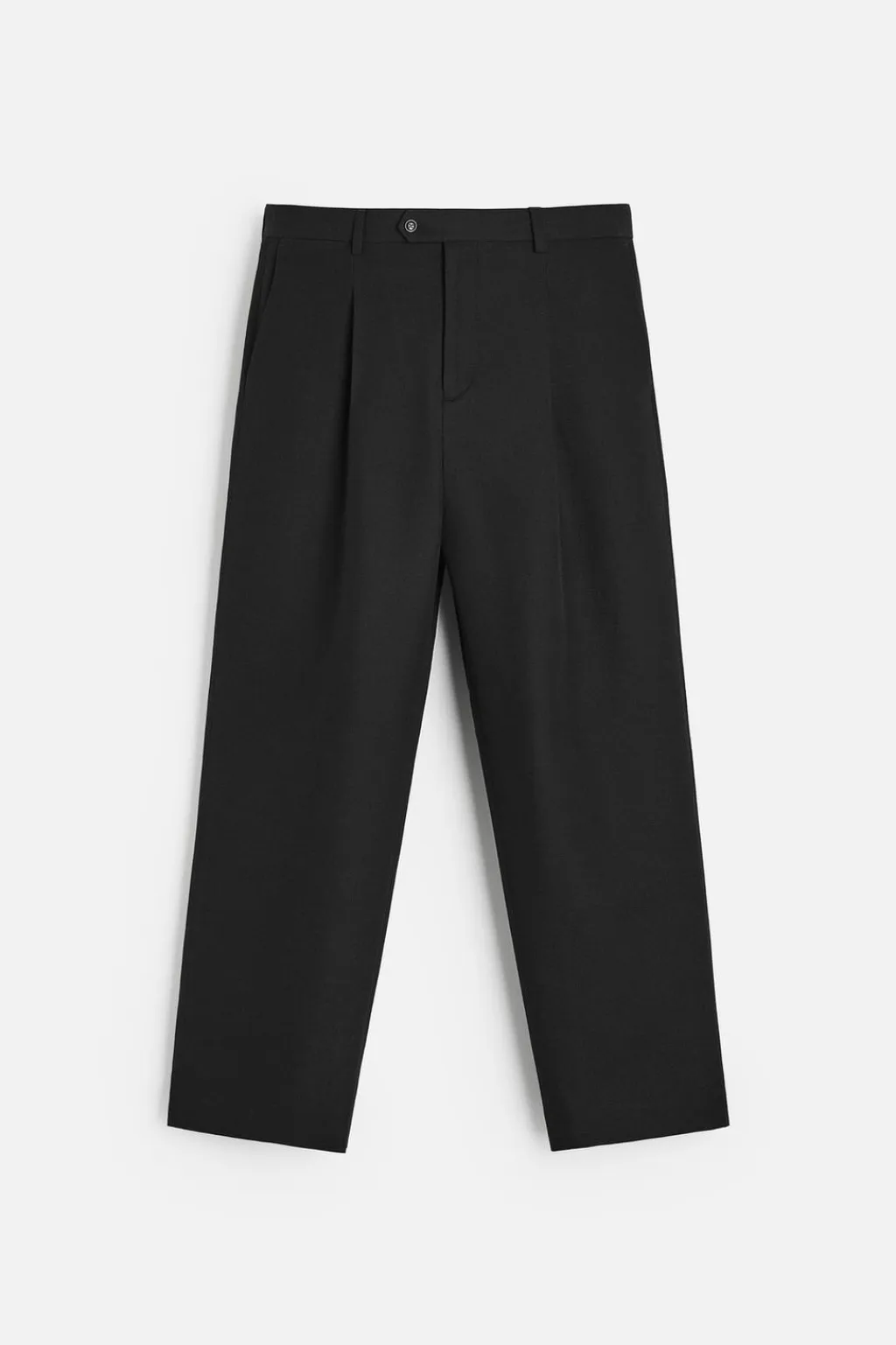 Pantalón regular fit confeccionado en tejido con mezcla de algodón y lana. Cintura con detalle de pliegues frontales. Bolsillos frontales y detalle de bolsillos traseros de doble vivo con botón. Cierre frontal con cremallera y botón.