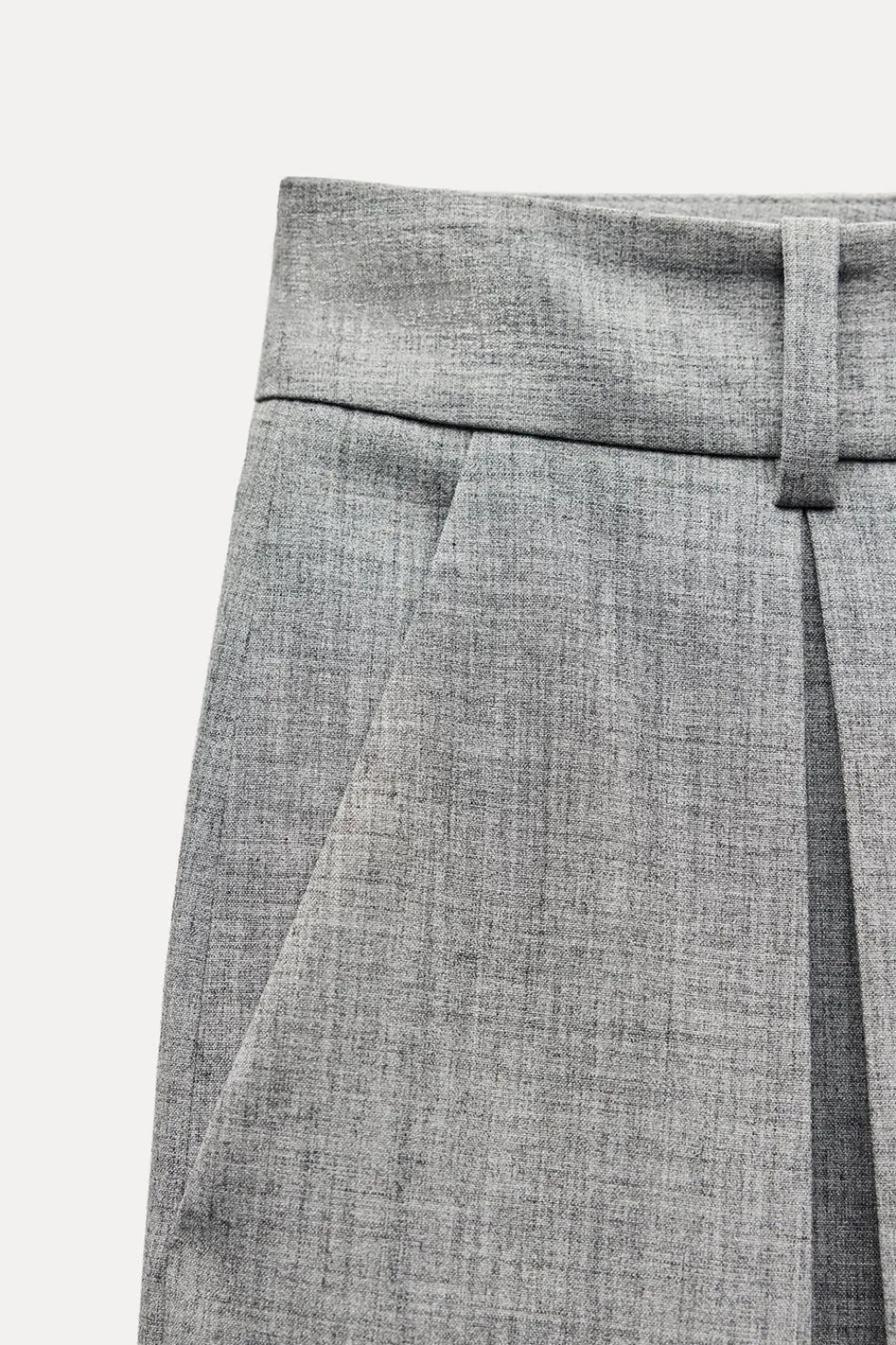Pantalón de tiro alto con pinzas delanteras. Bolsillos frontales y falso bolsillo de vivo en espalda. Cierre delantero con cremallera, botón interior y gancho.