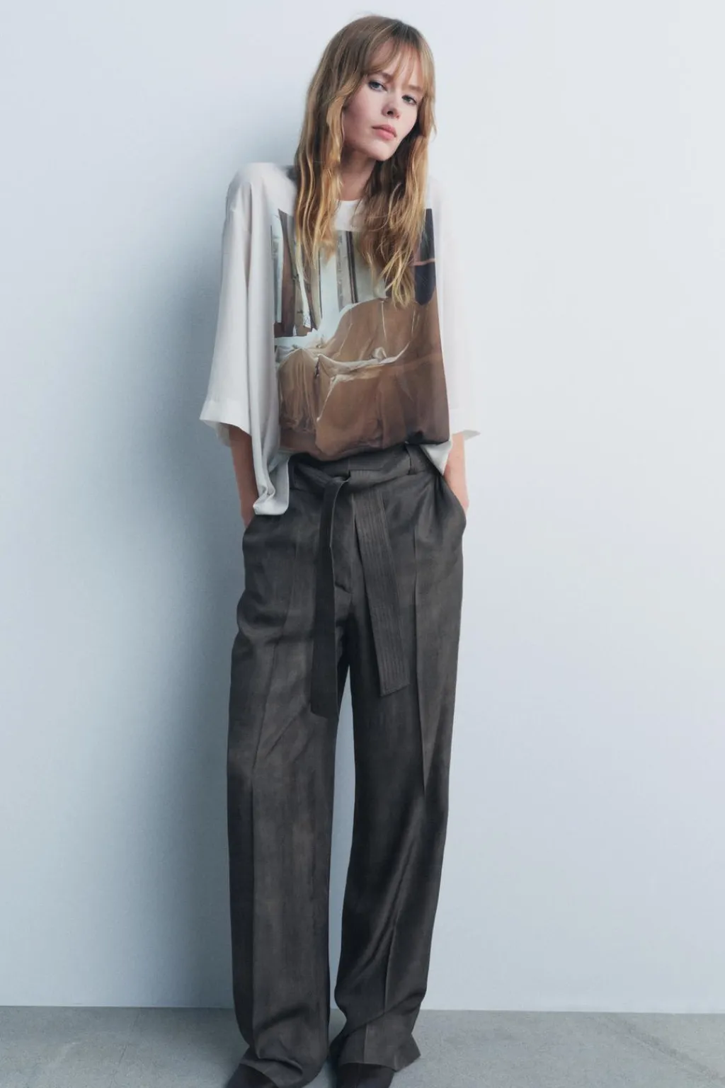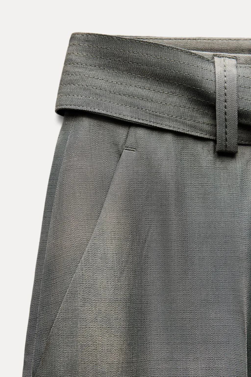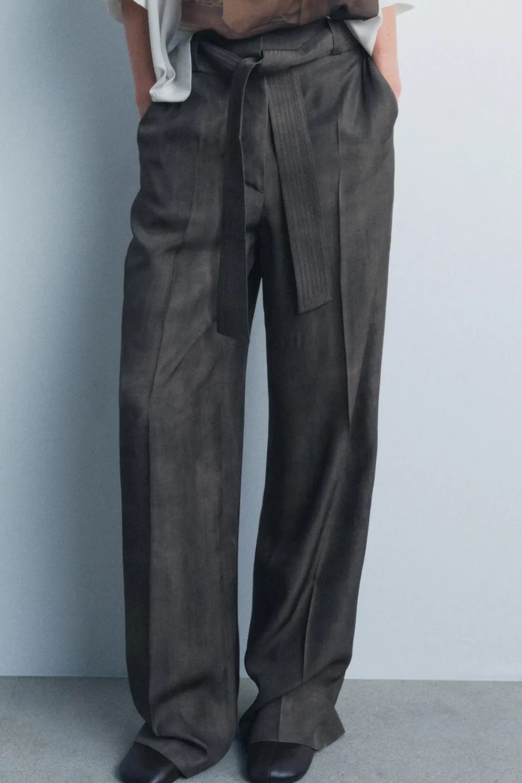 Pantalón confeccionado en hilatura de viscosa. Tiro medio y cintura con trabillas. Bolsillos en delantero. Cinturón en mismo tejido ajustable con lazadas. Pierna recta. Cierre frontal con cremallera, botón y gancho metálico.