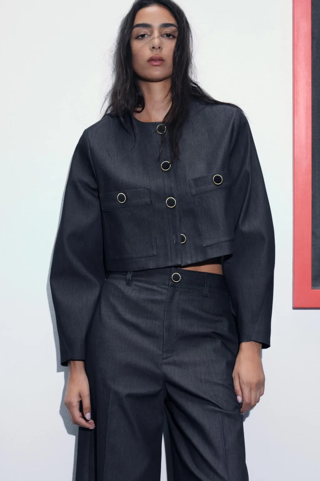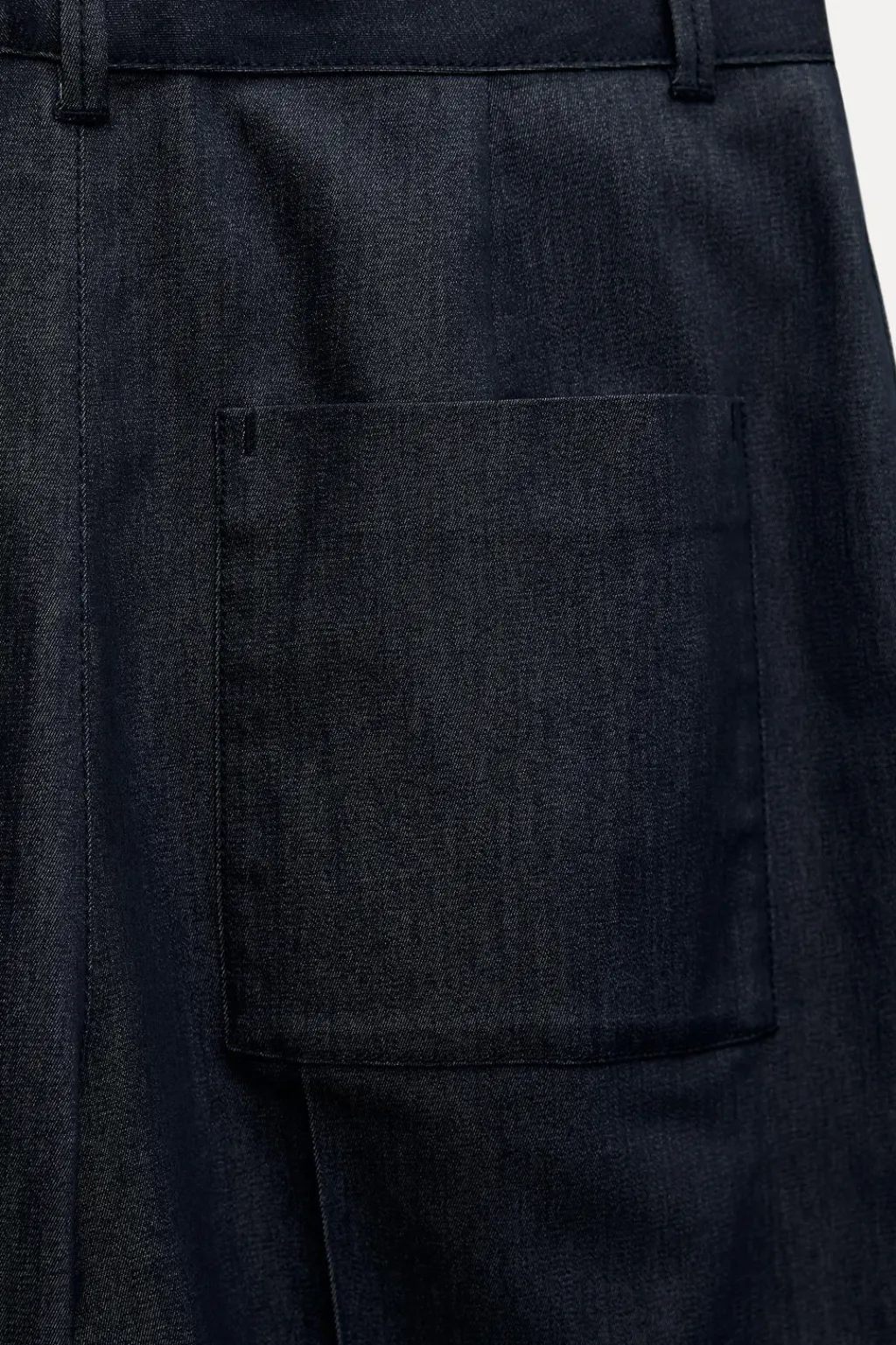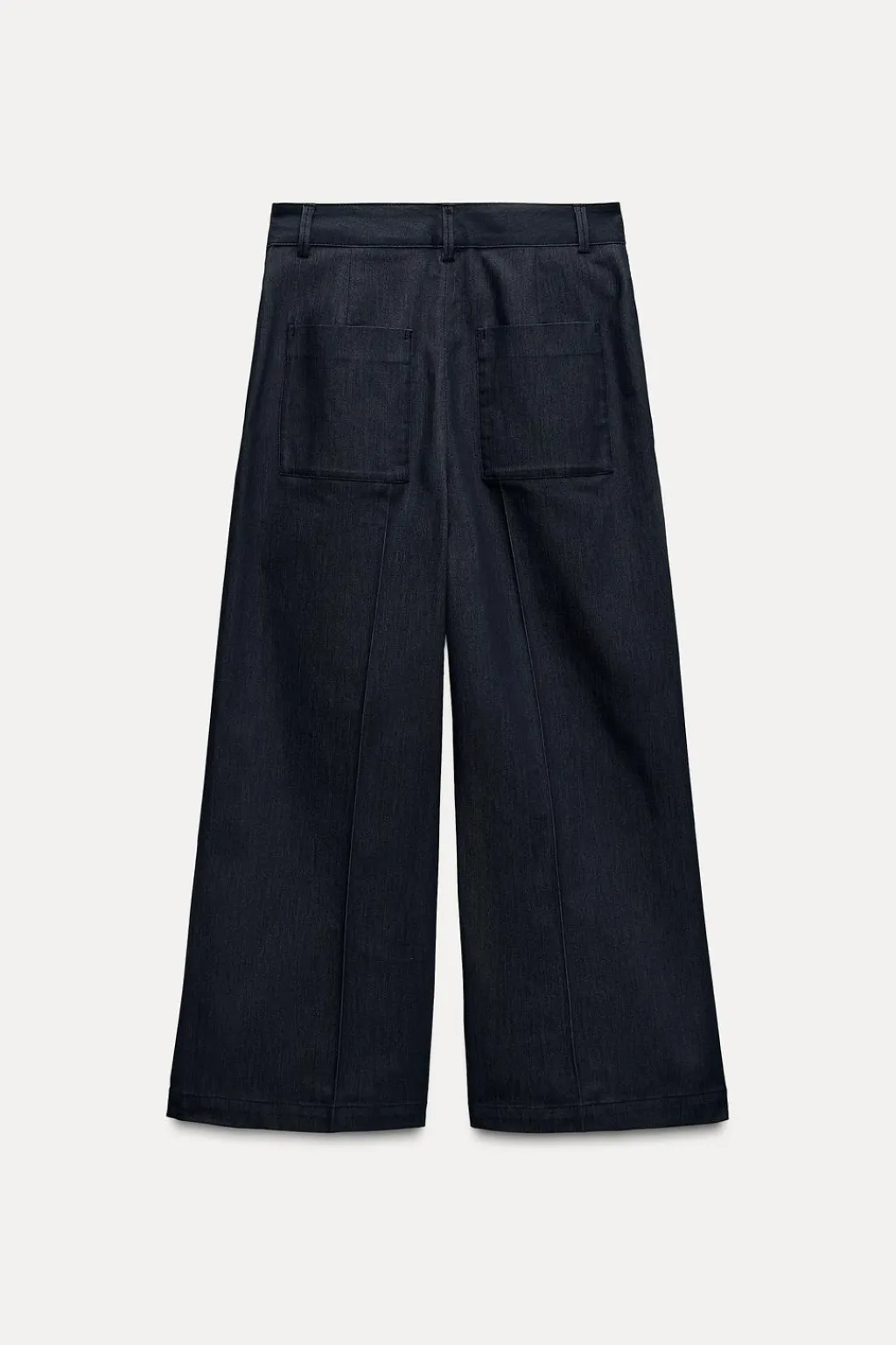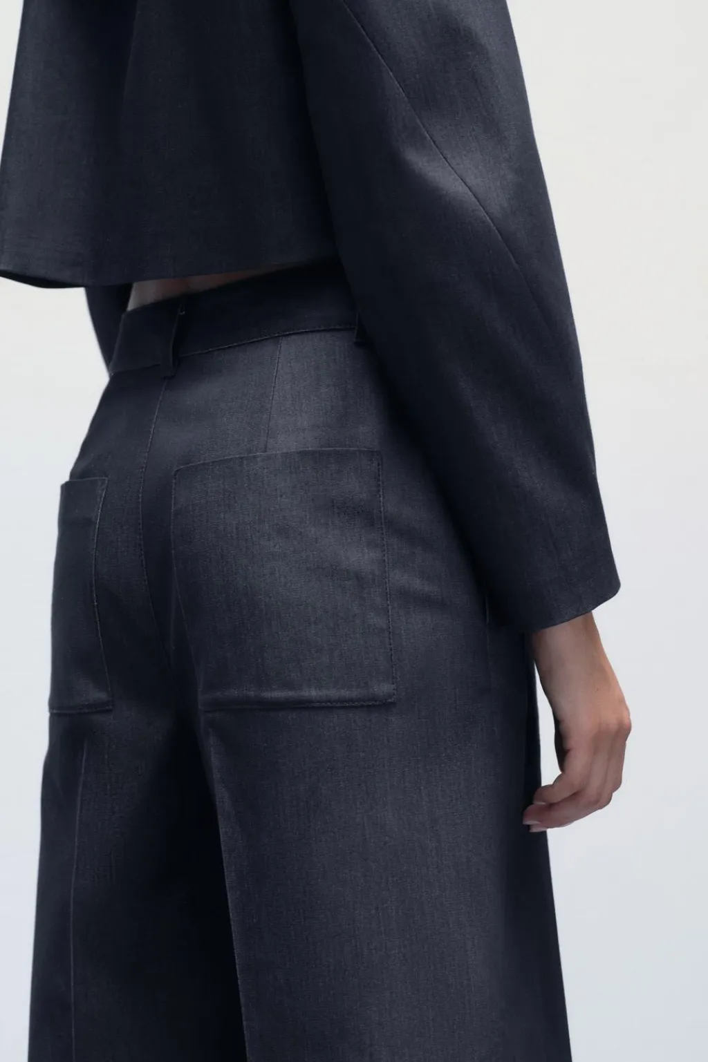 Pantalón de tiro alto con bolsillos de vivo en delantero y de plastrón en espalda. Cierre frontal con cremallera y botón.
