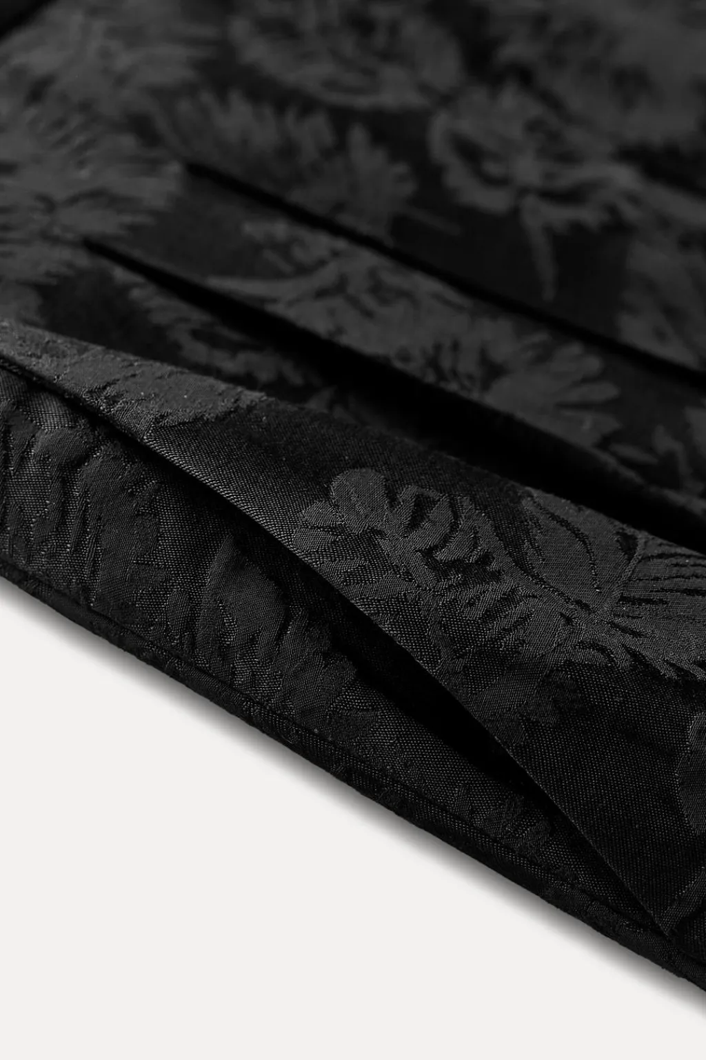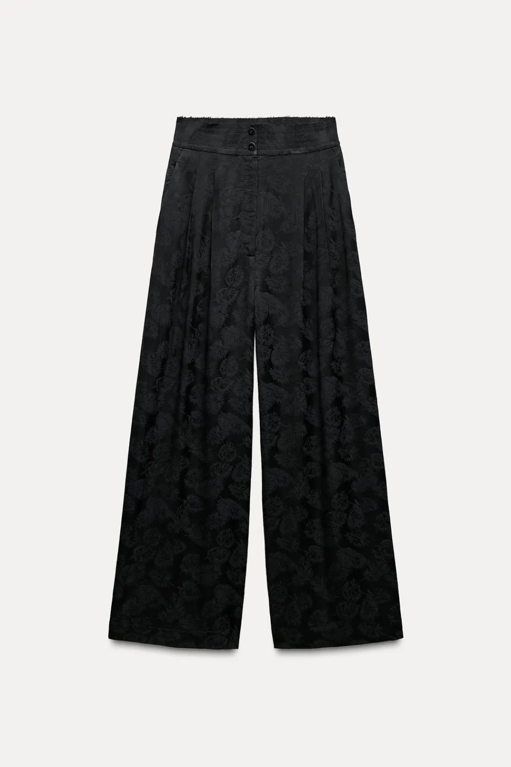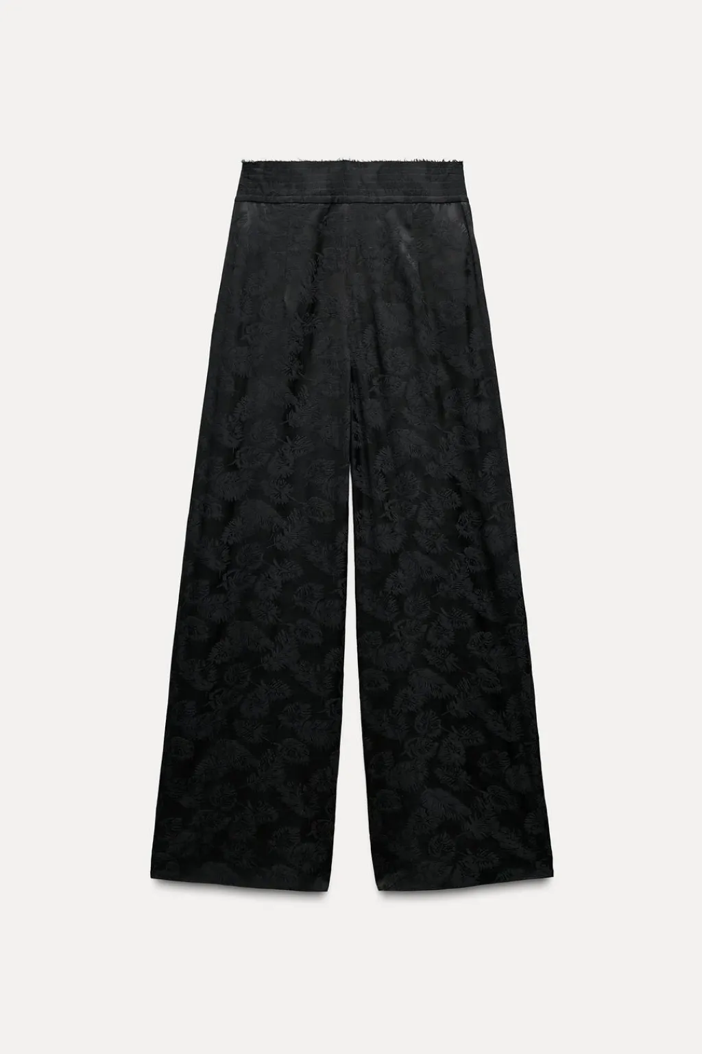 Pantalón de tiro medio y cintura deshilachada. Detalle de tejido en jacquard floral. Pinzas en delantero. Pierna ancha. Cierre frontal con cremallera y botones.