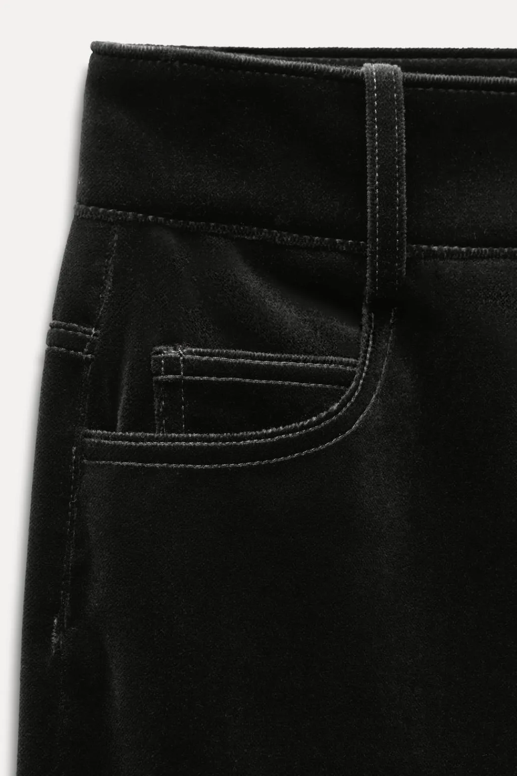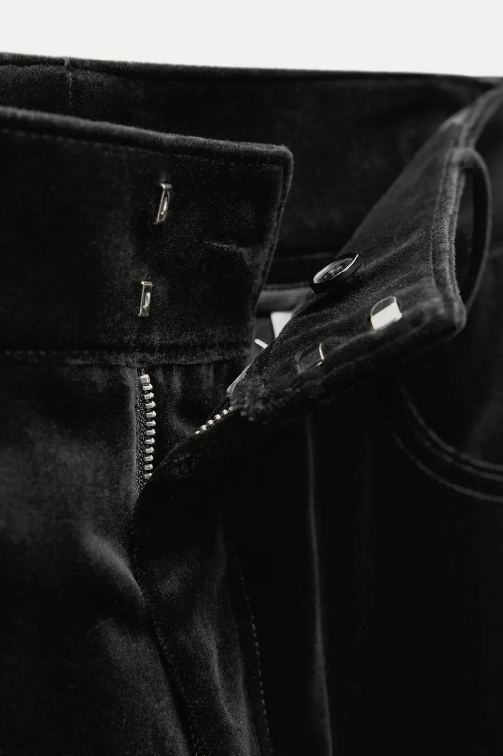 Pantalón confeccionado en tejido de terciopelo. Tiro medio y cintura con trabillas. Cinco bolsillos. Pierna recta. Cierre frontal con cremallera, botón y ganchos metálico.