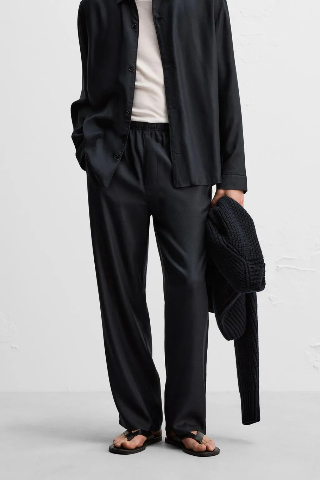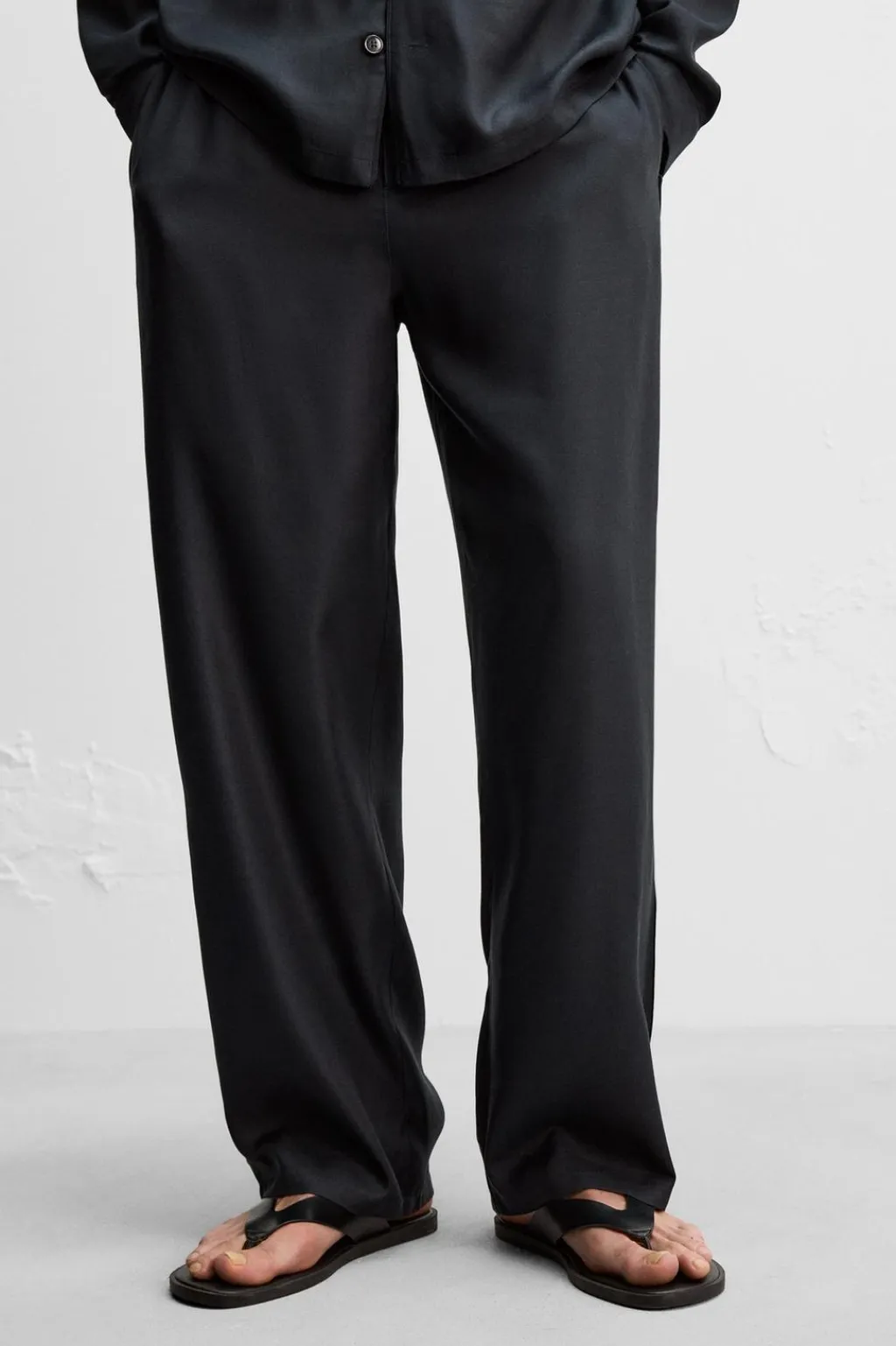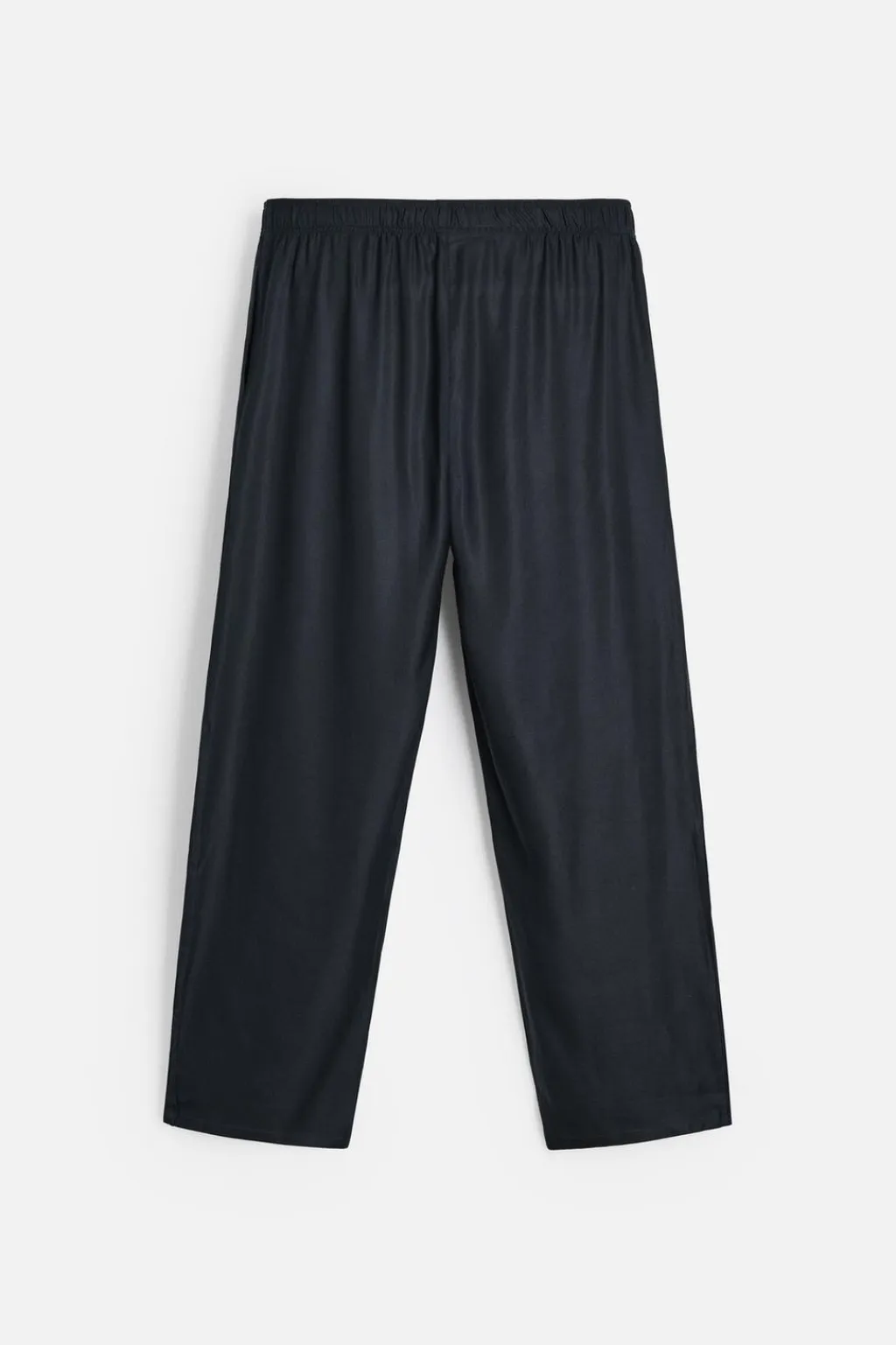 Pantalón relaxed fit confeccionado en tejido ligero de seda con estructura twill. Cintura elástica ajustable con cordón interior. Bolsillos laterales.