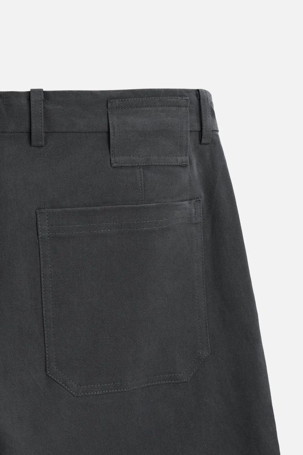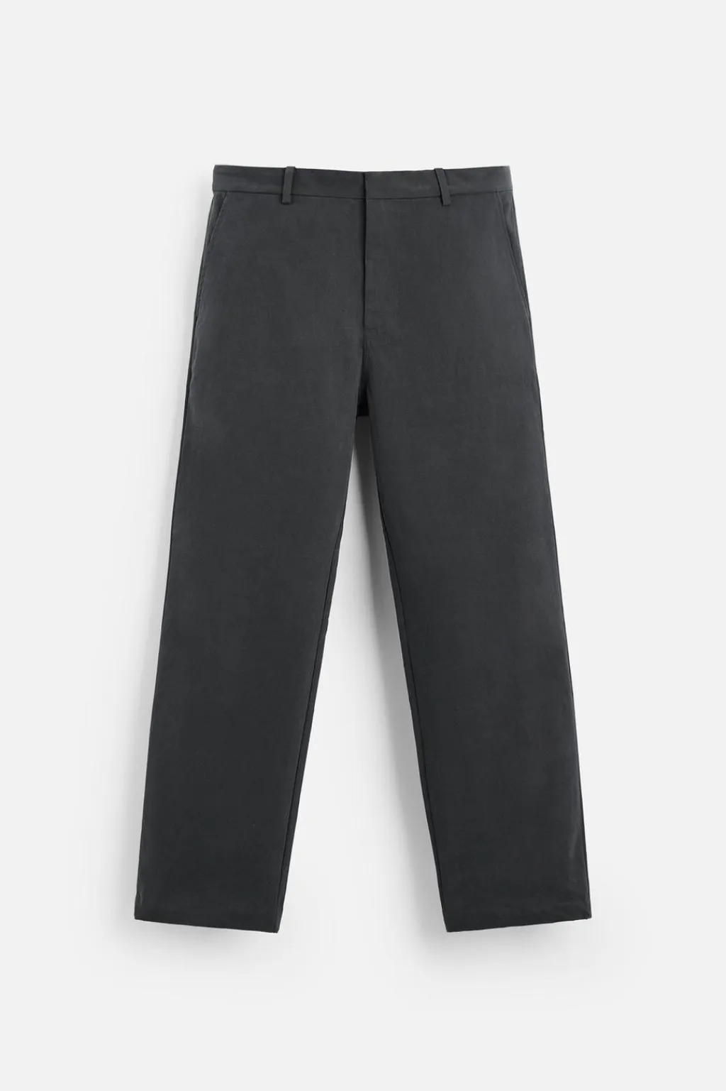 Pantalón straight fit confeccionado en tejido con tacto suave. Bolsillos frontales y detalle de bolsillos traseros de plastrón. Cierre frontal con cremallera y botón.