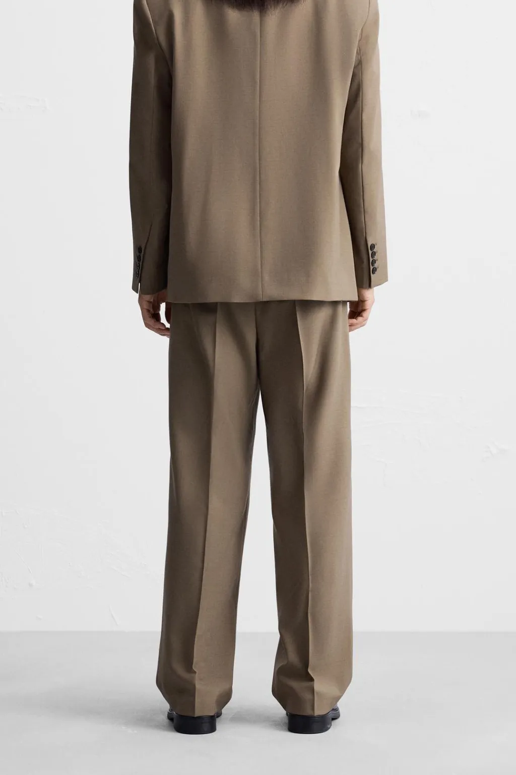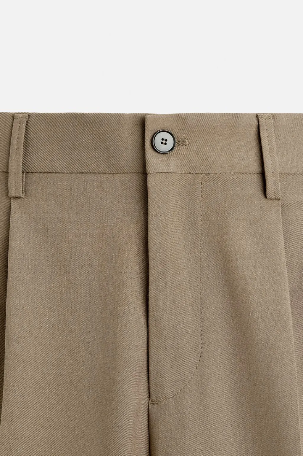 Pantalón straight fit confeccionado en tejido con lana. Cintura con detalle de pliegues en delantero. Bolsillos frontales y detalle de bolsillos traseros de vivo. Cierre frontal con cremallera y botón.