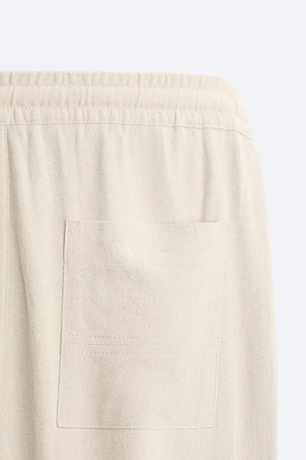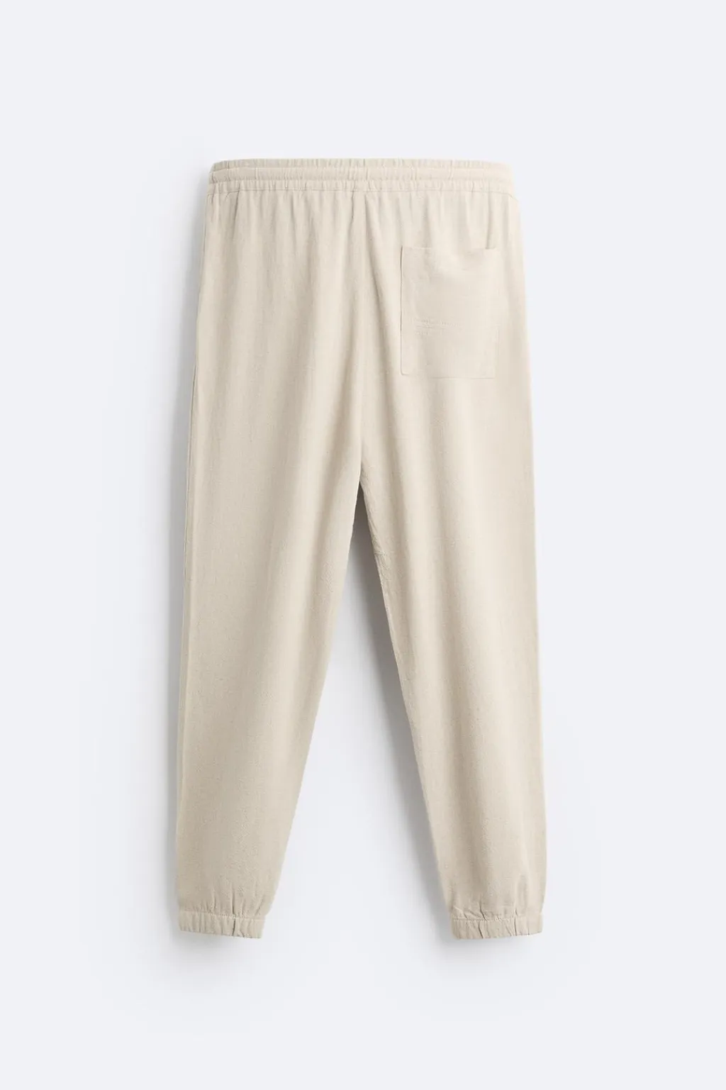 Pantalón confeccionado en tejido con mezcla de viscosa y lino. Cintura elástica ajustable con cordón. Bolsillos delanteros y detalle de bolsillo trasero de plastrón. Bajo acabado en puño con elástico.