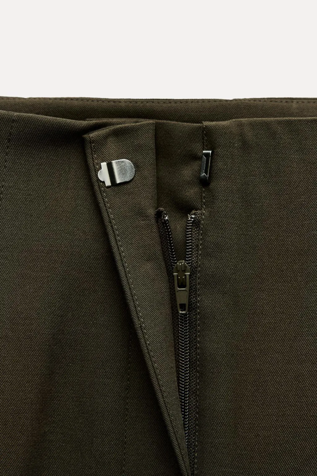 Pantalón de tiro alto con pinzas. Bolsillos laterales ocultos en costura y falsos bolsillos de vivo con botón en espalda. Cierre frontal con cremallera, botón interior y gancho metálico.