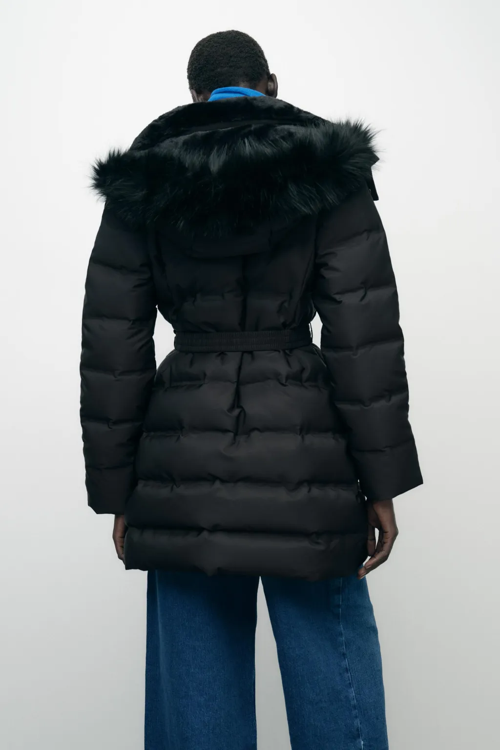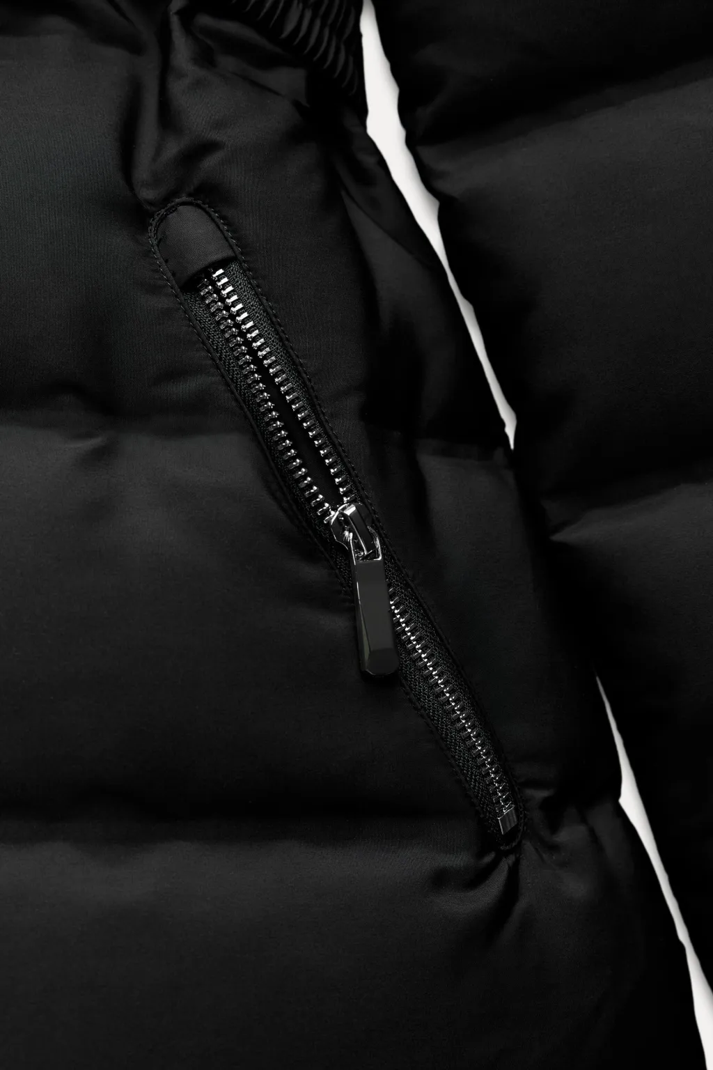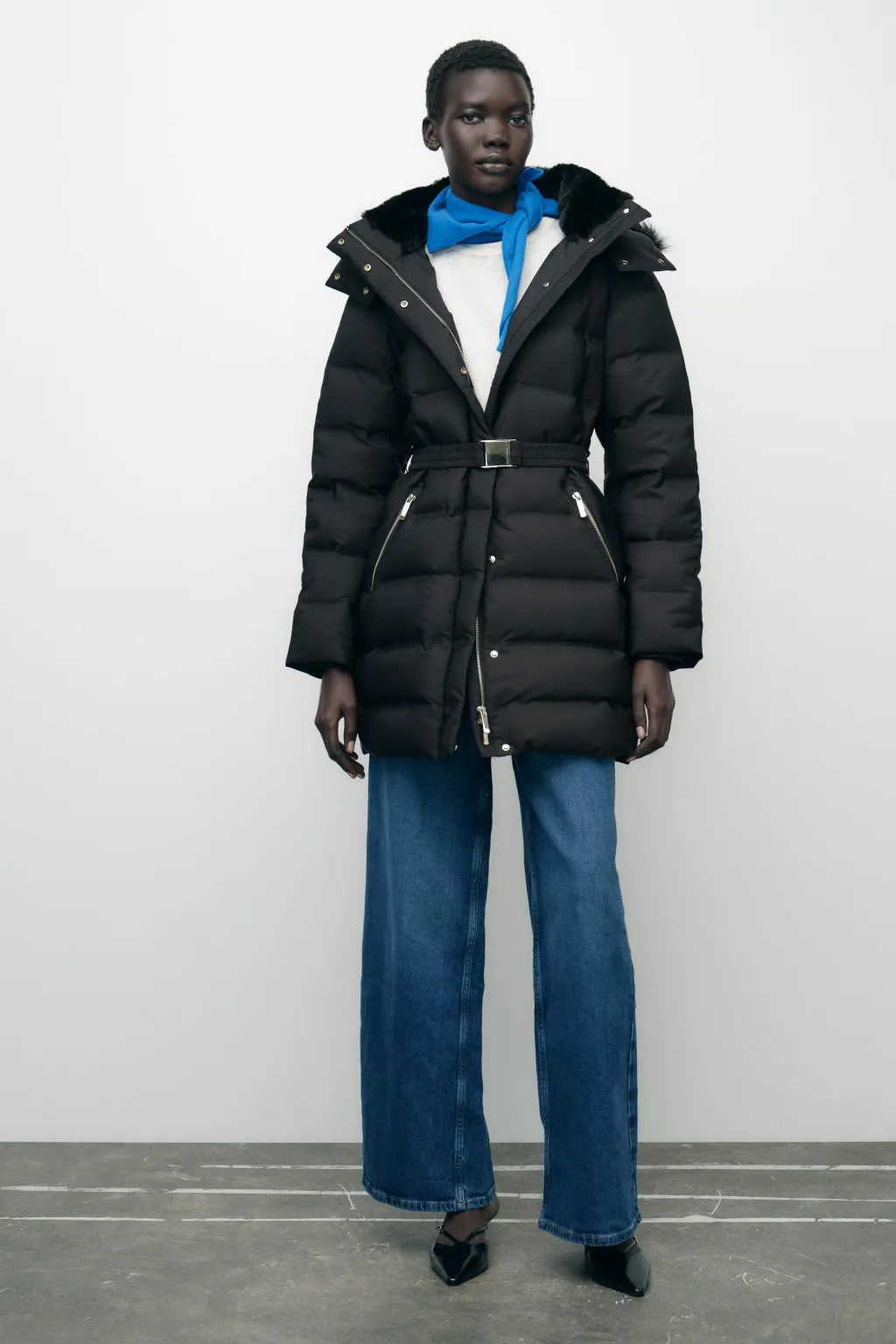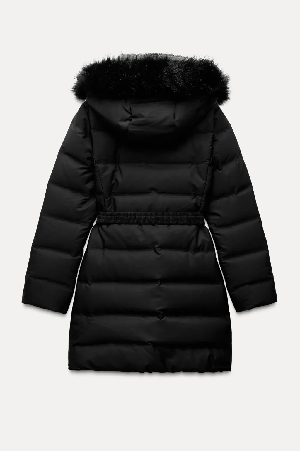 Plumífero semilargo resistente al agua y al viento, con aislamiento térmico para climas fríos. Comodidad dentro del rango de temperaturas específicas para baja actividad (6º) y actividad moderada (-24ºC). Cuello subido con capucha con interior efecto pelo desmontable y cordones elásticos. Bolsillos delanteros con forro polar interior y cierre de cremallera. Cierre frontal con cremallera y botones a presión ocultos. Cinturón elástico a tono.