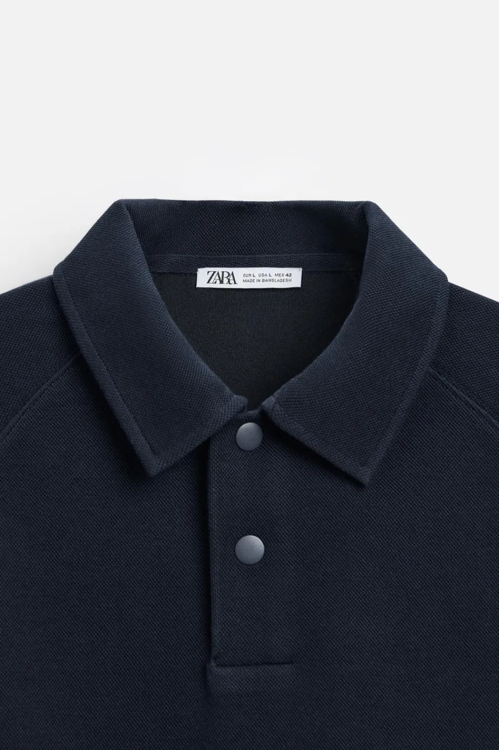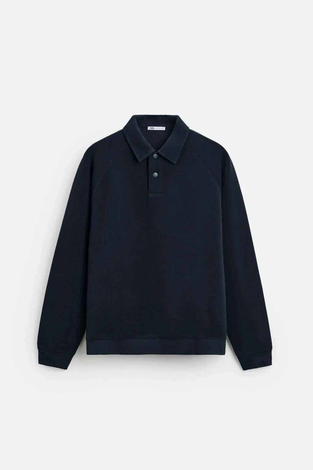 Polo relaxed fit confeccionada en tejido de algodón con elasticidad. Cuello solapa con cierre frontal de botones a presión. Manga larga. Acabados en rib.