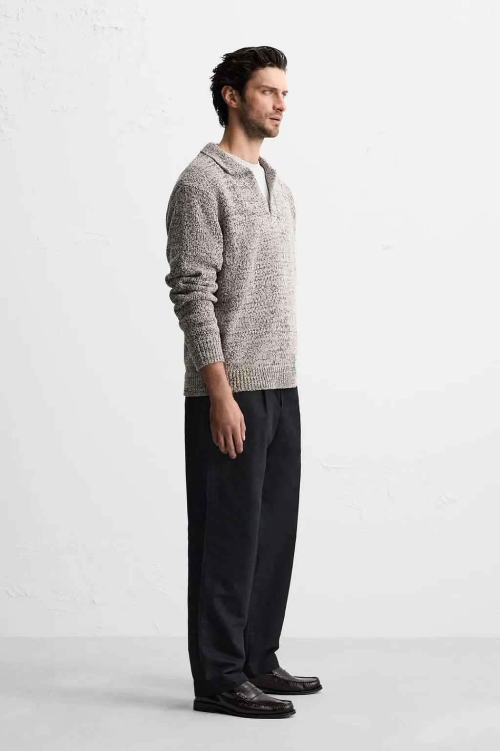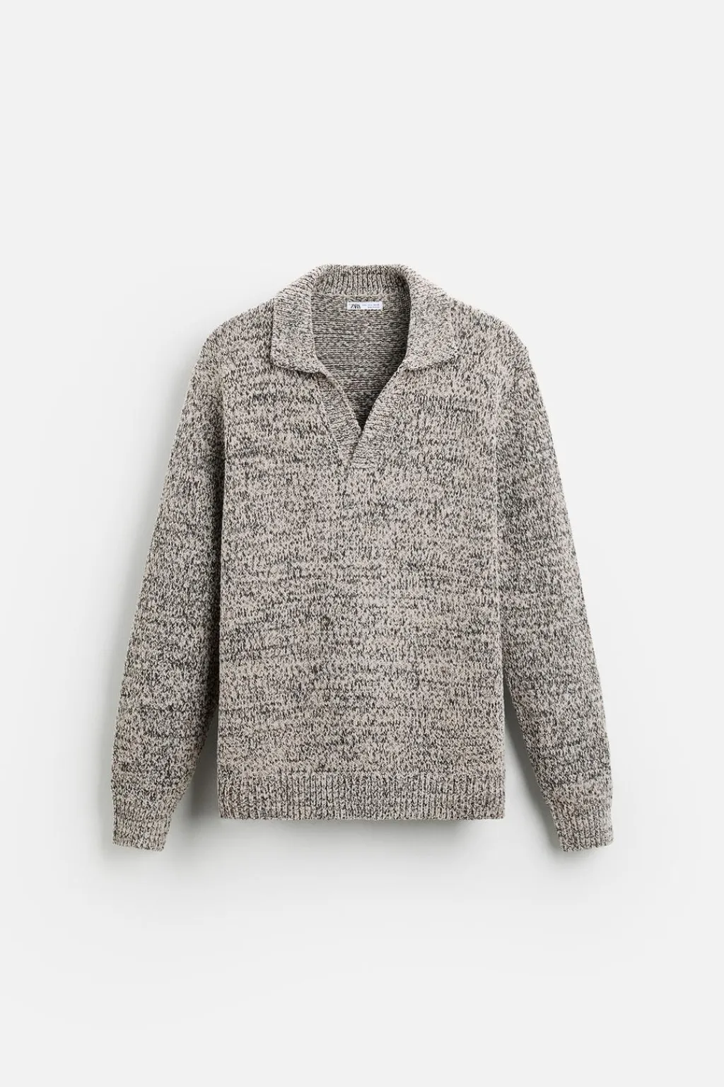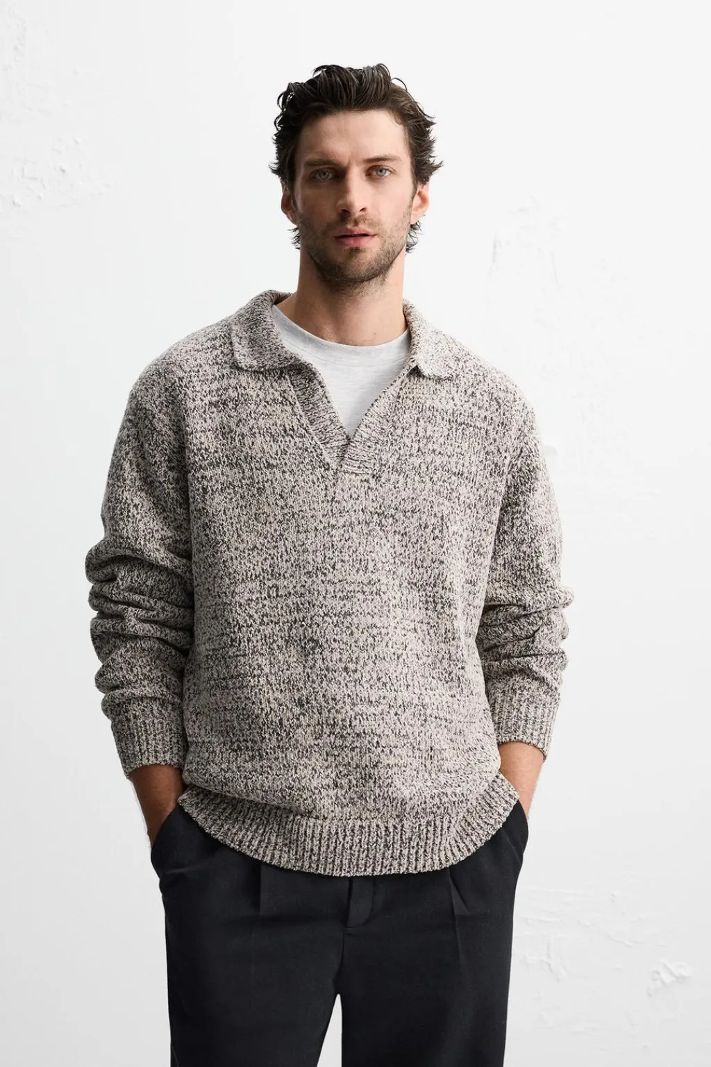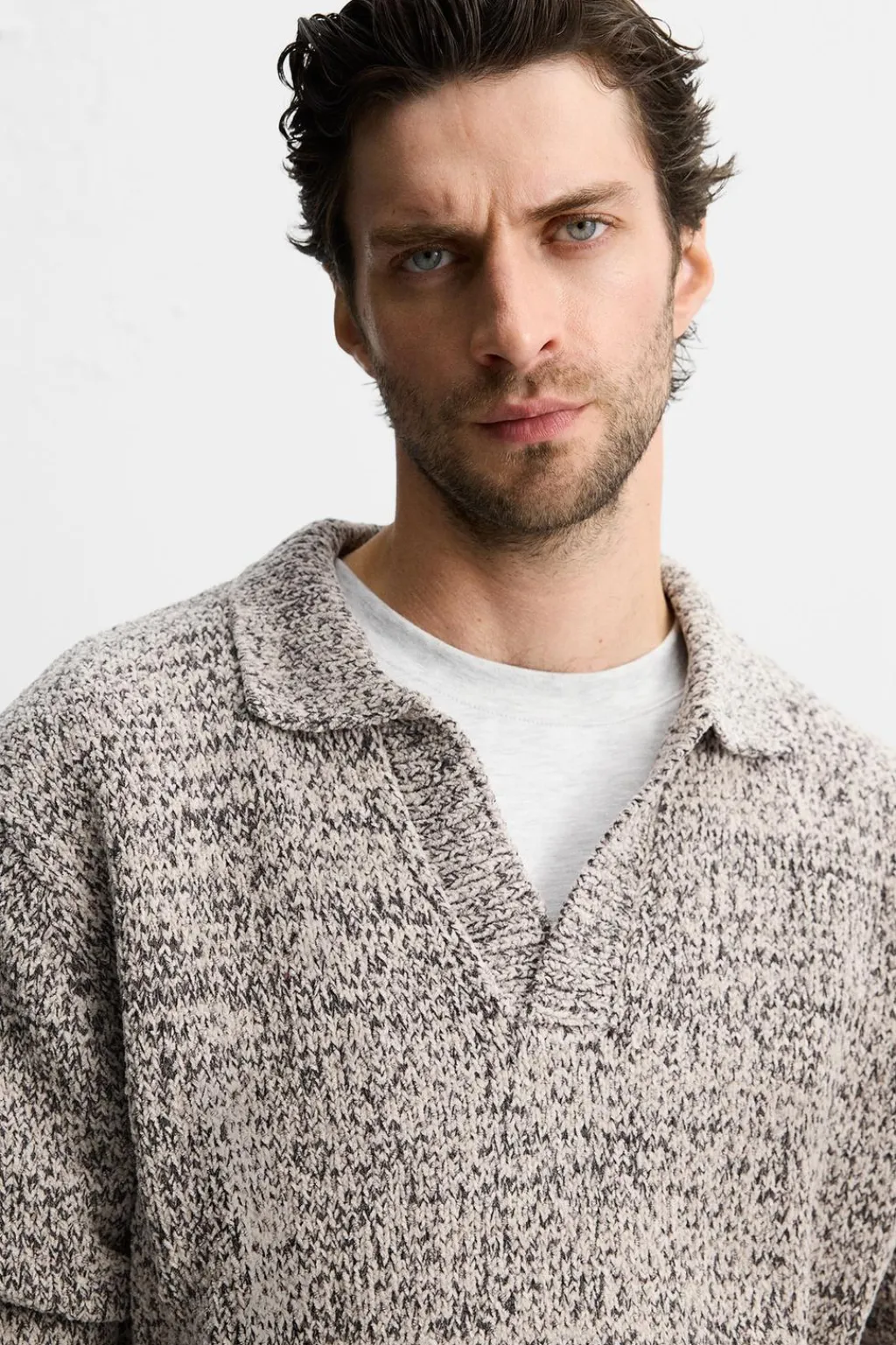 Polo relaxed fit tejido en hilatura con textura chenilla. Cuello solapa con abertura frontal. Manga larga. Acabados en rib.