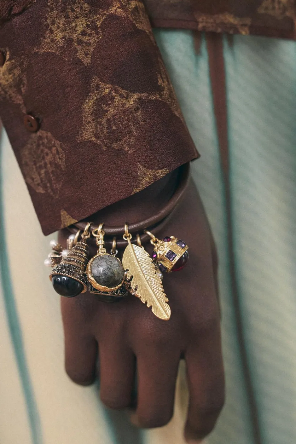 Pulsera de cordón doble con aplicación de charms en diferente formas, tamaños y materiales. Cierre con mosquetón metálico.
