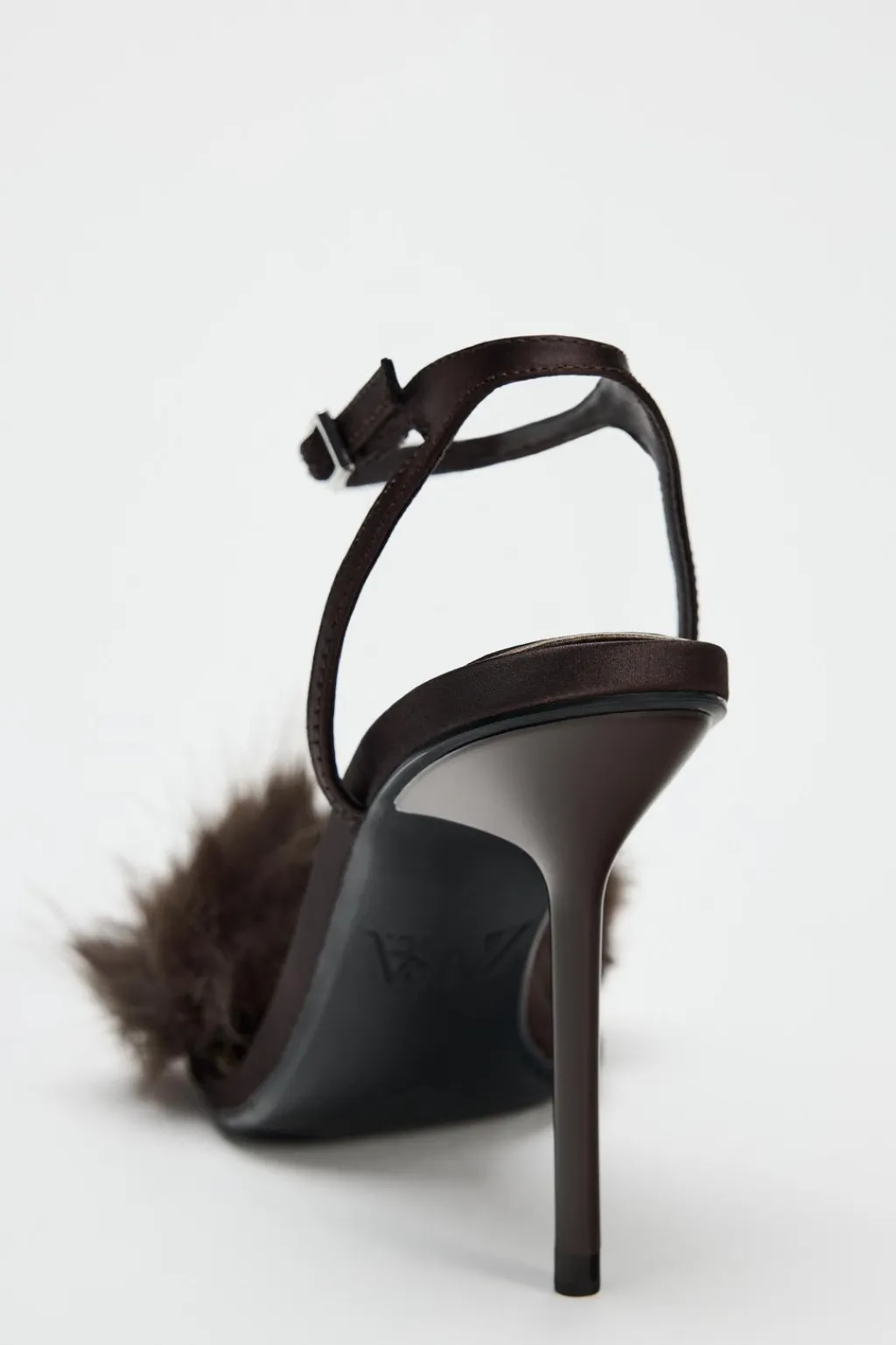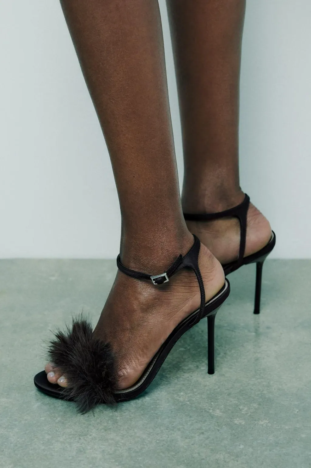 Zapato tipo sandalia con tacón fino. Detalle de pelo en la parte delantera. Cierre mediante hebilla en la pulsera del tobillo.