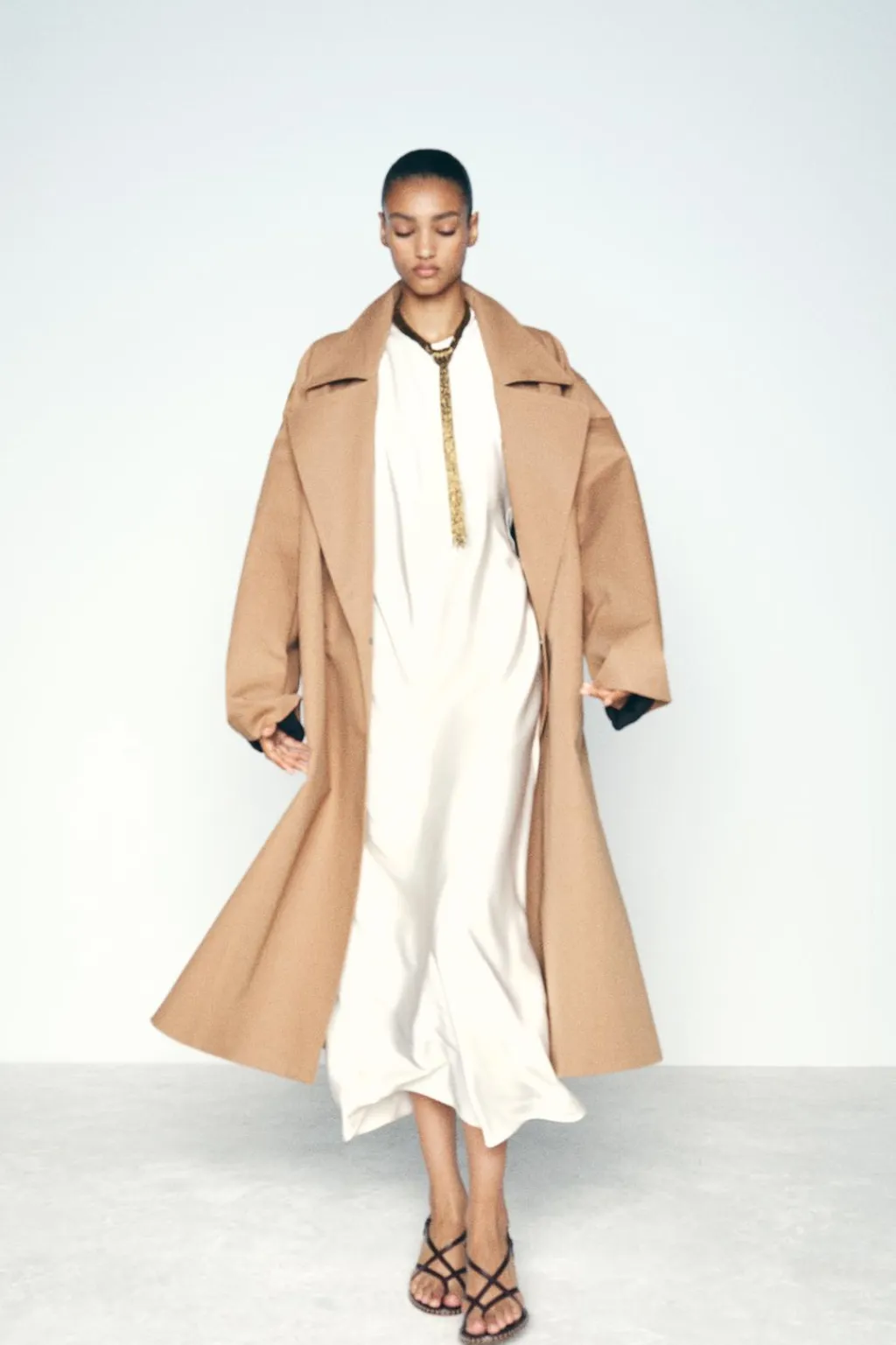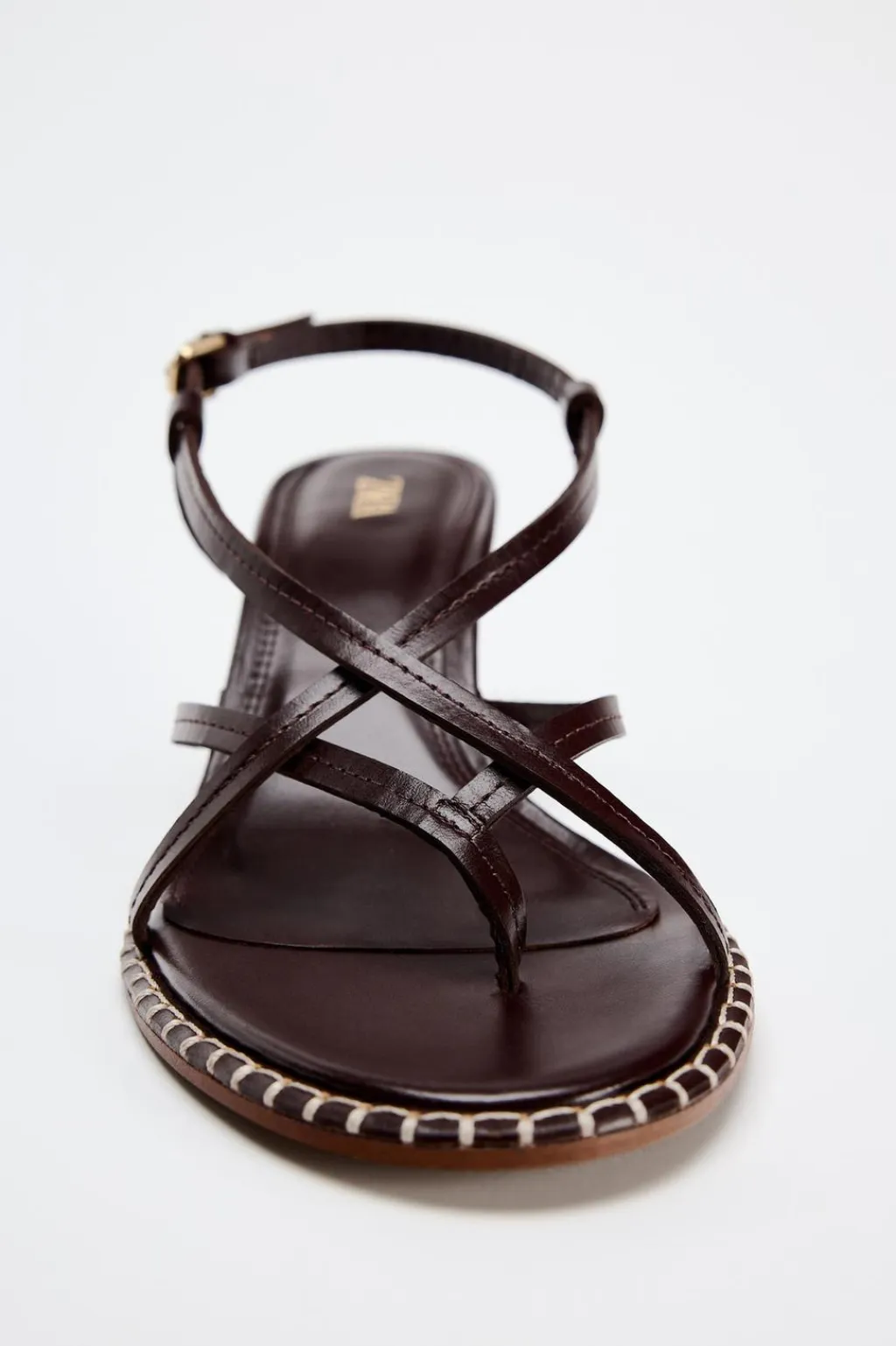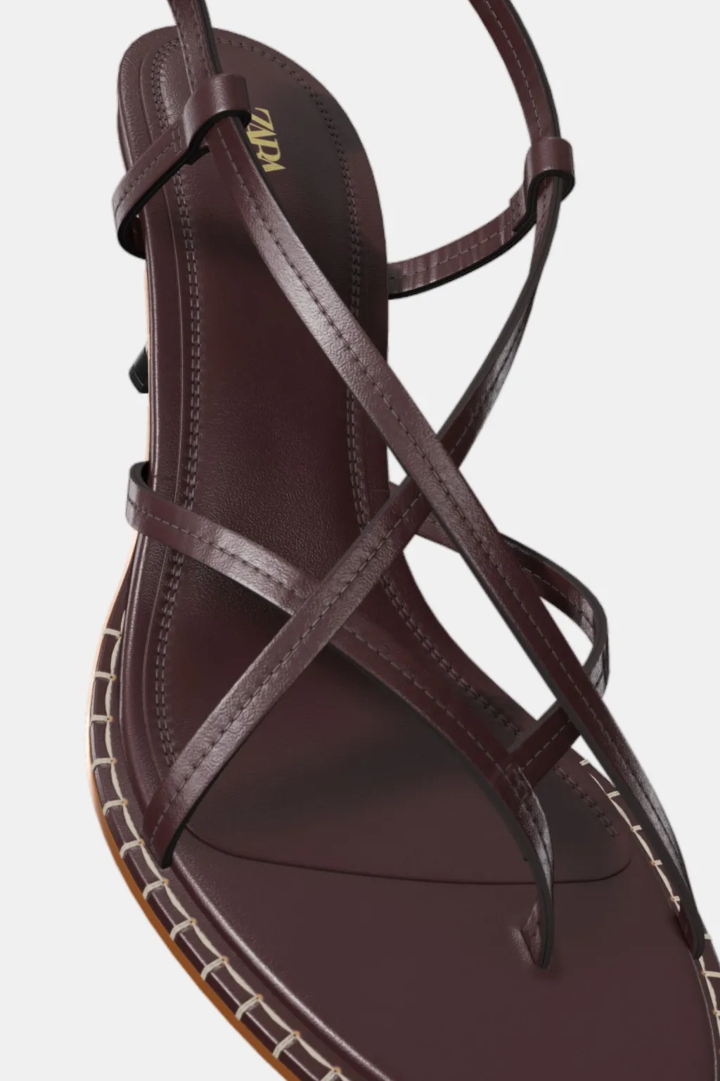 Zapato tacón tipo sandalia en piel. Detalle de tiras finas cruzadas y posición para el dedo. Detalle de pespunte a contraste de color en la suela. Cierre mediante hebilla en el tobillo.