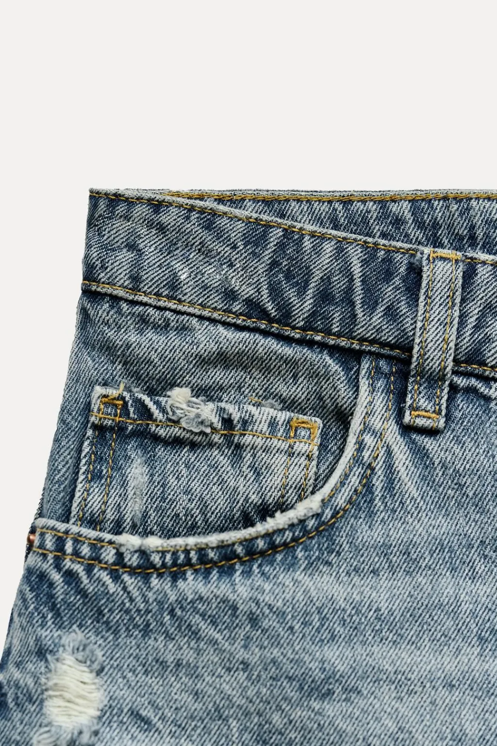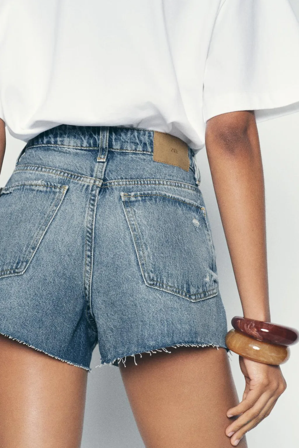 Shorts de tiro alto con cinco bolsillos. Efecto lavado. Detalle de rotos y bajo sin costura. Cierre frontal con cremallera y botón.