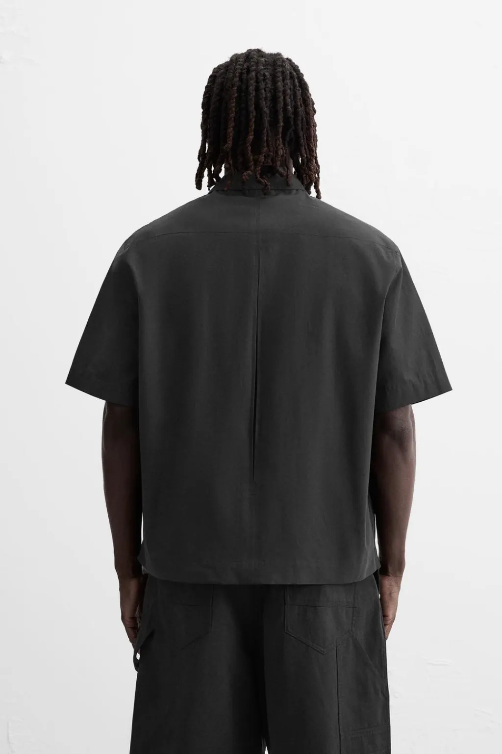 Sobrecamisa relaxed fit confeccionada en tejido con mezcla de algodón. Cuello solapa y manga corta. Bolsillos plastrón en delantero. Cierre frontal de botonadura.