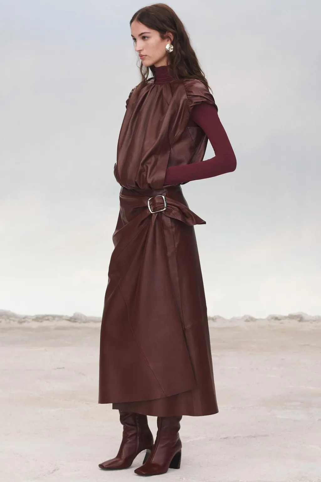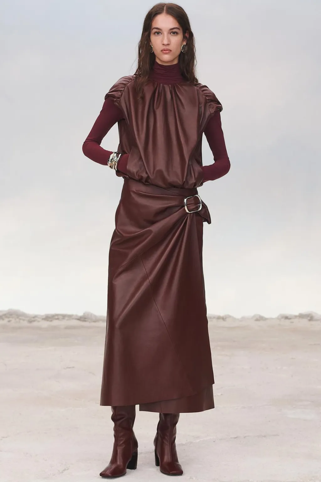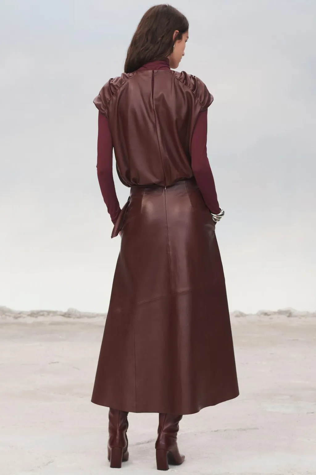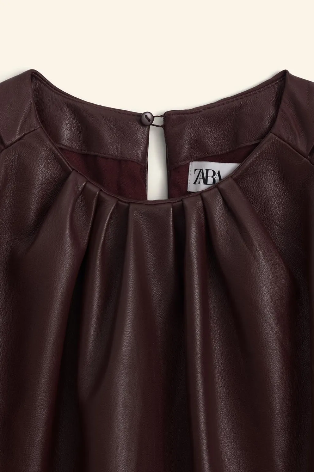 Top realizado en piel 100%. Cuello redondo y manga corta. Detalle de frunces. Bajo abullonado. Cierre en espalda con cremallera oculta en costura, abertura y botón.
