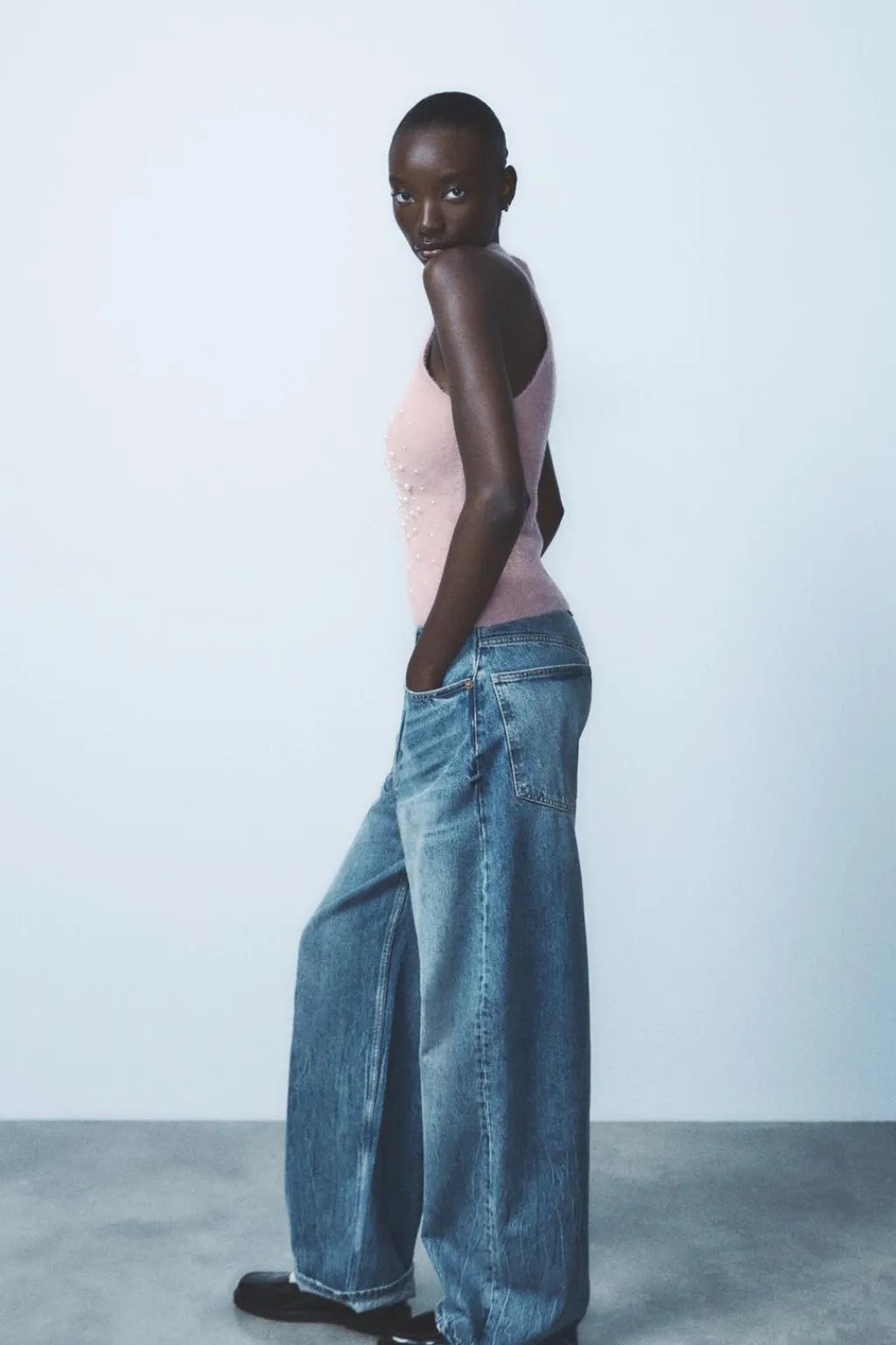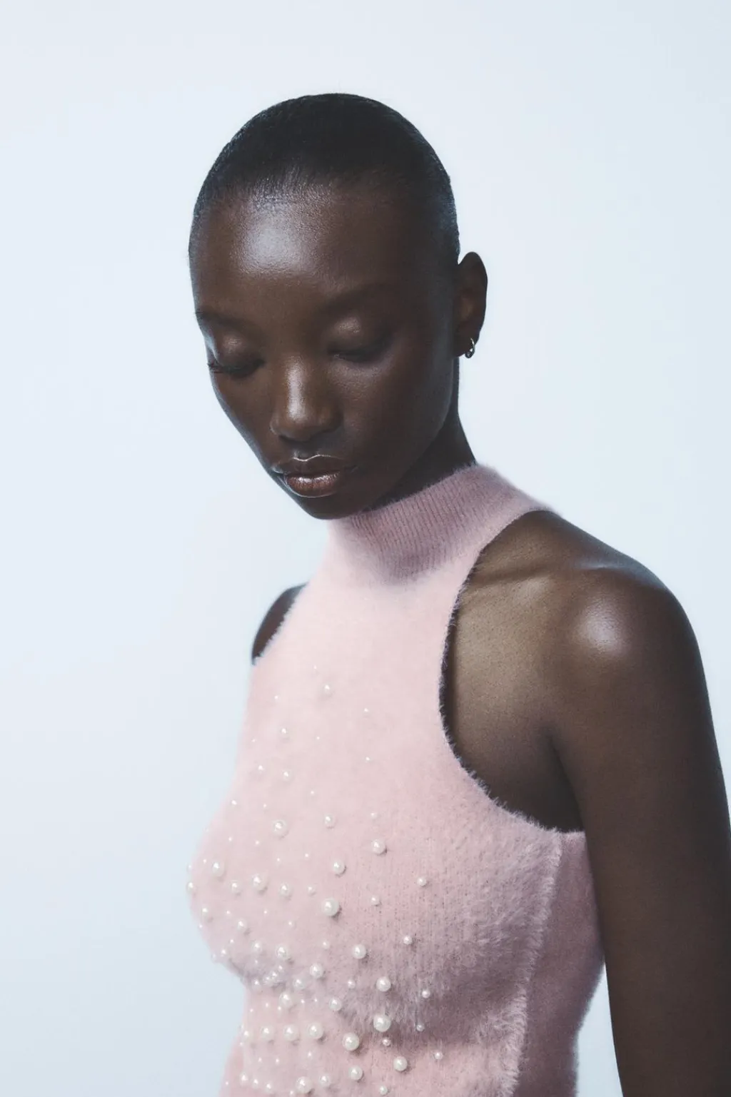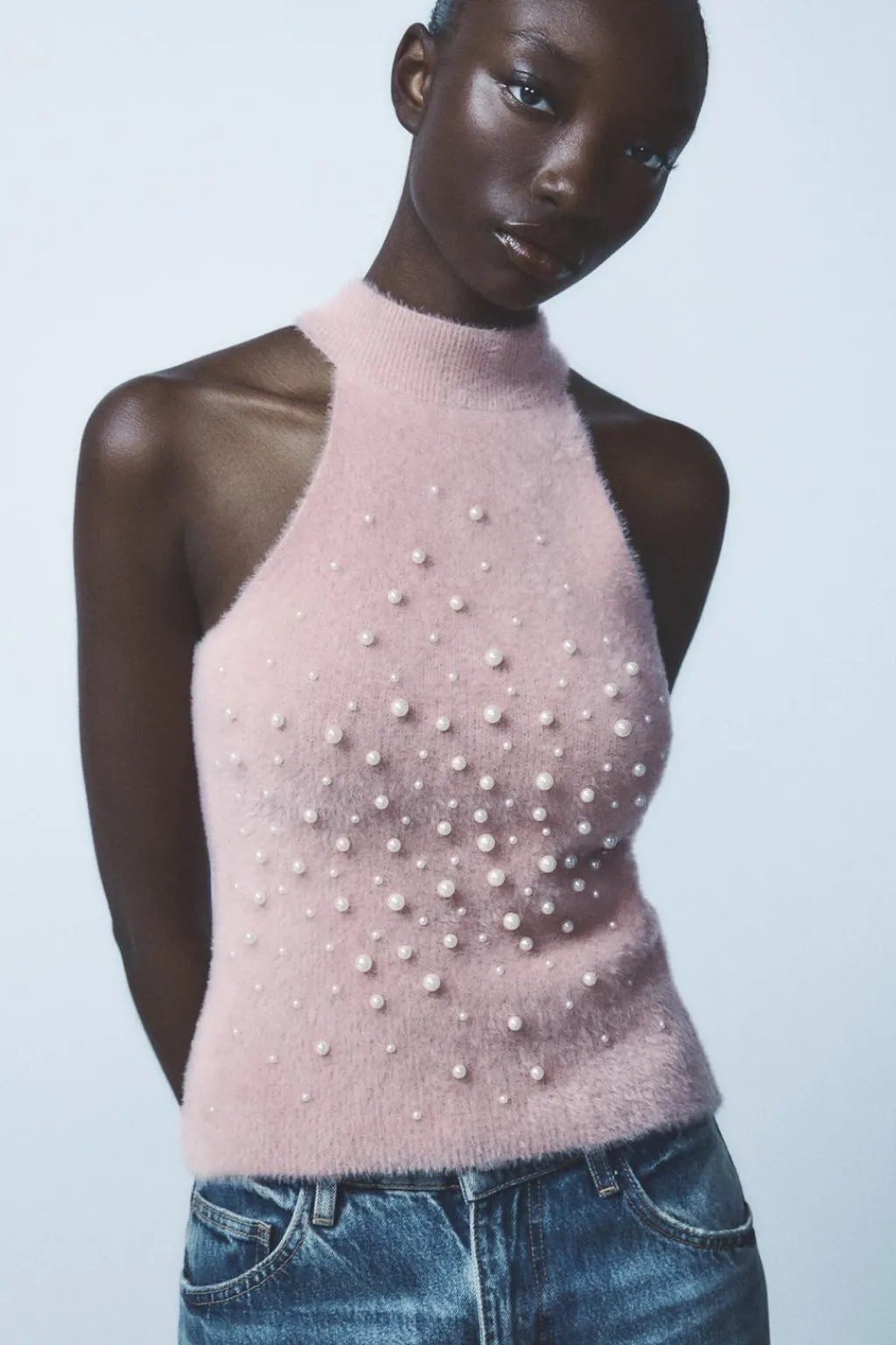 Top de cuello halter. Tejido tacto suave. Detalle aplicación de perlas combinadas a contraste.
