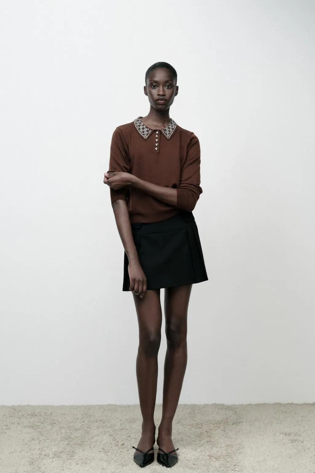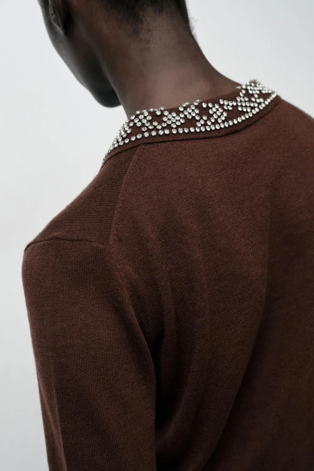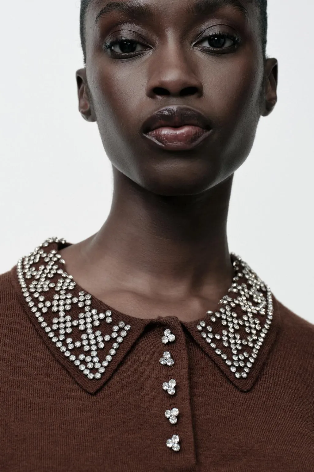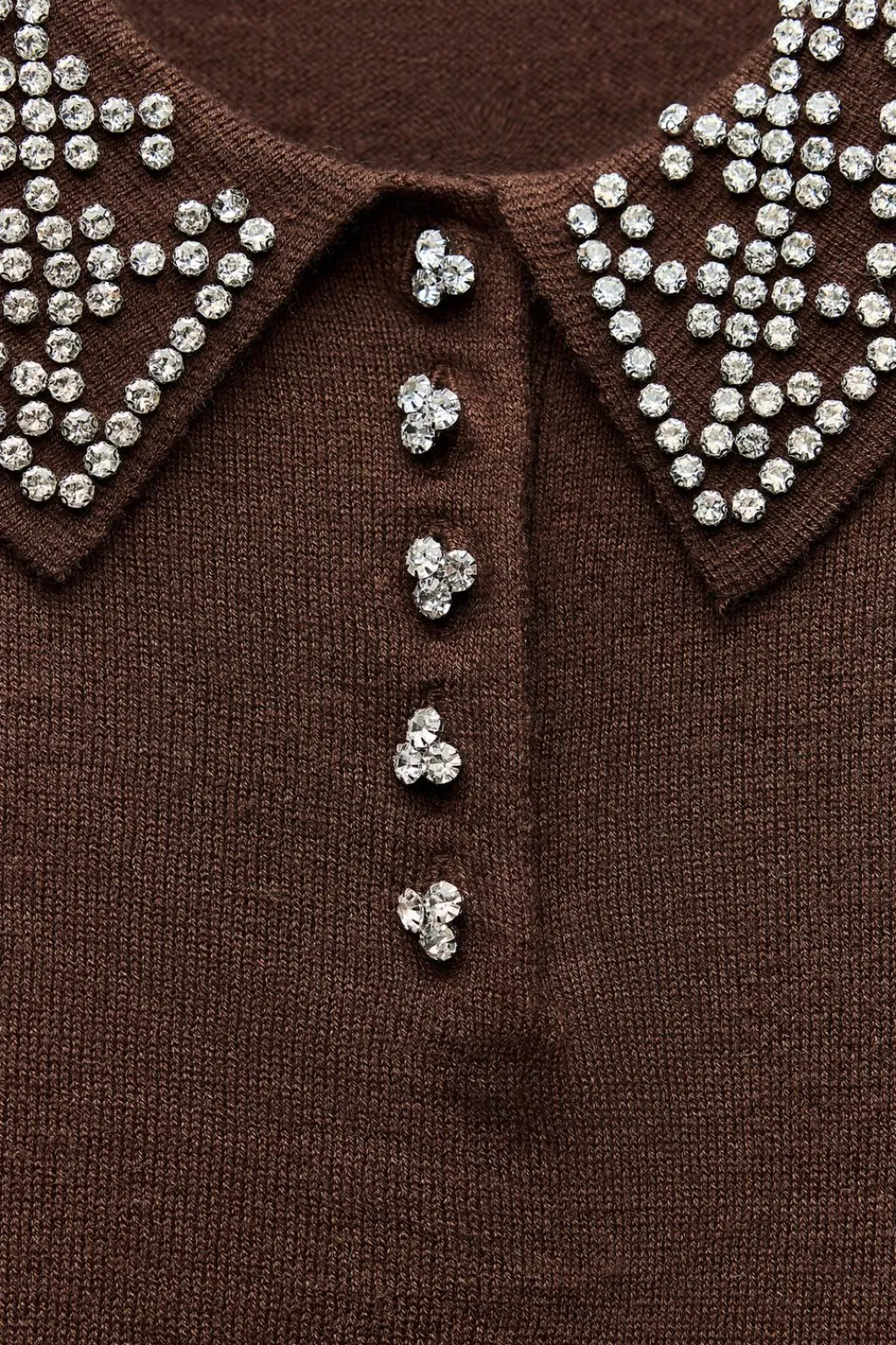 Top de cuello polo con abalorios joya y manga larga. Botones delanteros joya.