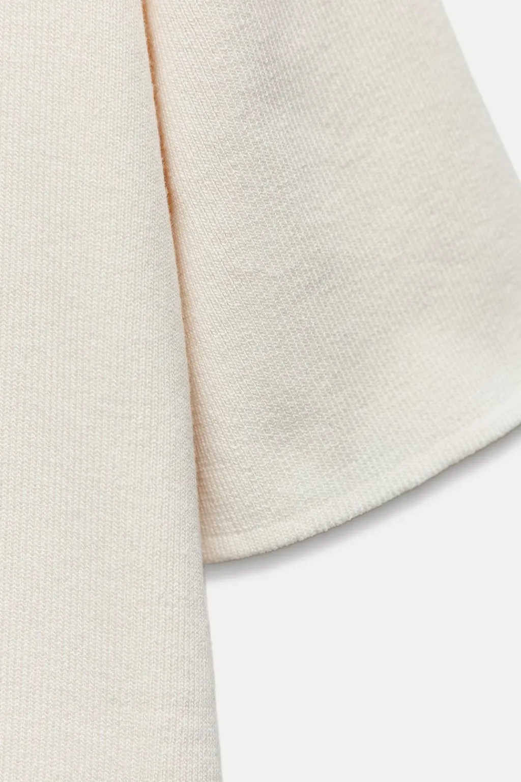 Top amplio de cuello redondo y manga corta. Bajo acabado en aberturas laterales.