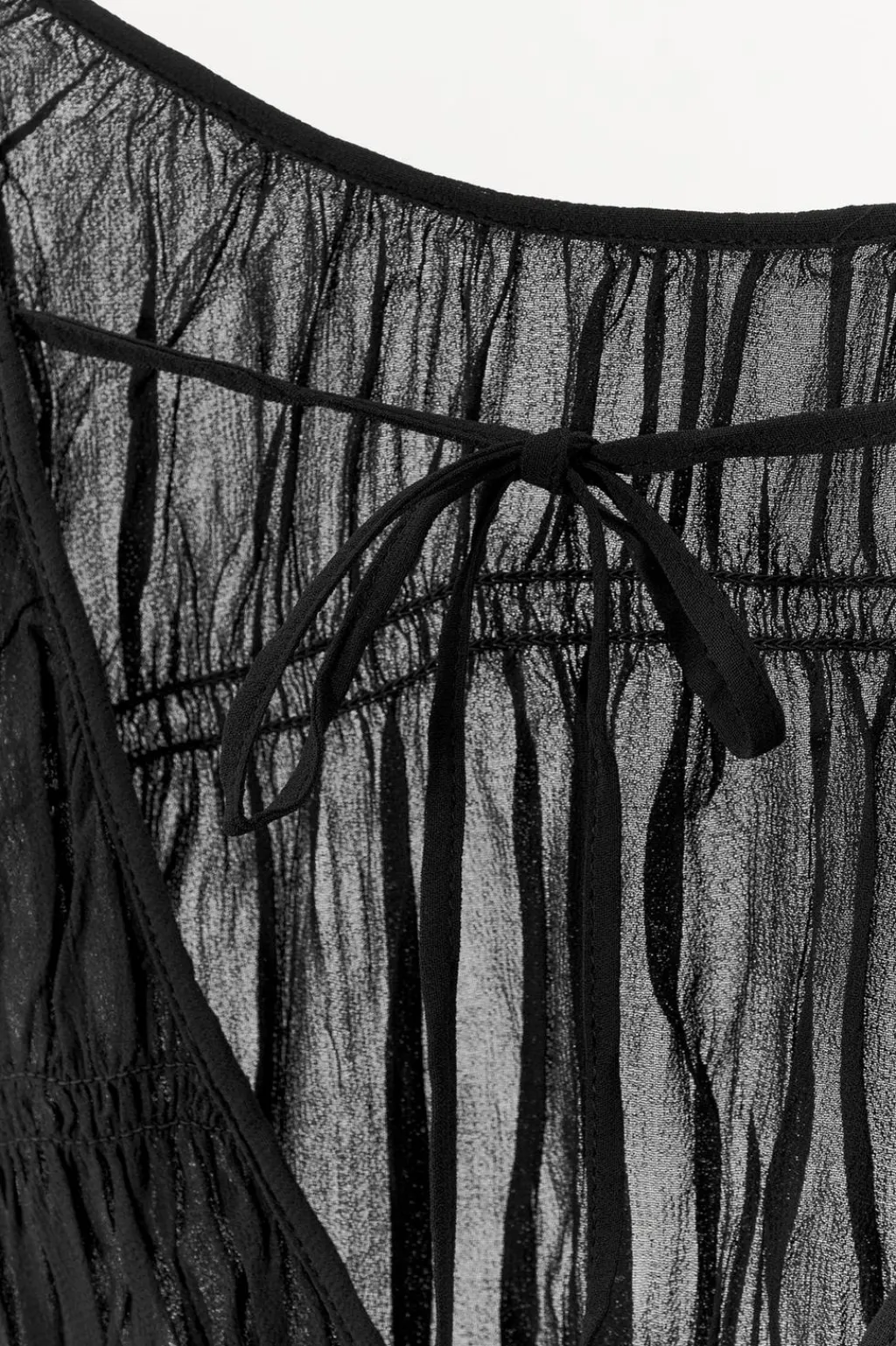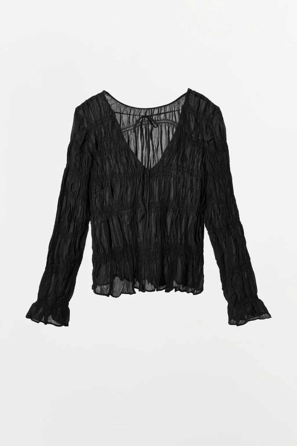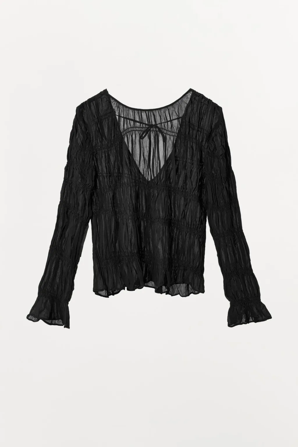 Top semitransparente confeccionado en hilatura de viscosa 100%. Cuello redondo y manga larga. Detalle de frunces. Acabados en volantes. Cierre en espalda con abertura y lazada.